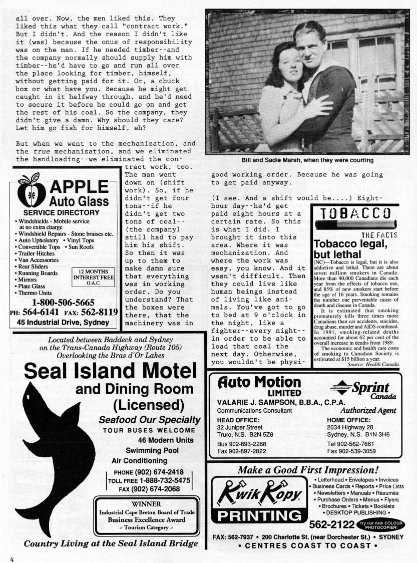 Published by Ronald Caplan on 1997/6/1 (338 reads)all over. Now, the men liked this. They liked this what they call "contract work." But I didn't. And the reason I didn't like it (was) because the onus of responsibility was on the man. If he needed timber--and the company normally should supply him with timber--he'd have to go and run all over the place looking for timber, himself, without getting paid for it. Or, a chuck box or what have you. Because he might get caught in it halfway through, and he'd need to secure it before he could go on and get the rest of his coal. So the company, they didn't give a damn. Why should they care? Let him go fish for himself, eh? But when we went to the mechanization, and the true mechanization, and we eliminated the handloading--we eliminated the con- 1 tract work, too. The man went down on (shift work). So, if he didn't get four tons--if he didn't get two tons of coal-- (the company) still had to pay him his shift. So then it was up to them to make damn sure that everything was in working order. Do you understand? That the boxes were there, that the machinery was in APPLE Auto Glass SERVICE DIRECTORY • Windshields - Mobile service at no extra charge • Windshield Repairs - Stone bruises etc. • Auto Upholstery • Vinyl Tops • Convertible Tops 'Sun Roofs • Trailer Hitches • Van Accessories • Rear Sliders • Running Boards • Mirrors • Plate Glass • Thermo Units 1-800-506-5665 |pH: 564-6141 FAX: 562-8115 45 Industrial Drive, Sydney 12 MONTHS INTEREST FREE I O.A.C. Located between Baddeck and Sydney on the Trans-Canada Highway (Route 105) Overlooking the Bras d'Or Lakes Seal Island Motel ' and Dining Room '''' (Licensed) '''??'B Seafood Our Specialty 7 TOUR BUSES WELCOME 46 Modern Units Swimming Pool Air Conditioning PHONE (902) 674-2418 TOLL FREE 1-888-732-5475 FAX (902) 674-2068 WINNER Industnal Cape Breton Board of Trade Business Excellence Award " Tourism Category ' BIN and Sadie Marsh, when they were courting good working order. Because he was going to get paid anyway. (I see. And a shift would be....) Eight- Country Living at the Seal Island Bridge hour day--he'd get paid eight hours at a certain rate. So this is what I did. I brought it into this area. Where it was mechanization. And where the work was easy, you know. And it wasn't difficult. Then they could live like human beings instead of living like ani? mals. You've got to go to bed at 9 o'clock in the night, like a fighter--every night-- in order to be able to load that coal the next day. Otherwise, you wouldn't be physi- TOBACCO THE FACTS Tobacco legal, but lethal (NC) • Tobacco is legal, but it is also addictive and lethal. There are about seven million smokers in Canada. More than 40,000 Canadians die each year from the effects of tobacco use, and 85% of new smokers start before the age of 16 years. Smoking remains the number one preventable cause of death and disease in Canada. t is estimated that smoking prematurely kills three times more Canadians than car accidents, suicides, drug abuse, murder and AIDS combined. In 1991, smoking-related deaths accounted for about 62 per cent of the overall increase in deaths from 1989. The economic and health care costs of smoking to Canadian Society is estimated at $15 billion a year. Source: Health Canada fiato Motion LIMITED VALARIE J. SAMPSON, B.B.A., Communications Consultant HEAD OFFICE: 32 Juniper Street Truro. N.S. B2N 5Z8 Bus 902-893-2288 Fax 902-897-2822 'Sprint Canada C.P.A. Authorized Agent HOME OFFICE: 2034 Highway 28 Sydney, N.S. B1N3H6 Tel 902-562-7661 Fax 902-539-3059 Make a Good First Impression! • Letterhead • Envelopes • Invoices ! • Business Cards • Reports • Price Lists • Newsletters • Manuals • Resumes • Purchase Orders • Menus • Flyers • Brochures • Tickets • Booklets • DESKTOP PUBLISHING- PRINTING 562-2122 < FAX: 562-7937 • 200 Charlotte St. (near Dorchester St.) • SYDNEY • CENTRES COAST TO COAST •