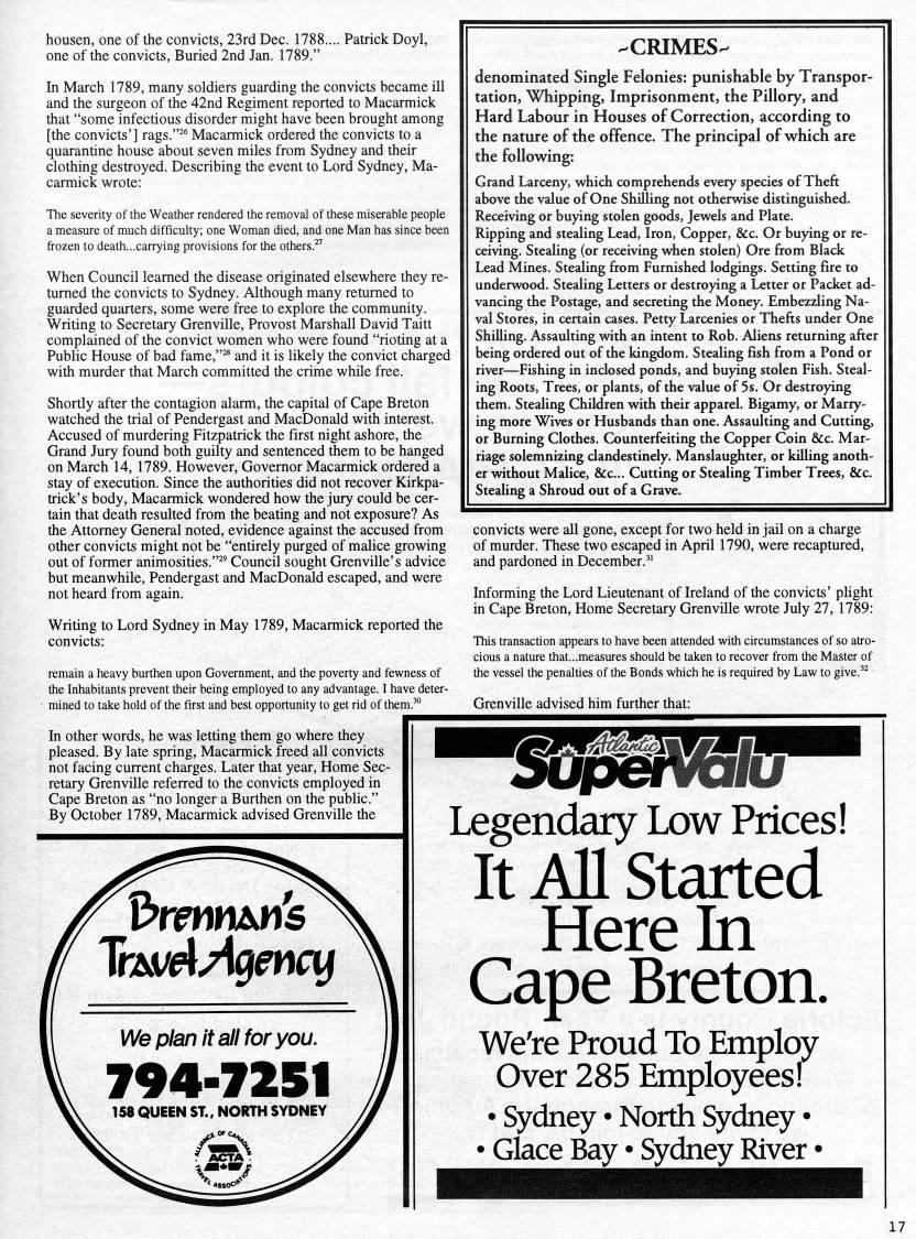 housen, one of the convicts, 23rd Dec. 1788.... Patrick Doyl, one of the convicts. Buried 2nd Jan. 1789." In March 1789, many soldiers guarding the convicts became ill and the surgeon of the 42nd Regiment reported to Macarmick that "some infectious disorder might have been brought among [the convicts'] rags."'' Macarmick ordered the convicts to a quarantine house about seven miles from Sydney and their clothing destroyed. Describing the event to Lord Sydney, Ma? carmick wrote: The severity of the Weather rendered the removal of these miserable people a measure of much difficulty; one Woman died, and one Man has since been frozen to death...carrying provisions for the others.'' When Council learned the disease originated elsewhere they re? turned the convicts to Sydney. Although many returned to guarded quarters, some were free to explore the community. Writing to Secretary Grenville, Provost Marshall David Taitt complained of the convict women who were found "rioting at a Public House of bad fame,"' and it is likely the convict charged with murder that March committed the crime while free. Shortly after the contagion alarm, the capital of Cape Breton watched the trial of Pendergast and MacDonald with interest. Accused of murdering Fitzpatrick the first night ashore, the Grand Jury found both guilty and sentenced them to be hanged on March 14, 1789. However, Governor Macarmick ordered a stay of execution. Since the authorities did not recover Kirkpa? trick's body, Macarmick wondered how the jury could be cer? tain that death resulted from the beating and not exposure? As the Attorney General noted, evidence against the accused from other convicts might not be "entirely purged of malice growing out of former animosities."'' Council sought Grenville's advice but meanwhile, Pendergast and MacDonald escaped, and were not heard from again. Writing to Lord Sydney in May 1789, Macarmick reported the convicts: remain a heavy burthen upon Government, and the poverty and fewness of the Inhabitants prevent their being employed to any advantage. I have deter? mined to take hold of the first and best opportunity to get rid of them.'? -CRIMES- denominated Single Felonies: punishable by Transpor? tation, Whipping, Imprisonment, the Pillory, and Hard Labour in Houses of Correction, according to the nature of the offence. The principal of which are the foUow'ing: Grand Larceny, which comprehends every species of Theft above the value of One Shilling not otherwise distinguished. Receiving or buying stolen goods, Jewels and Plate. Ripping and stealing Lead, Iron, Copper, &c.; Or buying or re? ceiving. Stealing (or receiving when stolen) Ore from Black Lead Mines. Stealing from Furnished lodgings. Setting fire to underwood. Stealing Letters or destroying a Letter or Packet ad? vancing the Postage, and secreting the Money. Embezzling Na? val Stores, in certain cases. Petty Larcenies or Thefts under One Shilling, Assaulting with an intent to Rob. Aliens returning after being ordered out of the kingdom. Stealing fish from a Pond or river • Fishing in inclosed ponds, and buying stolen Fish. Steal? ing Roots, Trees, or plants, of the value of 5s. Or destroying them. Stealing Children with their apparel. Bigamy, or Marry? ing more Wives or Husbands than one. Assaulting and Cutting, or Burning Clothes. Counterfeiting the Copper Coin &c.; Mar? riage solemnizing clandestinely. Manslaughter, or killing anoth? er without Malice, &c...; Cutting or Stealing Timber Trees, &c.; Stealing a Shroud out of a Grave. convicts were all gone, except for two held in jail on a charge of murder. These two escaped in April 1790, were recaptured, and pardoned in December.'' Informing the Lord Lieutenant of Ireland of the convicts' plight in Cape Breton, Home Secretary Grenville wrote July 27, 1789: This transaction appears to have been attended with circumstances of so atro? cious a nature that...measures should be taken to recover from the Master of the vessel the penalties of the Bonds which he is required by Law to give.'' Grenville advised him further that: In other words, he was letting them go where they pleased. By late spring, Macarmick freed all convicts not facing current charges. Later that year. Home Sec? retary Grenville referred to the convicts employed in Cape Breton as "no longer a Burthen on the public." By October 1789, Macarmick advised Grenville the We plan it all for you. 794-725I 158 QUEEN ST., NORTH SYDNEY Legendary Low Prices! It All Started Herein Cape Breton. We're Proud To Employ Over 285 Employees! • Sydney • North Sydney Glace Bay * Sydney River