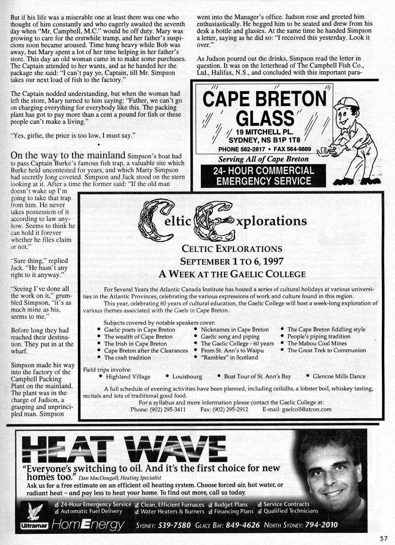 But if his life was a miserable one at least there was one who thought of him constantly and who eagerly awaited the seventh day when "Mr. Campbell, M.C." would be off duty. Mary was growing to care for the erstwhile tramp, and her father's suspi? cions soon became aroused. Time hung heavy while Bob was away, but Mary spent a lot of her time helping in her father's store. This day an old woman came in to make some purchases. The Captain attended to her wants, and as he handed her the package she said: "I can't pay ye. Captain, till Mr. Simpson lakes our next load of fish to the factory." The Captain nodded understanding, but when the woman had left the store, Mary turned to him saying: "Father, we can't go on charging everything for everybody like this. The packing plant has got to pay more than a cent a pound for fish or these people can't make a living." "Yes, girlie, the price is too low, I must say." On the way to the mainland Simpson's boat had to pass Captain Burke's famous fish trap, a valuable site which Burke held uncontested for years, and which Marty Simpson had secretly long coveted. Simpson and Jack stood on the stern looking at it. After a time the former said: "If the old man doesn't wake up I'm going to take that trap from him. He never lakes possession of it according to law any? how. Seems to think he can hold it forever whether he files claim went into the Manager's office. Judson rose and greeted him enthusiastically. He begged him to be seated and drew from his desk a bottie and glasses. At the same time he handed Simpson a letter, saying as he did so: "I received this yesterday. Look it As Judson poured out the drinks, Simpson read the letter in question. It was on the letterhead of The Campbell Fish Co., Ltd., Halifax, N.S., and concluded with this important para- "Surething," replied Jack. "He hasn't any right to it anyway." "Seeing I've done all the work on it," grum? bled Simpson, "it's as much mine as his, seems to me." Before long they had reached their destina? tion. They put in at the wharf. Simpson made his way into the factory of the Campbell Packing Plant on the mainland. The plant was in the charge of Judson, a grasping and unprinci? pled man. Simpson CAPE BRETON GLASS '// // 19 MITCHELL PL. SYDNEY, NS BIP ITS PHONE 562-2817 • FAX 564-9889 Servins All of Cape Breton 24- HOUR COMMERCIAL EMERGENCY SERVICE eltic Wk''' xplorations Celtic Explorations September 1 to 6,1997 A Week at the Gaelic College For Several Years the Atlantic Canada Institute has hosted a series of cultural holidays at various universi? ties in the Atlantic Provinces, celebrating the various expressions of work and culture found in this region. This year, celebrating 60 years of cultural education, the Gaelic College will host a week-long exploration of various themes associated with the Gaels in Cape Breton. Subjects covered by notable speakers cover: Gaelic poets in Cape Breton The wealth of Cape Breton The Irish in Cape Breton Cape Breton after the Clearances The craft tradition • Nicknames in Cape Breton • Gaelic song and piping • The Gaelic College - 60 years • From St. Ann's to Waipu • "Rambles" in Scotland The Cape Breton fiddling style People's piping tradition The Mabou Coal Mines The Great Trek to Communion Field trips involve: • Highland Village Louisbourg • Boat Tour of St. Ann's Bay • Glencoe Mills Dance A full schedule of evening activities have been planned, including ceilidhs, a lobster boil, whiskey tasting, recitals and lots of traditional good food. For a syllabus and more information please contact the Gaelic College at: Phone: (902) 295-3411 Fax: (902) 295-2912 E-mail: [email protected] "Everyone's switching to oil And it's the first choice for new homes too/' Dan MacOougall, Heating specialist Ask us for Q free estimate on an efficient oil heating system. Choose forced air, hot water, or radiant heat - and pay less to heat your home. To find out more, call us today af Automatic Fuel Delivery i' Water Heaters & Burners gf Financing Plans ' Qualified Techn MInIl.MJ HomEnergy Sydney-. 5S9-7580 Clace Bay: 849-4626 North Sydney: 794-2010