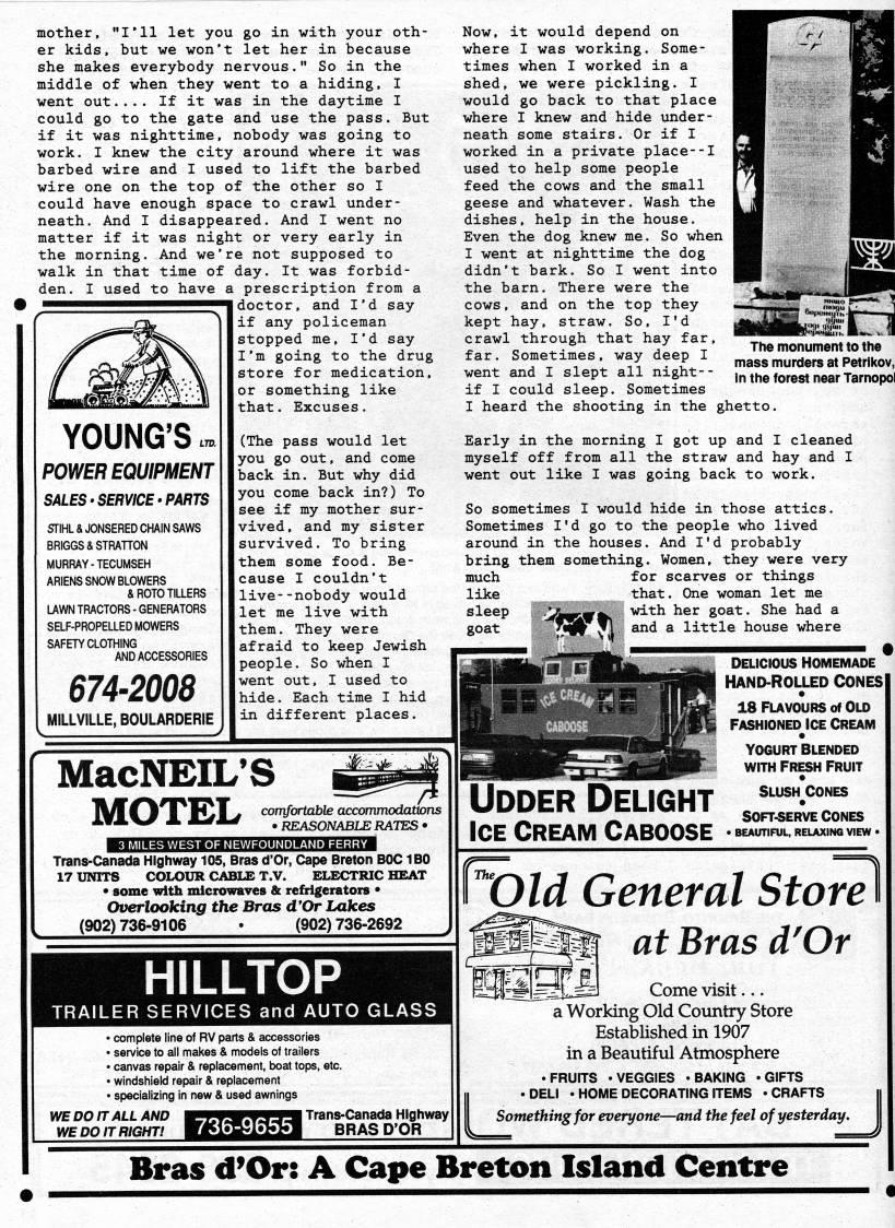 Published by Ronald Caplan on 1997/6/1 (262 reads)mother, "I'll let you go in with your oth? er kids, but we won't let her in because she makes everybody nervous." So in the middle of when they went to a hiding, I went out.... If it was in the daytime I could go to the gate and use the pass. But if it was nighttime, nobody was going to work. I knew the city around where it was barbed wire and I used to lift the barbed wire one on the top of the other so I could have enough space to crawl under? neath. And I disappeared. And I went no matter if it was night or very early in the morning. And we're not supposed to walk in that time of day. It was forbid? den. I used to have a prescription from a I doctor, and I'd say if any policeman stopped me, I'd say I'm going to the drug store for medication, or something like that. Excuses. YOUNG'S... POWER EQUIPMENT SALES'SERVICE'PARTS STIHL & JONSERED CHAIN SAWS BRIGGS &STRAnON; MURRAY-TECUMSEH ARIENS SNOW BLOWERS & ROTO TILLERS LAWN TRACTORS - GENERATORS SELF-PROPELLED MOWERS SAFETY CLOTHING AND ACCESSORIES 674-2008 MILLVILLE, BOULARDERIE Now, it would depend on where I was working. Some? times when I worked in a shed, we were pickling. I would go back to that place where I knew and hide under? neath some stairs. Or if I worked in a private place--I used to help some people feed the cows and the small geese and whatever. Wash the dishes, help in the house. Even the dog knew me. So when I went at nighttime the dog didn't bark. So I went into the barn. There were the cows, and on the top they kept hay, straw. So, I'd crawl through that hay far, far. Sometimes, way deep I went and I slept all night-- if I could sleep. Sometimes I heard the shooting in the ghetto. (The pass would let you go out, and come back in. But why did you come back in?) To see if my mother sur? vived, and my sister survived. To bring them some food. Be? cause I couldn't live--nobody would let me live with them. They were afraid to keep Jewish people. So when I went out, I used to hide. Each time I hid in different places. MacNEILS MOTEL coTT'ortable accommodations • REASONABLE RATES • E113V/4>ii'ligKVii'l'lil']MMdiiliM Trans-Canada Highway 105, Bras d'Or, Cape Breton BOC IBO 17 UNITS COLOUR CABLE T.V. ELECTRIC HEAT • some with microwaves & refrigerators • Overlooking the Bras d*Or Lakes (902)736-9106 ?? (902)736-2692 HILLTOP TRAILER SERVICES and AUTO GLASS • complete line of RV parts & accessories • service to all makes & models of trailers • canvas repair & replacement, boat tops, etc. • windshield repair & replacement • specializing in new & used awnings WE DO rr ALL AND ??Sf9!f999 Trans-Canada Highway WE DO IT ainnTi ?tCi;S'iyWJ BRAS D'OR | The monument to the mass murders at Petrikov, in the forest near Tarnopol Early in the morning I got up and I cleaned myself off from all the straw and hay and I went out like I was going back to work. So sometimes I would hide in those attics. Sometimes I'd go to the people who lived around in the houses. And I'd probably bring them something. Women, they were very much like sleep goat for scarves or things that. One woman let me with her goat. She had a and a little house where DELICIOUS HOMEMADE HAND-ROLLED CONES Udder Delight Ice Cream Caboose 18 FLAVOURS of Old FASHIONED ICE CREAM • yogurt blended with fresh fruit Slush Cones • SOFT-SERVE CONES > BEAUTIFUL. RELAXING VIEW • VX)ld General Storel at Bras d'Or Come visit... a Working Old Country Store Established in 1907 in a Beautiful Atmosphere • FRUITS .VEGGIES -BAKING .GIFTS L.DELI . HOME DECORATING ITEMS .CRAFTS il Something for everyone • and the feel of yesterday. j Bras d'Or: A Cape Breton Island Centre