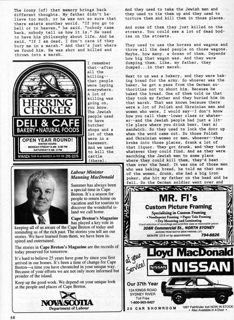 Published by Ronald Caplan on 1997/6/1 (190 reads)The irony (of) that memory brings back different thoughts. My father didn't be? lieve too much, or he was not so sure that there exists another world. "If you go to hell or to heaven," he said, "nobody came back, nobody tell us how it is." He used to have his philosophy about life. And he said, "If I am dead, I don't care if they bury me in a marsh." And that's just where we found him. He was shot and killed and thrown into a marsh. DELI & CAFE BAKERY.NATURAL FOODS I [OPEN I MONC OPEN YEAR ROUND! WINTER HOURS: MONDAY-FRIDAY 8 AM - 5:30 PM SATURDAY 9 AM - 5 PM NO! 11 • J I remember that--after all the killing-- that people were laying everywhere. A lot Of killing was going on, you know. The Jewish people used to have butcher shops and a lot of them were in a basement. And we used to kill the cattle (there). Labour Minister Manning MacDonald Summer has always been a special time in (Tape Breton. It's a season for people to retum home on vacation and for tourists to discover the wonderful is? land we call home. Cape Breton's Magazine has played a key role in keeping all of us aware of the Cape Breton of today and reminding us of the rich past. The stories you tell are our stories. We have learned from them, we have been in? spired and entertained. The stories in Cape Breton's Magazine are the records of today preserved for tomorrow. It's hard to believe 25 years have gone by since you first arrived in our homes. It's been a time of change for Cape Breton • a time you have chronicled in your unique way. Because of your efforts we are not only more informed but prouder of the island. Keep up the good work. We depend on your unique look at the people and places of Cape Breton. MmsGonA Department of Labour And they used to take the Jewish men and they used to tie them up and they used to torture them and kill them in those places. And some of them they just killed on the streets. You could see a lot of dead bod? ies on the streets. They used to use the horses and wagons and throw all the dead people on those wagons. Maybe, how many, a dozen of them. Depends how big that wagon was. And they were dumping them. Like, my father, they dumped...in that marsh. Next to us was a bakery, and they were bak? ing bread for the army. So whoever was the baker, he got a pass from the German au? thorities not to shoot him. Because he baked the bread. One of them told us that they took my father and they buried him in that marsh. That was known because there were a lot of Polish and Ukrainian men and women who were, I would say--I don't know how you call them--lower class or whatev? er- -and the Jewish people had just a lit? tle place where you drink beer, (eat a) sandwich. So they used to lock the door up when the word came out. So those Polish and Ukrainian women or men, whoever--they broke into those places, drank a lot of that liquor. They got drunk, and they took whatever they could find. And as they were marching the Jewish men to some place where they could kill them, they'd beat them over the head. It was one of those men who was baking bread, he told me that one of the women, drunk, she had a big iron poker, she hit my father on the head and he fell. So the German soldier went over and MR. Fl's Custom Picture Framing specializing in Custom Fiamii' • Needlepoint Fraining • Paper Tole Framii' • Dry Mounting and Laminatii' Good selection of mouldings and acid-free mats at reasonable prices 308R Commercial St., NORTH SYDNEY (ACROSS FROM SCOTIA BANK PARKING LOT) MON-FRI 10-5 or by appointment 794-8826 20 CAR SHOWROOM 1997 Pathfinder 4x4 NOW IN STOCK • Also Available in 4-Door • 68