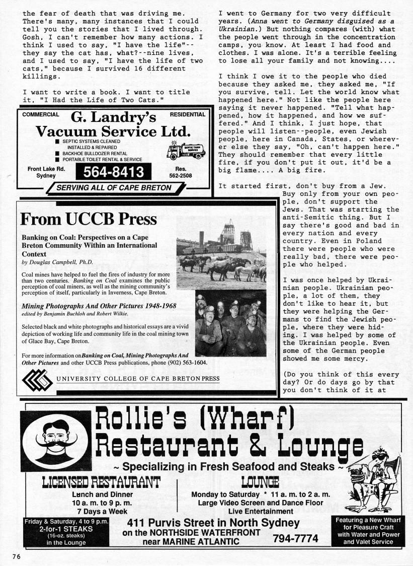 Published by Ronald Caplan on 1997/6/1 (197 reads)the fear of death that was driving me. There's many, many instances that I could tell you the stories that I lived through. Gosh, I can't remember how many actions. I think I used to say, "I have the life"-- they say the cat has, what?--nine lives, and I used to say, "I have the life of two cats," because I survived 16 different killings. I want to write a book. I want to title it, "I Had the Life of Two Cats." COMMERCIAL G.Landry's "'="'''' Vacuum Service Ltd. I SEPTIC SYSTEMS CLEANED INSTALLED & REPAIRED I BACKHOE BULLDOZER RENTAL I PORTABLE TOILET RENTAL & SERVICE Front Lake Rd. Sydney 564-8413 ?? / SERVING ALL OF CAPE BRETON ' 1 I went to Germany for two very difficult years. (Anna went to Germany disguised as a Ukrainian.) But nothing compares (with) what the people went through in the concentration camps, you know. At least I had food and clothes. I was alone. It's a terrible feeling to lose all your family and not knowing.... I think I owe it to the people who died because they asked me, they asked me, "If you survive, tell. Let the world know what happened here." Not like the people here saying it never happened. "Tell what hap? pened, how it happened, and how we suf? fered." And I think, I just hope, that people will listen--people, even Jewish people, here in Canada, States, or wherev? er else they say, "Oh, can't happen here." They should remember that every little fire, if you don't put it out, it'd be a big flame.... A big fire. It From UCCB Press Banking on Coal: Perspectives on a Cape Breton Community Within an International Context Ijy Douglas Campbell, Ph.D. Coal mines have helped to fuel the fires of industry for more than two centuries. Banking on Coal examines the pubHc perception of coal miners, as well as the mining community's perception of itself, particularly in Inverness, Cape Breton. Mining Photographs And Other Pictures 1948-1968 edited by Benjamin Buchlofi and Robert Willcie. Selected black and white photographs and historical essays are a vivid depiction of working life and community life in the coal mining town of Glace Bay, Cape Breton. For more information onBanking on Coal, Mining Photographs And Other Pictures and other UCCB Press publications, phone (902) 563-1604. UNIVERSITY COLLEGE OF CAPE BRETONPRESS Started first, don't buy from a Jew. Buy only from your own peo? ple, don't support the Jews. That was starting the anti-Semitic thing. But I say there's good and bad in every nation and every country. Even in Poland there were people who were really bad, there were peo? ple who helped. I was once helped by Ukrai? nian people. Ukrainian peo? ple, a lot of them, they don't like to hear it, but they were helping the Ger? mans to find the Jewish peo? ple, where they were hid? ing. I was helped by some of the Ukrainian people. Even some of the German people showed me some mercy. (Do you think of this every day? Or do days go by that you don't think of it at Rollie's (Wharf) Restaurant L Lounge - Specializing in Fresh Seafood and Steal