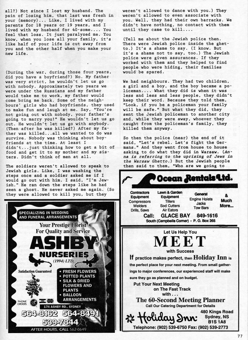 Published by Ronald Caplan on 1997/6/1 (217 reads)all?) Not since I lost my husband. The pain of losing him, that last was fresh in your (memory)... Like, I lived with my parents for 18 years or 19 years, and I lived with my husband for 40-some.... You feel that loss. It just paralyzed me. You know, when you lose all your family, it's like half of your life is cut away from you and the other half when you make your new life. (During the war, during those four years, did you have a boyfriend?) No. My father was very strict, he wouldn't let us go with nobody. Approximately two years we were under the Russians and my father would take me to work, my father would come bring me back. Some of the neigh? bours' girls who had boyfriends, they used to make fun and laugh at me. Say, "You're not going out with nobody, your father's going to marry you!" He wouldn't let us go out. He wouldn't let us go with anybody. (Then after he was killed?) After my fa? ther was killed...all we wanted to do was survive. Nobody was thinking about boy? friends at the time. At least I didn't...just thinking how to get a bit of food and get it to my mother and my sis? ters. Didn't think of men at all. The soldiers weren't allowed to speak to Jewish girls. Like, I was washing the steps once and a soldier asked me if I would go out with him. I said, "I'm Jew? ish." He ran down the steps like he had seen a ghost. He never asked me again. (So they were allowed to kill you, but they SPECIALIZING IN WEDDING AND FUNERAL ARRANGEMENTS Your Prestige EferisT For Quality and Service i ASHBY' NURSERIES • ??i (1994) LTD. FRESH FLOWERS POTTED PLANTS SILK & DRIED FLOWERS AND PLANTS BALLOON ARRANGEMENTS weren't allowed to dance with you.) They weren't allowed to even associate with you. Well, they had their own barracks. We didn't have nothing, no contact with them until they came to kill.... (Tell me about the Jewish police then. There were Jewish police inside the ghet? to.) It's a shame to say. (I know. But it's a shame not to say, too.) The Jewish police were given assurances. If they worked with them and they helped to find people who were hiding, their families would be spared. We had neighbours. They had two children, a girl and a boy, and the boy became a po? liceman.... What they did is when it was less and less and less people, they didn't keep their word. Because they told them, "Look, if you be a policeman your family will be safe." But what they did, they sent the Jewish policeman to another city and, while they were away, whoever they caught from the policeman's family, they killed them anyway. So then the police (near) the end of it said, "Let's rebel. Let's fight the Ger? mans ." And they went from house to house asking to do what they did in Warsaw. (An? na is referring to the uprising of Jews in the Warsaw Ghetto.) But the Jewish people then said to them, "Who are we going to OcttcmJltnlidt'ld. Contractors Equipment Compressors Welders Drills, Saws Call: Lawn & Garden Equipment Tillers Sod Cutters Air Eators GLACE BAY General ' Engine Hoists Much More... Jacks Tow Bars 849-1616 South (Campbells Comer) - P.O. Box 265 Let Us Help You MEET with Success If practice makes perfect, then Holiday Inn is the perfect place for your next meeting. From small gather? ings to major conferences, our experienced staff will malte sure they go as planned and on budget. Put Your Next Meeting on The Fast Tracl< with... The 60-Second Meeting Planner Call Our Catering Department for Details 480 Kings Road ?A|A?? Sydney, NS ''' B1S1A8 Telephone: (902) 539-6750 Fax: (902) 539-2773 '' ';'oMcu3 '