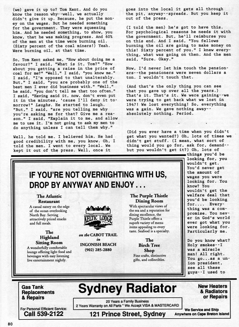 (we) gave it up to? Tom Kent. And do you know the reason why--well, we actually didn't give it up. Because, he put the mon? ey on the wages. But he needed something for the government. They were squeezing him. And he needed something, to show, you know, that he was making progress. And 60% of the men at the time were burning oil. (Sixty percent of the coal miners!) Yeah. Were burning oil, at that time. So, Tom Kent asked me, "How about doing me a favour?" I said, "What is it, Tom?" "How about you getting a raise in the price of coal for me?" "Well," I said, "you know me." I said, "I'm opposed to that Unalterably. But," I said, "you are probably one of the best men I ever did business with." "Well," he said, "you don't tell me that too often." I said, "Having said it, now, don't even put it in the minutes, 'cause I'll deny it to? morrow!" Laughs. He started to laugh. "But," I said, "are you telling me why you're asking me for that? Give me a rea? son." I said, "Explain it to me, and allow me to use it. I'm not going to ask my men to do anything unless I can tell them why." Well, he told me. I believed him. He had good credibility with me, you know. Oh, I told the men. I went to every local. We kept it out of the press. Well, once it goes into the local it gets all through the pit, anyway--spreads. But you keep it out of the press. (I told the men) he's got to have this. For psychological reasons he needs it with the government. But, he'll reimburse you on this end. And I said, "You fellows burning the oil are going to make money on this! Sixty percent of you." I knew every? thing, what was going on then. And the men said, "Sure. Okay." Now, I'd never let him touch the pension? ers- -the pensioners were seven dollars a ton. I wouldn't touch that. (And that's the only thing you can see that you gave up over all the years.) That's it. That's it. We were gaining--we were trying to get back what we lost in 1947! We lost everything! So. everything was a gain. We gave nothing away-- absolutely nothing. Period. (Did you ever have a time when you didn't get what you wanted?) Oh, lots of times we didn't get stuff. (I mean, what sort of thing would you go for, ask for, demand-- but you wouldn't get it?) Oh, lots of '''Hn''HH''MH''HiiM'M things you' d be IF YOU'RE NOT OVERNIGHTING WITH US, DROP BY ANYWAY AND ENJOY... The Atlantic Restaurant A casual eatery on the edge of the ocean overlooking North Bay. Serving attractively priced snacks and full meals. The Highland Sitting Room A wonderfully comfortable lounge offering light food and beverages with easy listening live entertainment nightly. KBjJjgtgpGF oM'Ae CABOT TRAIL in INGONISH BEACH (902) 285-2880 The Purple Thistle Dining Room With spectacular views of the sea and a reputation for dining excellence, the Purple Thistle offers a superb variety of menu items appealing to every taste. Seafood is a specialty. The Birch Tree Shop Fine crafts, distinctive gifts, and collectibles. looking for, you wouldn't get. You'd never get the amount of wages you were looking for. You know? You wouldn't get the welfare deal that you'd be looking for.... Every? thing was a com? promise. You nev? er in God's world ever got what you were looking for. Particularly me. Do you know what? Holy smokes--I was a miracle man! All right. You go...as a un? ion president, see all these guys--I used to Gas Tank Replacements & Repairs For Personal Efficient Sen/ice: Call 539-2122 Sydney Radiator New Heaters & Radiators or Repairs We Service and Ship 121 Prince Street, Sydney Anywhere on cape Breton island 20 Years a Family Business 2 Years Wan'anty on All Parts * We Accept VISA & MASTERCARD 80