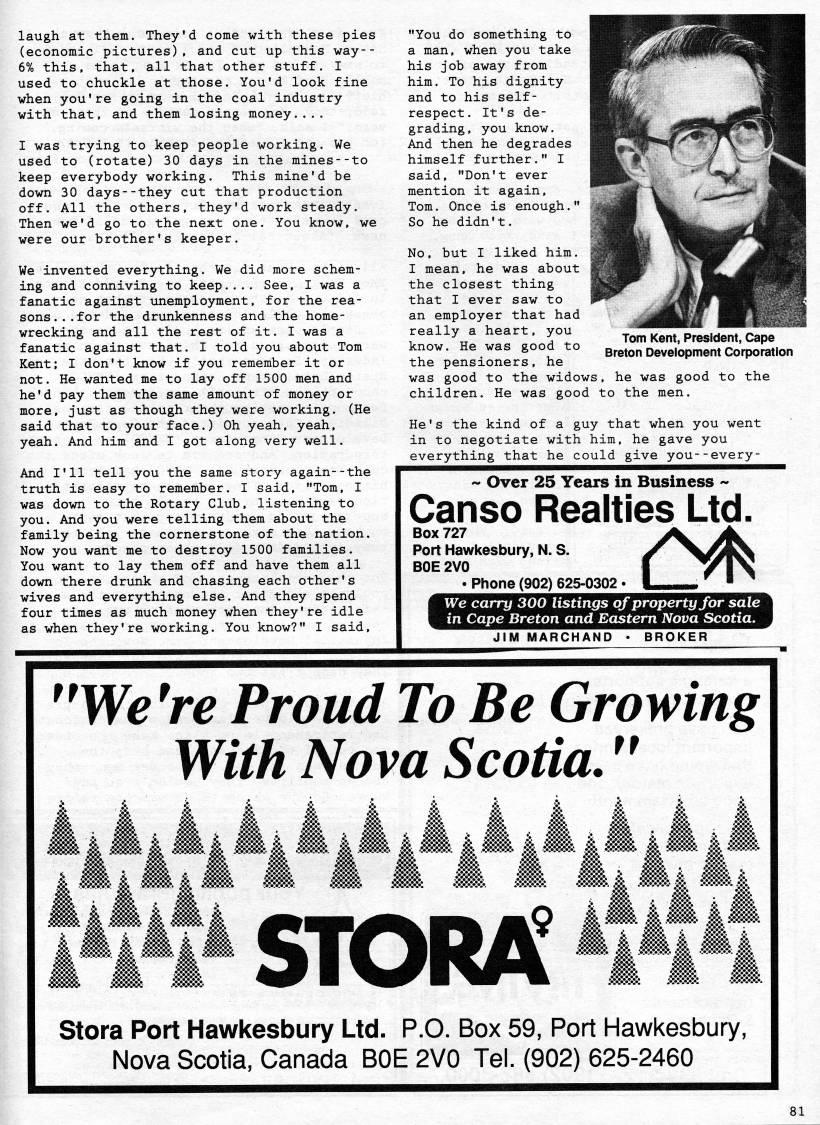 laugh at them. They'd come with these pies (economic pictures), and cut up this way-- 6% this, that, all that other stuff. I used to chuckle at those. You'd look fine when you're going in the coal industry with that, and them losing money.... I was trying to keep people working. We used to (rotate) 30 days in the mines--to keep everybody working. This mine'd be down 30 days--they cut that production off. All the others, they'd work steady. Then we'd go to the next one. You know, we were our brother's keeper. We invented everything. We did more schem? ing and conniving to keep.... See, I was a fanatic against unemployment, for the rea? sons... for the drunkenness and the home- wrecking and all the rest of it. I was a fanatic against that. I told you about Tom Kent; I don't know if you remember it or not. He wanted me to lay off 1500 men and he'd pay them the same amount of money or more, just as though they were working. (He said that to your face.) Oh yeah, yeah, yeah. And him and I got along very well. And I'll tell you the same story again--the truth is easy to remember. I said, "Tom, I was down to the Rotary Club, listening to you. And you were telling them about the family being the cornerstone of the nation. Now you want me to destroy 1500 families. You want to lay them off and have them all down there drunk and chasing each other's wives and everything else. And they spend four times as much money when they're idle as when they're working. You know?" I said. "You do something to a man, when you take his job away from him. To his dignity and to his self- respect. It's de? grading, you know. And then he degrades himself further." I said, "Don't ever mention it again, Tom. Once is enough." So he didn't. No, but I liked him. I mean, he was about the closest thing that I ever saw to an employer that had really a heart, you know. He was good to the pensioners, he was good to the widows, he was good to the children. He was good to the men. Tom Kent, President, Cape Breton Development Corporation He's the kind of a guy that when you went in to negotiate with him, he gave you everything that he could give you--every- ~ Over 25 Years in Business ~ Canso Realties Ltd. Box 727 Port Hawkesbury, N. S. BOE 2V0 ? Phone (902) 625-0302 • We carry 300 listings of property for sale in Cape Breton and Eastem Nova Scotia. t'' JIM IMARCHAND BROKER ''We're Proud To Be Growing With Nova Scotia. '' m B. k ft:* .& ft:*'::: :% 'WftW. .ift. ::!?ft:4fc • :% .!:*y*:. .%. im!!'':. :% . • :!!?%< a:;. .:::*s* ::a *:ft:5Si ift. :??:!: • :**. $A *y*!4 • & • *%% im jjKi i??& $& m. m- 'sa M' m m, m' '., ?5ift:. .ft::. >r:::5S* :??: • m-iiii'' '::::& '. M: ' STORA M * ' >:*x?x ??>x?x • : • >: • :*>: • • Stora Port Hawkesbury Ltd. P.O. Box 59, Port Hawkesbury, Nova Scotia, Canada BOE 2V0 Tel. (902) 625-2460