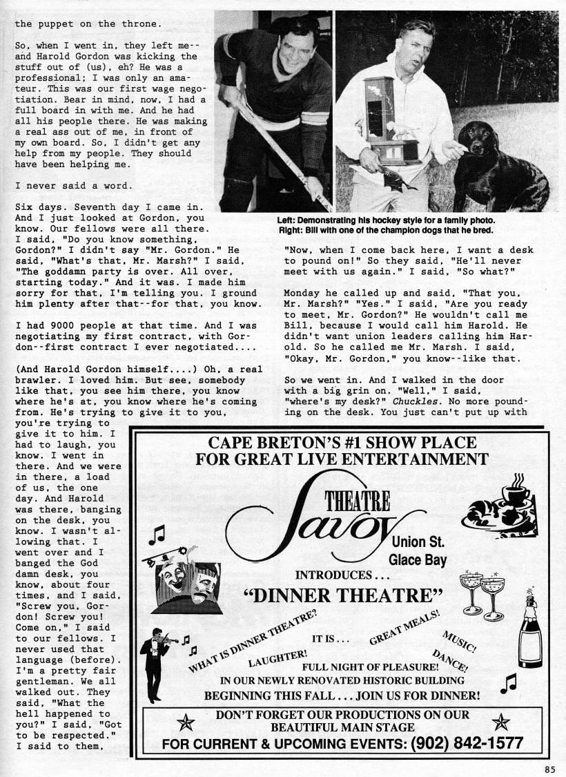 the puppet on the throne. So, when I went in, they left me-- and Harold Gordon was kicking the stuff out of (us), eh? He was a professional; I was only an ama? teur. This was our first wage nego? tiation. Bear in mind, now, I had a full board in with me. And he had all his people there. He was making a real ass out of me, in front of my own board. So, I didn't get any help from my people. They should have been helping me. I never said a word. Six days. Seventh day I came in. And I just looked at Gordon, you know. Our fellows were all there. I said, "Do you know something, Gordon?" I didn't say "Mr. Gordon." He said, "What's that, Mr. Marsh?" I said, "The goddamn party is over. All over, starting today." And it was. I made him sorry for that, I'm telling you. I ground him plenty after that--for that, you know. I had 9000 people at that time. And I was negotiating my first contract, with Gor? don- -first contract I ever negotiated.... (And Harold Gordon himself....) Oh, a real brawler. I loved him. But see, somebody like that, you see him there, you know where he's at, you know where he's coming from. He's trying to give it to you, you're trying to him. I Left: Demonstrating his hocicey style for a family photo. Right: Bill with one of the champion dogs that he bred. "Now, when I come back here, I want a desk to pound on!" So they said, "He'll never meet with us again." I said, "So what?" Monday he called up and said, "That you, Mr. Marsh?" "Yes." I said, "Are you ready to meet, Mr. Gordon?" He wouldn't call me Bill, because I would call him Harold. He didn't want union leaders calling him Har? old. So he called me Mr. Marsh. I said, "Okay, Mr. Gordon," you know--like that. So we went in. And I walked in the door with a big grin on. "Well," I said, "where's my desk?" Chuckles. No more pound? ing on the desk. You just can't put up with give it to had to laugh, you know. I went in there. And we were in there, a load of us, the one day. And Harold was there, banging on the desk, you know. I wasn't al? lowing that. I went over and I banged the God damn desk, you know, about four times, and I said, "Screw you, Gor? don! Screw you! Come on," I said to our fellows. I never used that language (before). I'm a pretty fair gentleman. We all walked out. They said, "What the hell happened to you?" I said, "Got to be respected." I said to them. CAPE BRETON'S #1 SHOW PLACE FOR GREAT LIVE ENTERTAINMENT THMTRE Union St. Glace Bay INTRODUCES... "DINNER THEATRE'' i''' '''' IT IS ... G'' L'' .''' '' FULL NIGHT OF PLEASURE! Q'r IN OUR NEWLY RENOVATED HISTORIC BUILDING BEGINNING THIS FALL ... JOIN US FOR DINNER /k DON'T FORGET OUR PRODUCTIONS ON OUR /i M BEAUTIFUL MAIN STAGE M FOR CURRENT & UPCOMING EVENTS: (902) 842-1577 85