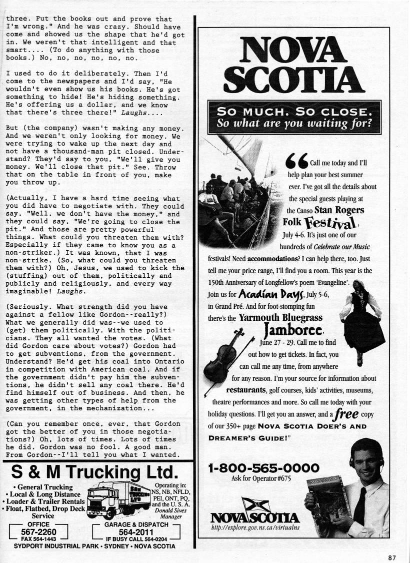 three. Put the books out and prove that I'm wrong." And he was crazy. Should have come and showed us the shape that he'd got in. We weren't that intelligent and that smart.... (To do anything with those books.) No, no, no, no, no, no. I used to do it deliberately. Then I'd come to the newspapers and I'd say, "He wouldn't even show us his books. He's got something to hide! He's hiding something. He's offering us a dollar, and we know that there's three there!" Laughs.... But (the company) wasn't making any money. And we weren't only looking for money. We were trying to wake up the next day and not have a thousand-man pit closed. Under? stand? They'd say to you, "We'll give you money. We'll close that pit." See. Throw that on the table in front of you, make you throw up. (Actually, I have a hard time seeing what you did have to negotiate with. They could say, "Well, we don't have the money," and they could say, "We're going to close the pit." And those are pretty powerful things. What could you threaten them with? Especially if they came to know you as a non-striker.) It was known, that I was non-strike. (So, what could you threaten them with?) Oh, Jesus, we used to kick the (stuffing) out of them, politically and publicly and religiously, and every way imaginable! Laughs. (Seriously. What strength did you have against a fellow like Gordon--really?) What we generally did was--we used to (get) them politically. With the politi? cians. They all wanted the votes. (What did Gordon care about votes?) Gordon had to get subventions, from the government. Understand? He'd get his coal into Ontario in competition with American coal. And if the government didn't pay him the subven? tions, he didn't sell any coal there. He'd find himself out of business. And then, he was getting other types of help from the government, in the mechanization... (Can you remember once, ever, that Gordon got the better of you in those negotia? tions?) Oh, lots of times. Lots of times he did. Gordon was no fool. A good man. From Gordon--I'11 tell you what I wanted. S & M Trucking Ltd. • General Trucking • Local & Long Distance Loader & Trailer Rentals ' Float, Flatbed, Drop Deck Service r- OFFICE • -1 567-2260 FAX 564-1443 • ' SYDPORT INDUSTRIAL PARK LGfi IF Operating in: NS,NB,NFLD, PEI, ONT, PQ, and the U.S. A. Donald Sives Manager GARAGE & DISPATCH • i 564-2011 BUSY CALL 564-0204 ' SYDNEY. NOVA SCOTIA NOVA scoha So MUCH. So CLOSE. So what are you waiting for? ' ' Call me today and I'll ' help plan your best summer ever. I've got all the details about the special guests playing at the Canso Stan Rogcrs Foikfest/va July 4-6. It's just one of our hundreds of Celebrate our Music festivals! Need accommodations? I can help there, too. Just tell me your price range, I'll find you a room. This year is the 150th Anniversary of Longfellow's poem 'Evangeline'. Join us for Acn'imi 'li1'J, July 5-6, in Grand Pre. And for foot-stomping fun there's the Yarmouth Bluegrass Jamboree June 27 - 29. Call me to find out how to get tickets. In fact, you can call me any time, from anywhere for any reason. I'm your source for information about restaurants, golf courses, kids' activities, museums, theatre performances and more. So call me today with your hoUday questions. I'll get you an answer, and a fr00 copy of our 350+page Nova Scotia Doer's and Dreamer's Guide! " 1-800-565-0000 Ask for operator #675 http://explore.gov. ns. ca/virtualns 87
