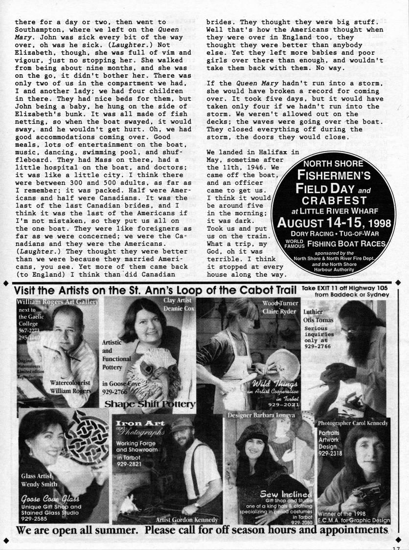there for a day or two, then went to Southampton, where we left on the Queen Mary. John was sick every bit of the way over, oh was he sick. (Laughter.) Not Elizabeth, though, she was full of vim and vigour, just no stopping her. She walked from being about nine months, and she was on the go, it didn't bother her. There was only two of us in the compartment we had, I and another lady: we had four children in there. They had nice beds for them, but John being a baby, he hung on the side of Elizabeth's bunk. It was all made of fish netting, so when the boat swayed, it would sway, and he wouldn't get hurt. Oh, we had good accommodations coming over. Good meals, lots of entertainment on the boat, music, dancing, swimming pool, and shuf- fleboard. They had Mass on there, had a little hospital on the boat, and doctors; it was like a little city. I think there were between 300 and 500 adults, as far as I remember: it was packed. Half were Amer? icans and half were Canadians. It was the last of the last Canadian brides, and I think it was the last of the Americans if I'm not mistaken, so they put us all on the one boat. They were like foreigners as far as we were concerned: we were the Ca? nadians and they were the Americans. (Laughter.) They thought they were better than we were because they married Ameri? cans, you see. Yet more of them came back (to England) I think than did Canadian brides. They thought they were big stuff. Well that's how the Americans thought when they were over in England too, they thought they were better than anybody else. Yet they left more babies and poor girls over there than enough, and wouldn't take them back with them. No way. If the Queen Mary hadn't run into a storm, she would have broken a record for coming over. It took five days, but it would have taken only four if we hadn't run into the storm. We weren't allowed out on the decks: the waves were going over the boat. They closed everything off during the storm, the doors they would close. We landed in Halifax in May, sometime after the 11th, 1946. We came off the boat, and an officer came to get us. I think it would be aroiind five in the morning: it was dark. Took us and put us on the train. What a trip, my God, oh it was terrible. I think it stopped at every house along the way. 'NORTH SHORE , ' FISHERMEN'S ' , ' Field Day and CRABFEST at Little River Wharf August 14-15,1998 J DORY RACING • TUG-OF-WAR Visit the Artists on the St. Ann's Loop Of the Cabot Trail '';'i:j'::!f::!'j' We are open all summer. Please call for off season lo'aSd appointments