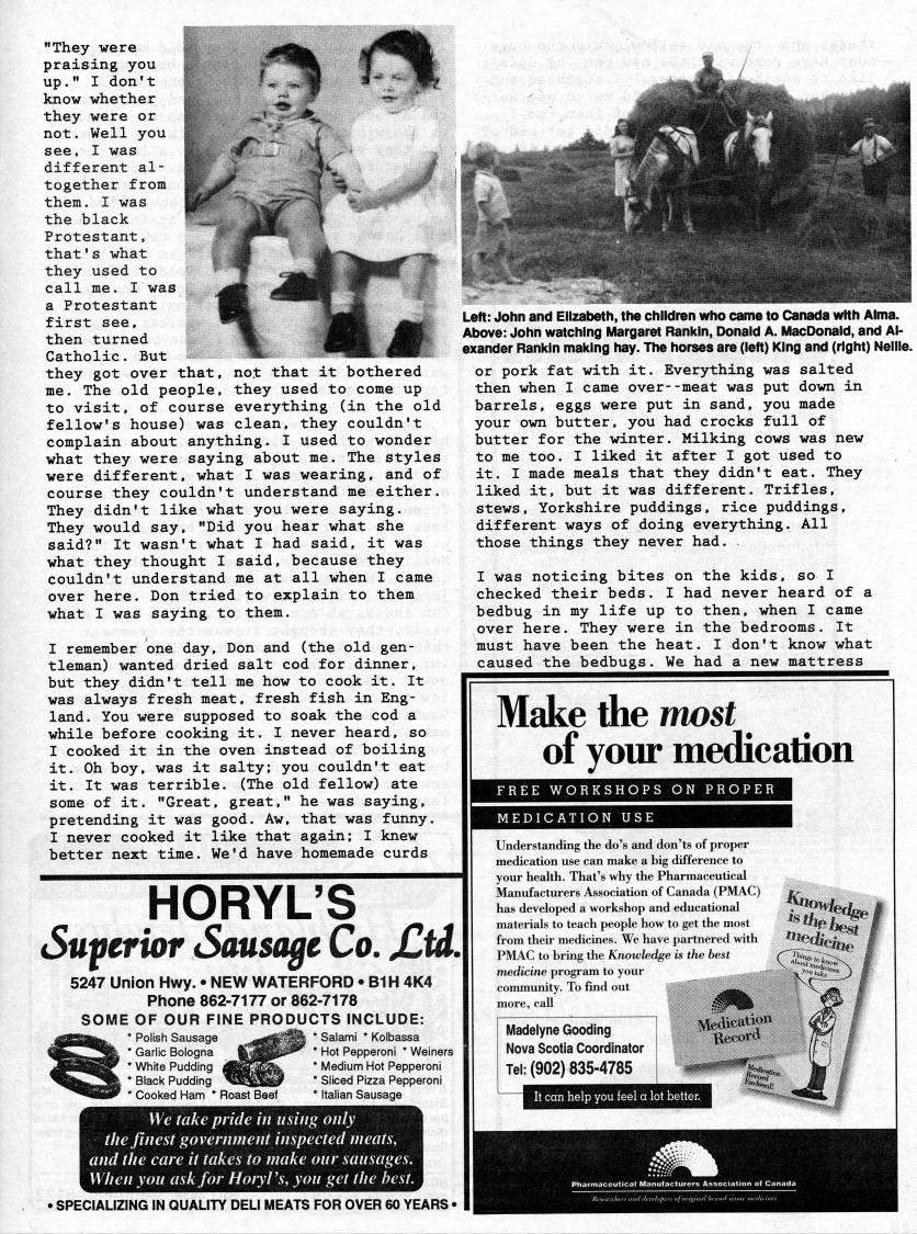 They were praising you up. I don't know whether they were or not. Well you see, I was different al? together from them. I was the black Protestant, that's what they used to call me. I was a Protestant first see, then turned Catholic. But they got over that, not that it bothered me. The old people, they used to come up to visit, of course everything (in the old fellow's house) was clean, they couldn't complain about anything. I used to wonder what they were saying about me. The styles were different, what I was wearing, and of course they couldn't understand me either. They didn't like what you were saying. They would say, "Did you hear what she said?" It wasn't what I had said, it was what they thought I said, because they couldn't understand me at all when I came over here. Don tried to explain to them what I was saying to them. I remember one day, Don and (the old gen? tleman) wanted dried salt cod for dinner, but they didn't tell me how to cook it. It was always fresh meat, fresh fish in Eng? land. You were supposed to soak the cod a while before cooking it. I never heard, so I cooked it in the oven instead of boiling it. Oh boy, was it salty: you couldn't eat it. It was terrible. (The old fellow) ate some of it. "Great, great," he was saying, pretending it was good. Aw, that was funny. I never cooked it like that again; I knew better next time. We'd have homemade curds ':'*.'?'v tj' Left: John and Elizabeth, the children who came to Canada wHh Alma. Above: John watching Margaret Rankin, Donald A. MacDonald, and Al? exander Rankin making hay. The horses are (left) King and (right) Nellie. or pork fat with it. Everything was salted then when I came over--meat was put down in barrels, eggs were put in sand, you made your own butter, you had crocks full of butter for the winter. Milking cows was new to me too. I liked it after I got used to it. I made meals that they didn't eat. They liked it, but it was different. Trifles, stews, Yorkshire puddings, rice puddings, different ways of doing everything. All those things they never had. I was noticing bites on the kids, so I checked their beds. I had never heard of a bedbug in my life up to then, when I came over here. They were in the bedrooms. It must have been the heat. I don't know what caused the bedbugs. We had a new mattress HORYL'S Superior Sausage Co. Jltd. 5247 Union Hwy. • NEW WATERFORD • B1H 4K4 Phone 862-7177 or 862-7178 SOME OF OUR FINE PRODUCTS INCLUDE: j'BSSti'.' * '?'''' Sausage '.'M''''k * ''''rn' * Kolbassa '''2j|k * Garlic Bologna ''''P' * Hot Pepperoni * Weiners 'HIHB' * White Pudding jjj'''' * Medium Hot Pepperoni 'M|'3k * Black Pudding ''''p * Sliced Pizza Pepperoni '''??BP * Cooked Hann * Roast Beef * Italian Sausage We take pride i nil sing only the finest govemment inspected meats, and the care it takes to make our sausages. When you ask for HoiyVs, you get the best. . SPECIAUZING IN QUALITY DELI MEATS FOR OVER 60 YEARS • Make the most of your medication 'REE WORKSHOPS ON PROPER H'lHAti'lM'm Understanding the do's and don'ts of proper medication use can make a big difference to your heakh. That's why the Pharmaceutical Manufacturers Association of Canada (PMAC) has developed a workshop and educational materials to teach people how to get the most from their medicines. We have partnered with PMAC to bring the Knowledge is the best medicine program to your community. To find out more, call Madelyne Gooding Nova Scotia Coordinator Tel: (902) 835-4785 i mamM