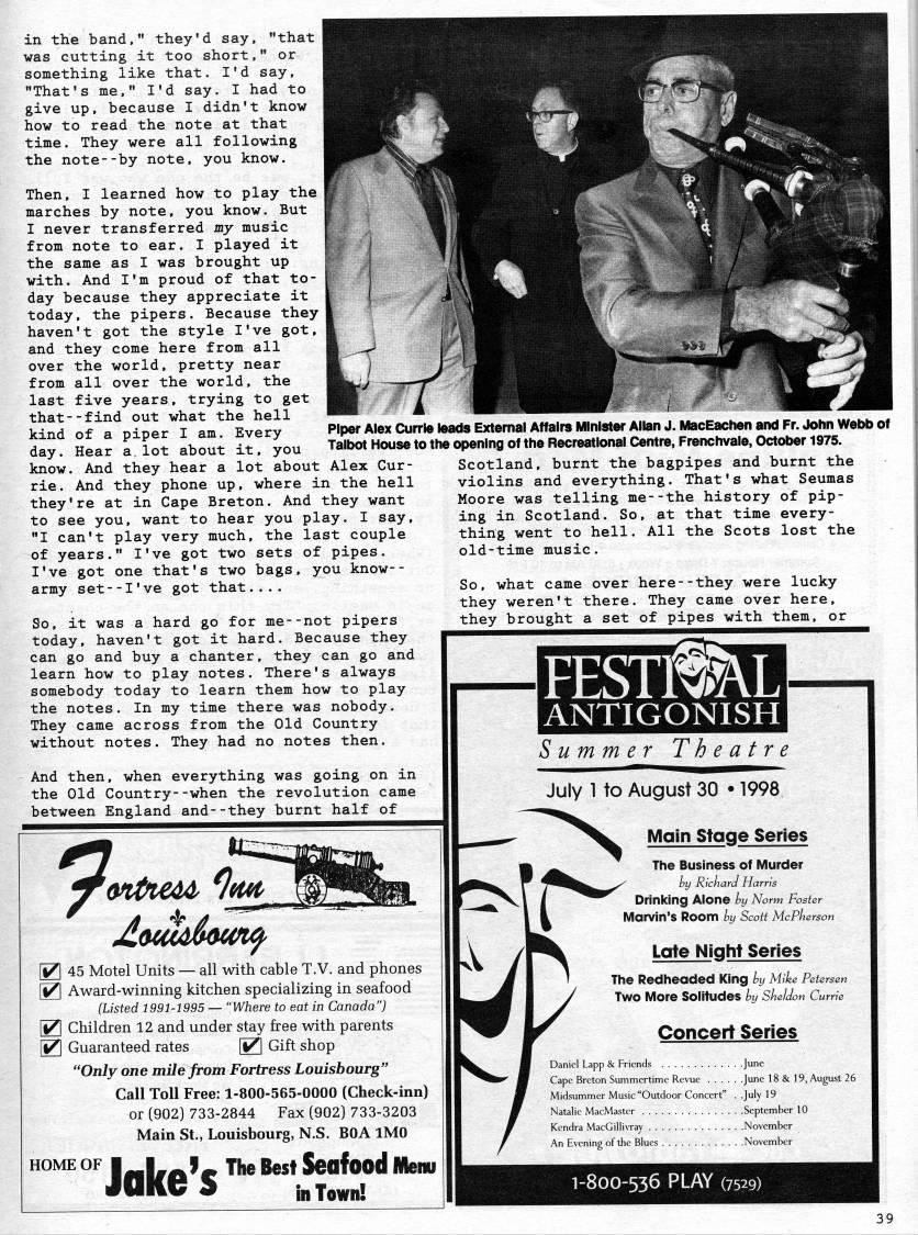Published by Ronald Caplan on 1998/6/1 (440 reads)in the band," they'd say, "that was cutting it too short," or something like that. I'd say, "That's me," I'd say. I had to give up, because I didn't know how to read the note at that time. They were all following the note--by note, you know. Then, I learned how to play the marches by note, you know. But I never transferred my music from note to ear. I played it the same as I was brought up with. And I'm proud of that to? day because they appreciate it today, the pipers. Because they haven't got the style I've got, and they come here from all over the world, pretty near from all over the world, the last five years, trying to get that--find out what the hell kind of a piper I am. Every day. Hear a.lot about it, you know. And they hear a lot about Alex Cur? rie. And they phone up, where in the hell they're at in Cape Breton. And they want to see you, want to hear you play. I say, "I can't play very much, the last couple of years." I've got two sets of pipes. I've got one that's two bags, you know-- army set--I've got that.... Piper Alex Currie leads External Affairs Minister Allan J. MacEachen and Fr. John Webb of Talbot House to the opening of the Recreational Centre, Frenchvale, October 1975. Scotland, burnt the bagpipes and burnt the violins and everything. That's what Seumas Moore was telling me--the history of pip? ing in Scotland. So, at that time every? thing went to hell. All the Scots lost the old-time music. So, it was a hard go for me--not pipers today, haven't got it hard. Because they can go and buy a chanter, they can go and learn how to play notes. There's always somebody today to learn them how to play the notes. In my time there was nobody. They came across from the Old Country without notes. They had no notes then. And then, when everything was going on in the Old Country--when the revolution came between England and--they burnt half of So, what came over here--they were lucky they weren't there. They came over here, they brought a set of pipes with them, or • • 0 45 Motel Units • all with cable T.V. and phones }/ Avyrard-winning kitchen specializing in seafood [Lisied 1991-1995 • "Where to eat in Canada") 0 Children 12 and under stay free with parents 0 Guaranteed rates [' Gift shop "Only one mile from Fortress Louisbourg" Call ToU Free: 1-800-565-0000 (Check-inn) or (902) 733-2844 Fax (902) 733-3203 Main St., Louisbourg, N.S. BOA iMO HOME OF l'i''l' The Best Seafood Menu in Town! Jake's S u m me r Th e at r e July 1 to August 30 • 1998 Main Stage Series ''' The Business of Murder '''''''''' by Richard Harris I ''' Drinking Alone hy Norm foster V Marvin's Room hy Scott McPherson Late Night Series The Redheaded King hy Mike Petersen Two More Solitudes hy Sheldon Currie Concert Series Daniel Lapp & Friends June Cape Breton Summertime Revue June 18 & 19, August 26 Midsummer Music "Outdoor Concert" . .July 19 Natalie MacMaster September 10 Kendra MacGillivray November An Evening of the Blues November 1-800-536 PLAY (7529)