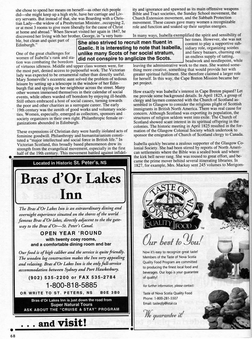 she chose to spend her means on herself • as other rich people did • she might keep up a high style, have her carriage and Liv? ery servants. But instead of that, she was Boarding with a Chris? tian Lady • the widow of a Presbyterian Minister...occupy ing 2, or at most 3 rooms to give more liberally for the cause of Christ at home and abroad." When Stewart visited her again in 1847, he discovered her living with her brother, George, in "a very hum? ble, but clean and quiet part of Edinburgh." One of the great challenges for women of Isabella's rank and sta tion was combating the boredom of virtuous idleness. Middle and upper class women were, for the most part, denied access to purposeful work. The Victorian lady was expected to be ornamental rather than directly useful. Mary Somerville's eccentric aunt solved the problem of tedious leisure by setting up a telescope in the window of her Edin? burgh flat and spying on her neighbour across the street. Many other women immersed themselves in their calendar of social events, while others warded off boredom by enjoying ill-health. Still others embraced a host of social causes, turning towards the poor and other charities as a surrogate career. The early 19th century was the zenith of good works and voluntary socie? ties. Women, especially, emerged as collectors, sponsors and society organizers in their own right. Philanthropic female or? ganizations abounded in Edinburgh. These expressions of Christian duty were hardly isolated acts of feminine goodwill. Philanthropy and humanitarianism consti? tuted a "major intellectual and social force in British life." In Victorian Scotland, this broadly based phenomenon drew its strength from the evangelical movement, especially in the first half of the 19th century. This movement battled against infidel- Located in Historic St. Peter's, NS She also strived to recruit men fluent in Gaelic. It is interesting to note that Isabella, unlike many Scots of her social stratum, did not conspire to anglicize the Scots. Bras d'Or Lakes Inn The Bras d'Or Lakes Inn is an extraordinary dining and overnight experience situated on the shores of the world famous Bras d'Or lakes, directly adjacent to the the gate? way to the Bras d'Or • St. Peter's Canal OPEN YEAR 'ROUND with twenty cosy rooms, and a comfortable dining room and bar Our food is of high caliber and the service is quite friendly. The wooden log construction makes the Inn very appealing and relaxing. Bras d'Or Lakes Inn is the only full-service accommodation between Sydney and Port Hawkesbury. (902) 535-2200 or FAX 535-2784 1-800-818-5885 OR WRITE TO ST. PETERS, NS BOE 3B0 Bras d'Or Lakes inn is just down the road from Super Natural Tours ASK ABOUT THE "CRUiSE & STAY" PROGRAIVi ity and ignorance and spawned as its main offensive weapons Bible and Tract societies, the Sunday School movement, the Church Extension movement, and the Sabbath Protection movement. These causes gave many women a recognizable role and function and soaked up their surplus energies. In many ways, Isabella exemplified the spirit and sensibility of her times. However, she was not content to play a supportive sub? sidiary role, organizing soirees and fancy bazaars, churning out an endless supply of tatting, beadwork and needlepoint, while leaving the administrative work to the men. She wanted some? thing more creative, something that would provide her with greater spiritual fulfilment. She therefore claimed a larger role for herself. In this way, the Cape Breton Mission became her pet project. How exactly was Isabella's interest in Cape Breton piqued? Let me provide some background details. In April 1825, a group of clergy and laymen connected with the Church of Scotland as? sembled in Glasgow to consider the religious plight of Scottish immigrants in British North America. There was real cause for concern. Although Scotland was exporting its population, the structures of religion seldom went into exile. The Church of Scotland showed scant interest in its spiritual offspring in the colonies. The historic meeting in April 1825 resulted in the for? mation of the Glasgow Colonial Society which undertook to sponsor the emigration of Church of Scotland clergy to Canada. Isabella quickly became a zealous supporter of the Glasgow Co? lonial Society. She had been stirred by reports of North Ameri? can settlements where the Bible was a sealed book and where the kirk bell never rang. She was roused to great effort, and be? came the prime mover behind several itinerating libraries. In 1827, for example, Mrs. Mackay sent 245 volumes to Merigom- Now it's easy to recognize great taste! Members of the Taste of Nova Scotia Quality Food Program are committed to producing the finest local food and beverages. Our logo is your guarantee of quality! for iuTiher information, please contact: Taste of Nova Scotia Quality Food Phone:1-800-281-5507 Email: [email protected] and visit! 'e guarantee iee li!