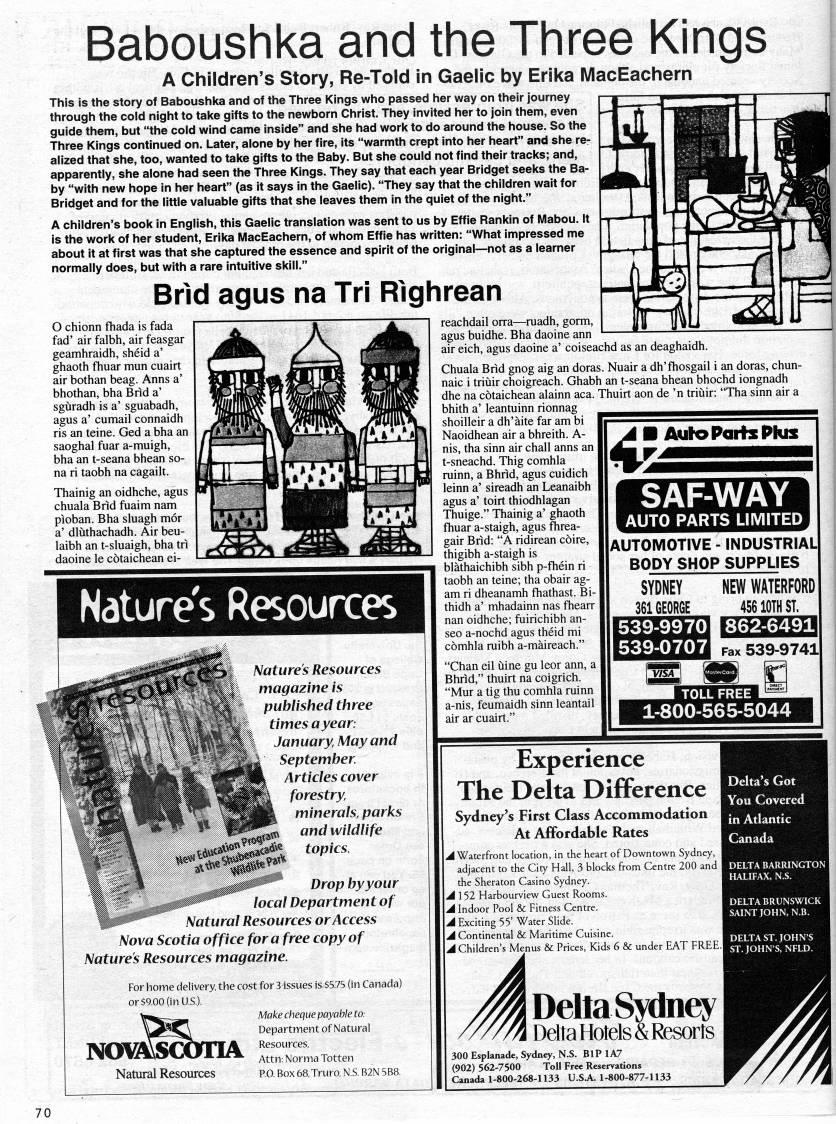 Baboushka and the Three A Children's Story, Re-Told in Gaelic by Erika MacEachem This is the story of Baboushka and of the Three Kings who passed her way on their journey through the cold night to take gifts to the newborn Christ. They invited her to join them, even guide them, but "the cold wind came inside" and she had work to do around the house. So the Three Kings continued on. Later, alone by her fire, its "warmth crept into her heart" and she re? alized that she, too, wanted to take gifts to the Baby. But she could not find their tracks; and, apparently, she alone had seen the Three Kings. They say that each year Bridget seeks the Ba? by "with new hope in her heart" (as it says in the Gaelic). "They say that the children wait for Bridget and for the little valuable gifts that she leaves them in the quiet of the night." A children's book in English, this Gaelic translation was sent to us by Effie Rankin of Mabou. It is the work of her student, Erika MacEachem, of whom Effie has written: "What impressed me about it at first was that she captured the essence and spirit of the original • not as a learner normally does, but with a rare intuitive skill." Brld agus na Tri Rlghrean O chionn fhada is fada fad' air falbh, air feasgar geamhraidh, sheid a' ghaoth fhuar mun cuairt air bothan beag. Anns a' bhothan, bha Bnd a' sguradh is a' sguabadh, agus a' cumail connaidh ris an teine. Ged a bha an saoghal fuar a-muigh, bha an t-seana bhean so- na ri taobh na cagailt. Thainig an oidhche, agus chuala Bnd fuaim nam pioban. Bha sluagh mor a' dliithachadh. Air beu- laibh an t-sluaigh, bha tri daoine le cotaichean ei- Natures Resources Nature's Resources magazine is published three times a year: January, May and September Articles cover forestry, minerals, parks and wildlife topics. Drop by your 'f'> 1'5''"' local Department of Natural Resources or Access Nova Scotia office for a free copy of Nature's Resources magazine. For home delivery, the cost for 3 issues is $5.75 (in Canada) __t'_. Make cheque payable to. Department of Natural TWf??V?%y'ffYlTTA Resources, Natural Resources P.O. Box 68, Truro, N.S. B2N 5B8. ': Aylo Paris Phn reachdail orra • raadh, gorm, agus buidhe. Bha daoine ann air eich, agus daoine a' coiseachd as an deaghaidh. Chuala Bnd gnog aig an doras. Nuair a dh'fhosgail i an doras, chun? naic i triiiir choigreach. Ghabh an t-seana bhean bhochd iongnadh dhe na cotaichean alainn aca. Thuirt aon de 'n triuir: "Tha sinn air a bhith a' leantuinn rionnag shoilleir a dh'aite far am bi Naoidhean air a bhreith. A- nis, tha sinn air chall anns an t-sneachd. Thig comhla ruinn, a Bhrid, agus cuidich leinn a' sireadh an Leanaibh agus a' toirt thiodhlagan Thuige." Thainig a' ghaoth fhuar a-staigh, agus flirea- gair Brid: "A ridirean coire, thigibh a-staigh is blathaichibh sibh p-fhein ri taobh an teine; tha obair ag? am ri dheanamh fhathast. Bi- thidh a' mhadainn nas fhearr nan oidhche; fuirichibh an- seo a-nochd agus theid mi comhla mibh a-maireach." "Chan eil uine gu leor ann, a Bhrid," thuirt na coigrich. "Mur a tig thu comhla ruinn a-nis, feumaidh sinn leantail air ar cuairt." SAF-WAY AUTO PARTS LIMITED AUTOMOTIVE - INDUSTRIALl BODY SHOP SUPPUES SYDNEY 361 GEORGE NEW WATERFORD 45610THST. 539-99701862-6491 539-0707 Fax 539-9741 TOLL FREE 1-800-565-5044 Experience The Delta Difference Sydney's First Class Accommodation At Affordable Rates 1 .J Waterfront location, in the heart of Downtown Sydney, I adjacent to the City Hall, 3 blocks from Centre 200 and | the Sheraton Casino Sydney. A 152 Harbourview Guest Rooms. A Indoor Pool & Fitness Centre. A Exciting 55' Water Slide. A Continental & Maritime Cuisine. a Children's Menus & Prices, Kids 6 & under EAT FREE.! Delta's Got You Covered in Atlantic Canada DellaSydney I Delta Hotels & Resorts 300 Esplanade, Sydney, N.S. BIP 1A7 (902) 562-7500 ToU Free Reservations Canada 1-800-268-U33 U.SA. 1-800-877-1133 70