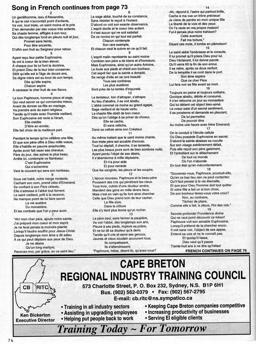 Published by Ronald Caplan on 1998/6/1 (149 reads)Song in French continues from page 73 Un gentilhomme, issu d'Alexandrie, A qui le ciel n'accordait point d'enfants, Va voir, tout triste, un saint moine et le prie D'en demander par des voeux tres ardents. Sa chaste femme, affligee k son tour, Qui des longtemps fond en pleurs nuit et jour, Promet sans feinte, Pour etre enceinte, D'offrir son fruit au Seigneur pour retour. 3 Ayant regu leur petite Euphrosine, Ils ont a coeur de la bien elever; A chaque jour ils lui font la doctrine, Et prient Dieu de la leur bien conserver. Bitot qu'elle est a I'age de douze ans, Sa digne mere est au bout de son temps; Des qu'elle expire, Chacun aspire A caresser le cher fruit de ses flancs. 4 Le bon Paphnuce, homme pieux et sage, Qui veut savoir ce qui conviendra mieux, Avant de donner sa fille en manage, Va prendre avis du saint religieux. Tandis qu'il traite avec I'humble vieillard, Son Euphrosine est ravie a I'ecart, Elle medite D'etre en ermite; Elle fait choix de la meilleure part. 5 Pendant le temps qu'on celebre une fete, Et que son pere offre a Dieu mille voeux, Elle s'habille en pauvre anachorete, Apres avoir fait raser ses cheveux. Pere du jour, des astres le plus beau, Arrete ici, contemple ce flambeau: C'est Euphrosine Qui s'achemine Vers le couvent qui sera son tombeau. 6 Sous cet habit, notre vierge modeste, Cachant son nom, prend celui d'Emerand. Se confiant a son Pere celeste, Elle s'adresse a I'abbe tout fervent. Le saint vieillard, pret a la recevoir, Ne manque point de lui faire savoir La vie austere Du monastere, Et les combats que I'on y peur avoir. 7 "Ah! mon cher pere, ajoute notre sainte, J'ai prepare mon coeur et mon esprit. Je ne ferai jamais la moindre plainte Lorsqu'il faudra souffrir pour Jesus-Christ. Depuis longtemps mon ame a dit adieu A ce qui peut deplaire aux yeux de Dieu. Je ne desire Qu'un long martyre; Recevez-moi, par grace, en ce saint lieu." Le sage abbe, louche de sa Constance, Sans resister le regoit a I'instant. D'abord on volt son exacte observance, L'esprit docile et le coeur tres ardent. II n'est aucun qui ne soit satisfait De ce novice en qui tout est parfait. Chacun contemple Son rare exemple, Et chacun veut le suivre en ce qu'il fait. 9 L'esprit malin represente au saint moine Combien son pere a de biens et d'honneurs. Mais Euphrosine, ainsi qu'un autre Antoine, Le foule aux pieds et cherit son bonheur. Cet esprit tier que la sainte a dompte, Se venge d'elle en sa rare beaute: Tous ses confreres Les plus austeres Sont pres de lui tentes d'impurete. 10 Le tentateur, loin d'attraper, s'attrape: Au lieu d'abattre, il se voit abattu. L'abbe commet ce moine au grand agape, Sage vieillard et de haute vertu. La chaste fille obeit de bon coeur. Des qu'on I'oblige a se priver du choeur, Elle se cache, Et sans relache, Dans sa cellule aime son Createur. 11 Au meme instant que le saint moine chante, Son triste pere est accable d'ennuis; Tout lui deplait, il cherche, il se lamente, Les plus beaux jours sont de bien sombres nuits. Ayant perdu I'objet de ses desirs, II s'abandonne a mille deplaisirs, Et n'a pour aide Et pour remede Que les sanglots, les pleurs et les soupirs. 12 L'epoux nouveau, Paphnuce et le beau-pere Poussent des oris qui penetrent les cieux. Tous trois, outres d'une douleur amere, Mandent des gens en mille divers lieux. Mais c'est en vain qu'ils font ainsi chercher Celle que Dieu prend soin de leur cacher. La fille sure, Dans la cloture Elle s'y tient plus ferme qu'un rocher. 13 Le pere seul, sans former la paupiere, Va voir I'abbe, des longtemps son ami, Pleure a ses pieds, implore sa priere, Et ne lui dit sa douleur qu'a demi. Tandis qu'il crie et serre ses genoux, Jeunes et vieux soudain accourent tous. lis compatissent, Ils s'attendrissent: "Paphnuce, helas, disent-ils, qu'avez-vous? 14 -Ah, repond-il, I'astre qui partout brille. Cache a ma vue un trone precieux! Je viens de perdre en mon unique fille La liberte de la voix et des yeux: On I'a ravie en ma propre maison! Fut-il jamais plus noire trahison? Cette aventure Fait ma torture." Disant ces mots, il tombe en pamoison! 15 Le saint abbe I'embrasse et le console, II lui promet qu'il priera Dieu pour lui. Dieu I'eclairant, il lui donne parole Qu'il verra tot la fin de son ennui. II se retire, apres ce doux renfort; De la tempete il se croit dans le port. Son ame espere Que ce cher Pere Lui fera voir sa fille avant sa mort. 16 Toujours en peine et toujours solitaire, Quoique abattu, debile et consume, II s'en retourne un jour au monastere Qui lui detient cet object bien-aime. Le coeur saisi d'un secret sentiment, II se prosterne et demande en pleurant, De lui permettre De pouvoir etre Au moins une heure avec frere Emerand. 17 On le conduit a I'etroite cellule Ou Dieu possede Euphrosine en secret. D'abord la sainte abaisse sa cuculle Sur son visage extremement defait. Puis elle regoit son pere gaiement, Et I'entretient sur le detachement De tout ce monde Ou Ton n'abonde En tout etat qu'en mecontentement. 18 "Souvenez-vous, Paphnuce, poursuit-elle, Qu'en ce bas lieu rien ne peut contenter; Qu'il faut penser a la vie eternelle, Et que pour Dieu l'homme doit tout quitter. Si votre fille a fait un si bon choix, De son bonheur feriez-vous votre croix? Non, au contraire, Tachez de plaire, Comme elle a fait, a Jesus, Roi des rois." 19 Secrets profonds! Providence divine Qui ne veut point decouvrir ce tresor! Paphnuce voit son aimable Euphrosine, Lorsqu'il pretend de la chercher encor. II voit sans voir, I'object de ses appas, Entend sa voix et ne le connait pas. Et quoiqu'il fasse, Dieu veut qu'il passe Trente-huit ans a ne dire qu'helas! FRENCH CONTINUES ON PAGE 76 Ken Bickerton Executive Director CAPE BRETON REGIONAL INDUSTRY TRAINING COUNCIL 573 Charlotte Street, P. O. Box 232, Sydney, N.S. B1P 6H1 Bus. (902) 562-0379 • Fax:(902)567-2795 E-mail: [email protected] • Training in all industry sectors • Keeping Cape Breton companies competitive 