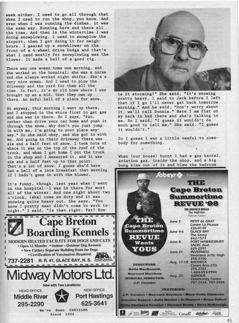 week either. I used to go all through that when I used to run the shop, you know. And even when I was running the dishes, it was the same way. Running here and there all the time. And then in the wintertime I was doing snowplowing. I used to snowplow the airport, then I got doing it for neigh? bours. I geared up a snowblower on the front of a 4-wheel drive Dodge and that's what I used mostly for snowplowing was the blower. It made a hell of a good rig. 'S.' .''', ->' 1% There was one woman home one morning, and she worked at the hospital: she was a nurse and she always worked night shifts. She's a very nice woman. And I used to plow the driveway and the yard for them all the time. In fact, it's my old home where I was brought up as a kid, that they own up there. An awful hell of a place for snow. So an3rway, this morning I went up there, and I stopped in the store first to get gas and she was in there. So I says, "Pat, rather than drive your car home and push it through the snow, why don't you just jump in with me, I'm going to your place any? way." So she said okay, and she got in with me. And going in their driveway there was six and a half feet of snow. I took note of where it was on the top of the roof of the truck, and when I got home I put the truck in the shop and I measured it, and it was six and a half feet up to that point. That's a lot of snow. I guess she'd have had a hell of a late breakfast that morning if I hadn't gone in with the blower. It's funny, though, last year when I went in the hospital--I was in there for most all of the winter. And one night about two o'clock, (she) come on duty and it was snowing quite heavy out. She says, "You know I pretty near didn't come to work to? night." I said, "Is that right, Pat? How Cape Breton Boarding Kennels MODERN HEATED FACILITY FOR DOGS AND CATS • Open 12 Months • Indoor - Outdoor Dog Kennels • New Cattery Separate Building from the Dogs • Certification of Vaccination Required 737-2281 R- R- #i, glace bay, n. s. Midway Motors Ltd. Now with Two Ljocations: HEAD OFFICE '' NEW OFFICE Middle River wS Port Hastings 295-2290 625-3641 We've Been CHRYSLER Since 192 6 is it storming? pretty heavy. I said to Jack before i lert that if I go I'll never get back tomorrow morning." And he said, "Don't worry about it, we'll call Donnie." Here I am flat on my back in bed there and she's talking to me. So I said, "I guess it wouldn't do much good to call me." She said, "I guess it wouldn't." So I guess I was a little useful to some? body for something. When (our house) burnt I had a gas barrel, aviation gas, inside the shop, and a big bung blew out of it and blew the bedroom Cape Breton Simuiieirtliiie RE WE '08 iSumiMirtiiiie REVUE Wants THE CHRONICLE-HERALD The Mail-Star Platinum Partner June 3 PETIT de GRAT Centre La Picasse 226-0149 GLACE BAY The Savoy 842-1577 PORT HAWKESBURY SAERC Aud. 625-2591 INVERNESS Inverness Jr./Sr. High 258-3700 Aug. 17-18 BADDECK Centre Bras d'Or 295-2787, 1-888-993-9994 JUDIQUE Communtfy Centre 7872434, 7873404 June 4-6 June 8 June 21 Aug. 25