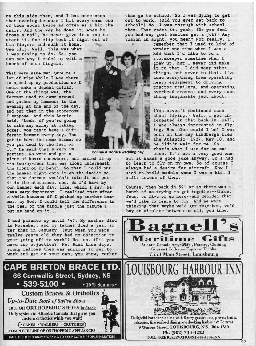 on this side then, and I had sore ones that evening because I hit every damn one of them about twice as often as I hit the nails. And the way he done it. when he drove a nail. he never give it a tap to start it. One clip took it right out of his fingers and sunk it home. One clip. Well, this was what I was trying to do. So. you can see why I ended up with a bunch of sore fingers. That very same man gave me a lot of tips while I was there to speed up my production so I could make a decent dollar. One of the things was. the foreman used to come around and gather up hammers in the evening at the end of the day, and put them in the storeroom I suppose. And this Bernie said. "Look, if you're going to make any money at making boxes, you can't have a dif? ferent hammer every day. You got to have the same hammer so you get used to the feel of it." He said that's very im? portant. So went and got a piece of board somewhere, and nailed it up --a two-by-four that was along underneath the front of my bench. So that I could put the hammer right onto it on the inside so that the foreman wouldn't take it and put it in the storeroom, see. So I'd have my ovm hammer each day, like, which I say, be? came very important. I realized that after a while because if I picked up another ham? mer, my God, I could tell the difference in the feel of the handle just the minute I put my hand on it.... I had parents up until '47. My mother died in November, and my father died a year af? ter that in January. (But when you were twelve years old they had no objection to your going off to work?) No, no. (Did you have any objection?) No. Back them days, young fellows then was anxious to get to work and get on your own, you know, rather than go to school. So I was dying to get out to work. (Did you ever get back to school?) No. I was through with school then. That ended it, yeah. (Do you feel you had any goal besides get a job?) Any vision in sight, you mean? Not really. I remember that I used to kind of wonder one time when I was a kid that I'd like to be a storekeeper sometime when I grew up, but I never did make it to that. I did many other things, but never to that. I've done everything from operating 'iBf* heavy equipment to driving *"" tractor trailers, and operating overhead cranes, and every damn thing imaginable just about. Donnie & Doris's wedding day (You haven't mentioned much about flying.) Well, I got in? terested in that back in--well, I was always interested in fly? ing. How else could I be? I was born on the day Lindbergh flew the Atlantic--1927, May 10, and he didn't wait for me. So that's what I use for an ex? cuse. It's not a very good one, but it makes a good joke anyway. So I had to learn to fly on my own. So of course I always had a desire for aircraft. Now I used to build models when I was a kid. I built dozens of them. Course, then back in 59' or so there was a bunch of us trying to get together--three, four, or five of us here--and decided that we'd like to learn to fly. And we were thinking that maybe we'd get together, we'd buy an airplane between us all, you know. Atlantic Canada Art, Crkfts, Pottery, Clothing Gourmet Coffee • Espresso Drinks ' 7553 Main Street, Louisbourg / CAPE BRETON BRACE LTD. 66 Cornwallis Street, Sydney, NS • 539-5100 • -10% Seniors- Custom Braces & Orthotics ?? Up'tO-Date stock of stylish Shoes 10% Off ORTHOPEDIC SHOES in Stock ' Only system in Atlantic Canada that gives you custom orthotics while you wait! ('CANES 'WALKERS ?CRUTCHES) COMPLETE LINE OF ORTHOPEDIC APPLIANCES /' LOUISBOURG HARBOUR INN isiuasua liiiiiffliiyniiyi m Delightful harbour-side inn with 8 cozy guestrooms, private baths, balconies, fine seafood dining, overlooking harbour & Fortress. 9 Warren Street., LOUISBOURG, N.S. BOA IMO Ph. (902) 733-3222 TOLL FREE RESERVATIONS 1-888-8888-INN
