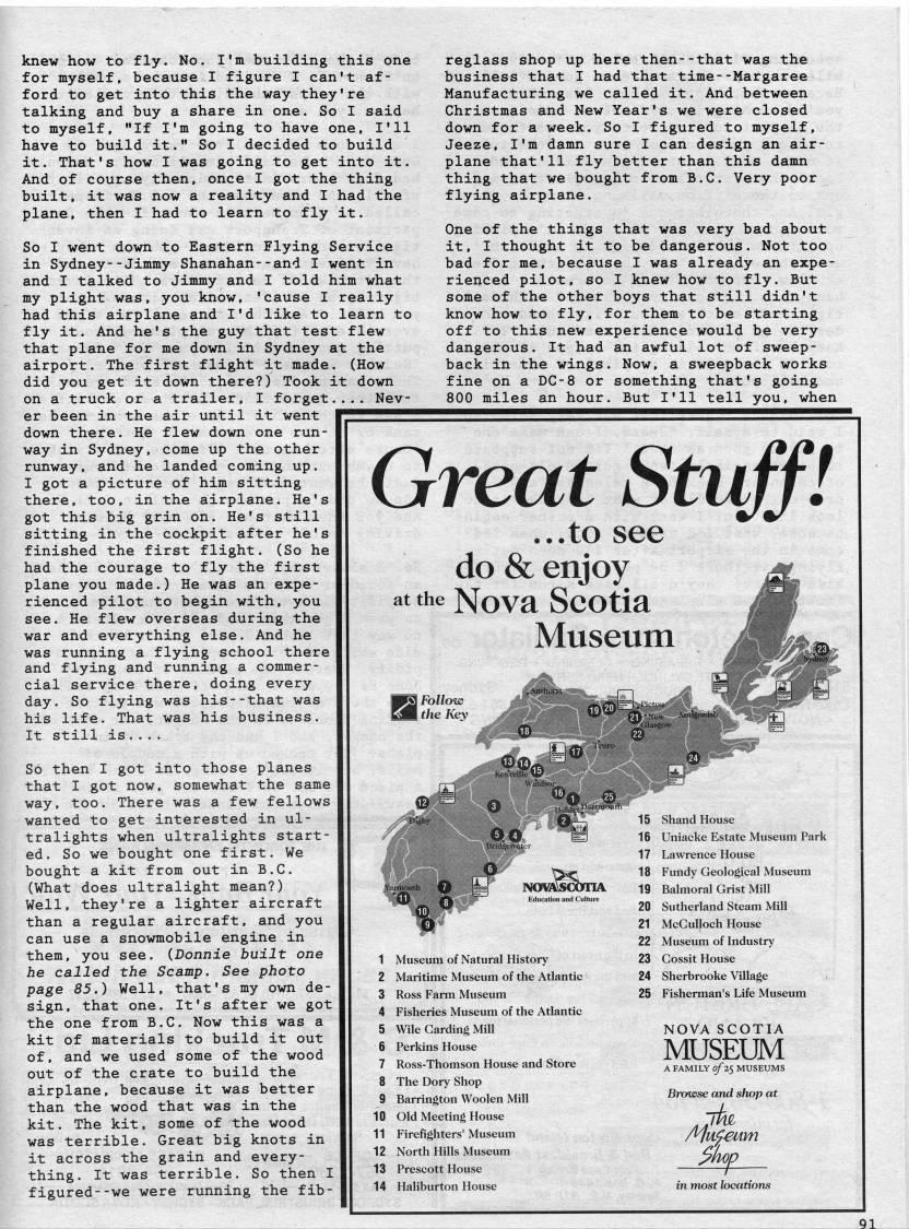knew how to fly. No. I'm building this one for myself, because I figure I can't af? ford to get into this the way they're talking and buy a share in one. So I said to myself, "If I'm going to have one, I'll have to build it." So I decided to build it. That's how I was going to get into it. And of course then, once I got the thing built, it was now a reality and I had the plane, then I had to learn to fly it. So I went down to Eastern Flying Service in Sydney--Jimmy Shanahan--and I went in and I talked to Jimmy and I told him what my plight was, you know, 'cause I really had this airplane and I'd like to learn to fly it. And he's the guy that test flew that plane for me down in Sydney at the airport. The first flight it made. (How did you get it down there?) Took it down on a truck or a trailer, I forget.... Nev? er been in the air until it went down there. He flew down one run? way in Sydney, come up the other runway, and he landed coming up. I got a picture of him sitting there, too, in the airplane. He's got this big grin on. He's still sitting in the cockpit after he's finished the first flight. (So he had the courage to fly the first plane you made.) He was an expe? rienced pilot to begin with, you see. He flew overseas during the war and everything else. And he was running a flying school there and flying and running a commer? cial service there, doing every day. So flying was his--that was his life. That was his business. It still is.... So then I got into those planes that I got now, somewhat the same way, too. There was a few fellows wanted to get interested in ul? tralights when ultralights start? ed. So we bought one first. We bought a kit from out in B.C. (What does ultralight mean?) Well, they're a lighter aircraft than a regular aircraft, and you can use a snowmobile engine in them, you see. (Donnie built one he called the Scamp. See photo page 85.) Well, that's my own de? sign, that one. It's after we got the one from B.C. Now this was a kit of materials to build it out of, and we used some of the wood out of the crate to build the airplane, because it was better than the wood that was in the kit. The kit, some of the wood was terrible. Great big knots in it across the grain and every? thing. It was terrible. So then I figured--we were running the fib? reglass shop up here then--that was the business that I had that time--Margaree Manufacturing we called it. And between Christmas and New Year's we were closed down for a week. So I figured to myself, Jeeze, I'm damn sure I can design an air? plane that'll fly better than this damn thing that we bought from B.C. Very poor flying airplane. One of the things that was very bad about it, I thought it to be dangerous. Not too bad for me, because I was already an expe? rienced pilot, so I knew how to fly. But some of the other boys that still didn't know how to fly, for them to be starting off to this new experience would be very dangerous. It had an awful lot of sweep- back in the wings. Now, a sweepback works fine on a DC-8 or something that's going 800 miles an hour. But I'll tell you, when Great Stuff 1 f ...to see do & enjoy at the Nova Scotia Museum ??' Follow ImMI the Key Tscfv''mx Education and Cult Museum of Natural History Maritime Museum of the Atlantic Ross Farm Museum Fisheries Museum of the Atlantic Wile Carding Mill Perkins House Ross-Thomson House and Store The Dory Shop 9 Barrington Woolen Mill 10 Old Meeting House Firefighters' Museum 15 Shand House 16 Uniacke Estate Museum Park Lawrence House Fundy Geological Museum Balmoral Grist Mill Sutherland Steam Mill McGuUoch House 22 Museum of Industry 23 Gossit House 24 Sherbrooke Village 25 Fisherman's Life Museum NOVA SCOTIA MUSEUM A FAMILY 0/2' MUSEUMS 11 12 North Hills Museum 13 Prescott House 14 Haliburton House Browse and shop at Aliif-eum in most locations Ql