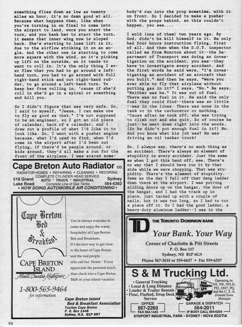 something flies down as low as twenty miles an hour, it's no damn good at all. Because what happens then, like when you're turning in on final to come into the airport to land, once you start the turn, and you bank her to start the turn, it means that inner wing now is sloped back. She's starting to lose lift in it, due to the airflow striking it on an an? gle. And the other one is starting to come more square with the wind, so it's picking up lift on the outside, so it tends to want to roll in. It's the only thing I ev? er flew that you had to go around a left- hand turn, you had to go around with full right-hand stick and out right-hand rud? der, to go around a left-hand turn. To keep her from rolling in, 'cause if she'd roll in she'd go in a spiral or something and kill you. So I didn't figure that was very safe. So, I said to myself, "Jeeze, I can make one to fly as good as that." I'm not supposed to be an engineer, so I got an old piece of calendar, back of a calendar, and I drew out a profile of what I'd like it to look like. So, I went with a pusher engine because, what I'd used to find, when I'd come in the airport after I'd been out flying, if there'd be people around, or kids around, they'd all make a run for the front of the airplane. I was scared some- Cape Breton Auto Radiator co RADIATOR HOSES • REPAIRING • CLEANING • RECORING c'oi- . COMPLETE CYLINDER HEAD SERVICE _ . 518 Grand 'uTO * truck * industrial bydney Lake Road Complete Line of Gas Tanks 564-6362 • NOW DOING AUTOMOBILE AIR CONDITIONING • (Eapp'lrrton 'nM'' Cape Breton Island ''S''IS'/'''''' You're always welcome to come and enjoy the warm hospitality of Cape Breton Bed and Breakfasts. It's the best way to get close to the heart of Cape Breton ' and the real people who call her 'Home.' If you appreciate the personal touch, then check into a Cape Breton B&B; on your island vacation. 1-800-565-9464 for information Cape Breton Island Bed & Breakfast Association Tourism Cape Breton P. 0. Box 1448 Sydney, N.S. BIP 6R7 body'd run into the prop sometime, with it on front. So I decided to make a pusher with the props behind, so this couldn't happen, you see.... I sold (one of them) two years ago. By God, didn't he kill himself in it. He only had four hours instruction flying, first of all. And then when the D.O.T. inspector called me from Moncton about it--the De? partment of Transport was doing an inves? tigation on the accident, you see--they have to investigate every accident. And the first words he said were, "I'm inves? tigating an accident of an aircraft that you built." And then he says, "Were you ever able to fly that airplane without putting gas in it?" I says, "No." He says, "Neither was he." It was out of fuel. There was no fuel in it. He said the only fuel they could find--there was so little --was in the lines. There was none in the tank or in the carburetor or nothing. 'Cause after he took off, she was trying to climb out and she quit. So of course he just--he went down right into the woods. (So he didn't put enough fuel in it?) No. And you know what his job was? He was driving an oil tanker truck! So, I always say, there's no such thing as an accident. There's always an element of stupidity in every accident. Just the same as when I got this hand off, see. There's no way that I should have run it by that side while we were chopping. That was stu? pidity. There's the element of stupidity. Same as the day I fell off that dang ladder down there at the airport. I was putting sliding doors up on the hangar, the door of the hangar, and I had the track up in place, just tacked up with a couple of nails, but it was too long, so I had to cut a piece off it. So I had the good ladder, a heavy-duty aluminum ladder--I was in the 1D THE IbROINTTO-DOMINION BANK Your Bank. Your Way Comer of Charlotte & Pitt Streets P. O. Box 117 Sydney, NS B1P6G9 Phone 567-3610 or 539-6637 • Fax 539-6337 S & M Trucking Ltd. • General Trucking • Local & Long Distance • Loader & Trailer Rentals Float, Flatbed, Drop Deck Service r- OFFICE 1 567-2260 FAX 564-1443 • ' LGfi IF Operating in: NS, NB, NFLD, PEI, ONT, PQ, and the U. S. A. Donald Sives Manager GARAGE & DISPATCH 564-2011 BUSY CALL 564-0204 - ;j SYDPORT INDUSTRIAL PARK • SYDNEY • NOVA SCOTIA 92
