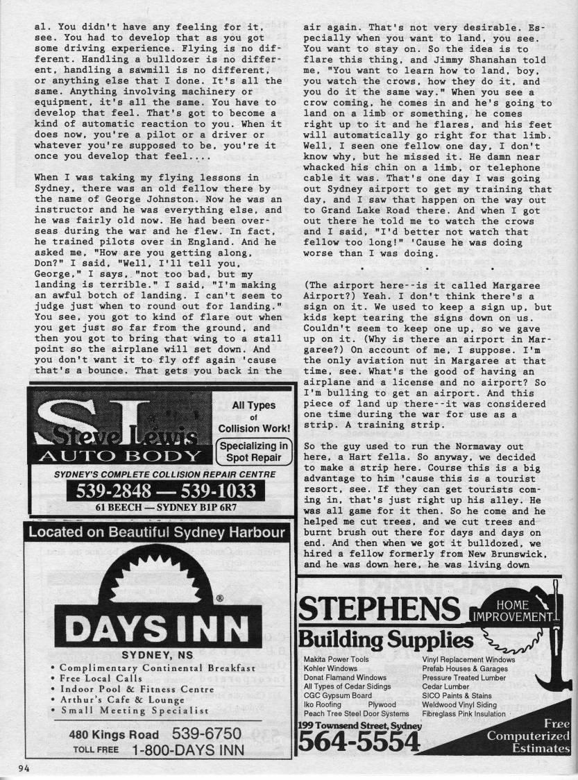 al. You didn't have any feeling for it, see. You had to develop that as you got some driving experience. Flying is no dif? ferent. Handling a bulldozer is no differ? ent, handling a sawmill is no different, or anything else that I done. It's all the same. Anything involving machinery or equipment, it's all the same. You have to develop that feel. That's got to become a kind of automatic reaction to you. When it does now, you're a pilot or a driver or whatever you're supposed to be, you're it once you develop that feel.... When I was taking my flying lessons in Sydney, there was an old fellow there by the name of George Johnston. Now he was an instructor and he was everything else, and he was fairly old now. He had been over? seas during the war and he flew. In fact, he trained pilots over in England. And he asked me, "How are you getting along, Don?" I said, "Well, I'll tell you, George," I says,."not too bad, but my landing is terrible." I said, "I'm making an awful botch of landing. I can't seem to judge just when to round out for landing." You see, you got to kind of flare out when you get just so far from the ground, and then you got to bring that wing to a stall point so the airplane will set down. And you don't want it to fly off again 'cause that's a bounce. That gets you back in the All Types of Collision Work! Specializing in Spot Repair SYDNEY'S COMPLETE COLLISION REPAIR CENTRE 539-2848 • 539-1033 61 BEECH • SYDNEY BIP 6R7 Located on Beautiful Sydney Harbour r DAYSIN N SYDNEY, NS CorapHmentary Continental Breakfast Free Local Calls Indoor Pool & Fitness Centre Arthur's Cafe 8c Lounge Small Meeting Specialist 480 Kings Road 539-6750 TOLLFREE 1-800-DAYS INN air again. That's not very desirable. Es? pecially when you want to land, you see. You want to stay on. So the idea is to flare this thing, and Jimmy Shanahan told me, "You want to learn how to land, boy, you watch the crows, how they do it, and you do it the same way." When you see a crow coming, he comes in and he's going to land on a limb or something, he comes right up to it and he flares, and his feet will automatically go right for that limb. Well, I seen one fellow one day, I don't know why, but he missed it. He damn near whacked his chin on a limb, or telephone cable it was. That's one day I was going out Sydney airport to get my training that day, and I saw that happen on the way out to Grand Lake Road there. And when I got out there he told me to watch the crows and I said, "I'd better not watch that fellow too long!" 'Cause he was doing worse than I was doing. (The airport here--is it called Margaree Airport?) Yeah. I don't think there's a sign on it. We used to keep a sign up, but kids kept tearing the signs down on us. Couldn't seem to keep one up, so we gave up on it. (Why is there an airport in Mar? garee?) On account of me, I suppose. I'm the only aviation nut in Margaree at that time, see. What's the good of having an airplane and a license and no airport? So I'm bulling to get an airport. And this piece of land up there--it was considered one time during the war for use as a strip. A training strip. So the guy used to run the Normaway out here, a Hart fella. So anyway, we decided to make a strip here. Course this is a big advantage to him 'cause this is a tourist resort, see. If they can get tourists com? ing in, that's just right up his alley. He was all game for it then. So he come and he helped me cut trees, and we cut trees and burnt brush out there for days and days on end. And then when we got it bulldozed, we hired a fellow formerly from New Brtmswick, and he was down here, he was living down STEPHENS Building Supplies K.,' Makita Power Tools Kohler Windows Donat Flamand Windows All Types of Cedar Sidings CGC Gypsum Board Iko Roofing Plywood Peach Tree Steel Door Systems 199 Townsend Street, Sydney 564-5554 Vinyl Replacement Windows Prefab Houses & Garages Pressure Treated Lumber Cedar Lumber SICO Paints & Stains Weldwood Vinyl Siding Fibreglass Pink Insulation