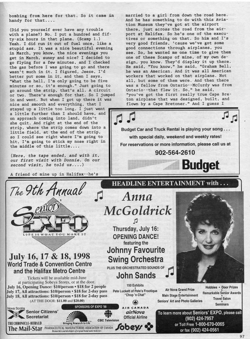 bombing from here for that. So it came in handy for that.... (Did you yourself ever have any trouble with a plane?) No. I put a hundred and fif? ty-six hours in that plane. (Scamp 1.) Yeah. I did run it out of fuel once, like a stupid ass. It was a nice beautiful evening in March, you know, the nice evenings you get in March, sunny and nice? I decided to go flying for a few minutes, and I checked the gas before I was going to go and there wasn't much in it. I figured, Jeeze, I'd better put some in it, and then I says, "What the hell, I'm only going to be five minutes or so, it's enough." Just going to go around the strip, that's all. A circuit or two. There's enough for that. So I jumped in and went. But when I got up there it was nice and smooth and everything, that I stayed up a little too long. I just went a little further than I should have, and on approach coming into land, didn't she quit. And right at the end of the strip, where the strip comes down into a little field, at the end of the strip, so I could see right where I'm going to hit, I'm going to stick my nose right in the middle of this little.... married to a girl from down the road here. And he has something to do with this Avia? tion Museum they've got at the airport there, just across the road from the air? port at Halifax. So he's one of the execu? tives or something on that. So him and I's very good friends, 'cause we've got some good connections through airplanes, you see. So, he wanted me one time to give them one of these Scamps of mine, of my own de? sign, you know. They'd display it up there. He said, "You know," he said, "Graham Bell, he was an American. And it was all American workers that worked on that airplane. Not all, but some of them were. And then there was a fellow from Ontario--McCurdy was from Ontario--that flew it. So," he said, "you've got the first really true Cape Bre? ton airplane that was designed, built, and flown by a Cape Bretoner." And I guess I (Here, the tape ended, and with it, our first visit with Donnie. On our second visit, he told us....) A friend of mine up in Halifax--he's pji Budget Car and Truck Rental is playing your song ... with special daily, weekend and weekly rates! For reservations or more information, please call us at 902-564-2610 Budget HEADLINE ENTERTAINMENT with ''.''b>' McGoldrick July 16,17 & 18,1998 World Trade & Convention Centre and the Halifax Metro Centre Tickets will be available mid-June at participating Sobeys Stores, or at the door. July 16, Opening Dance: $10/person • $18 for 2 people Ijuly 17, All attractions: $10/person • $18 for 2-day pass |july 18, All attractions: $10/person • $18 for 2-day pass (AT THE DOOR: $11.00 and $20.00) Thursday, July 16: OPENING DANCE! featuring the Johnny Favourite Swing Orchestra PLUS THE ORCHESTRATED SOUNDS OF John Sands Pete Luckett of Pete's Frootlque "Chop 'n Chat" SPONSORS OF EXPO'98 Aiit Nova Scotia "'(''' Senior Citizens' ''ffftk 'W' Secretariat .'J'MH' THECHRONICLE-HERlD BrinlingWafch to life" ' L • ThP M;iil-St;ir PHARiMACEUnCAl MANUFACU'RERS association of CAN'ADA JOX'''X 'J' CBC Television AIR CANADA airNova Official Airline Air Nova Grand Prize Main Stage Entertainment Seniors' Art and Photo Galleries Hobbies • Door Prizes Remarkable Senior Awards Travel Salon Seminars To learn more about Seniors' EXPO, please call (902)424-7957 orToll Free 1-800-670-0065 or fax (902) 424-0561