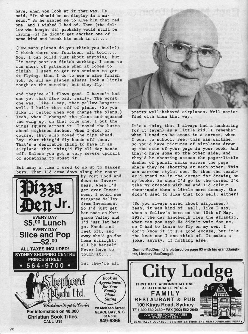 have, when you look at it that way. He said, "It should be on display in a mu? seum." So he wanted me to give him that red one. And I wished I had of. Then (the fel? low who bought it) probably would still be living--if he didn't get another one of some kind and break his neck in it.... (How many planes do you think you built?) I think there was fourteen, all told.... Now, I can build just about anything, but I'm very poor on finish working. I seem to run short of patience when it comes to finish. I seem to get too anxious to get it flying, than I do to see a nice finish job. So all my planes always look a little rough on the outside, but they fly! And they've all flown good. I haven't had one yet that flew bad, really. The worst one was, like I say, that yellow Ranger-- well, I built that off of plans. (So you like it better when you change the plans.) Yeah, when I changed the plans and squared the wing up, on that blue one. I put the wings square across it. I moved the butts ahead eighteen inches. When I did, of course, that also moved the tips ahead. Boy, that thing'd fly hands off then. That's a desirable thing to have in an airplane--that thing'd fly all day hands off. Unless you got a very severe updraft or something to upset it. But many a time I used to bury. Then I'd come down EVERY DAY $5.00 Lunch EVERY DAY Slice and Pop • $2-00 ALL TAXES INCLUDED! SYDNEY SHOPPING CENTRE PRINCE STREET • 564-9700 • go up to Hawkes- along the coast by Port Hood and down to Inver? ness. When I'd get over Inver? ness, I could see Margaree Valley from Inverness. So I'd just get her nose on Mar? garee Valley and I'd just let her go. Hands and feet off, and away she'd go for home straight, all by herself. Never have to touch it.... I But they're all For information on 48,000 Christian Book Titles, CALL US! 23 McKeen Street GLACE BAY, N. S. B1A5B9 849-6365 / pretty well-behaved airplanes. Well satis? fied with them that way. It's a thing that I always had a hankering for it (even) as a little kid. I remember when I used to be stood in a corner, when I went to school. See, this was wartime. So you'd have pictures of airplanes drawn up the side of your page in your book. And they'd have some up the other side, and they'd be shooting across the page--little dashes of pencil marks across the page where they're shooting at each other. This was wartime style, see. So then the teach? er 'd stand me in the corner for drawing on my books. So when I'd go to the corner I'd take my crayons with me and I'd colour them--made them a little more dressy. She didn't used to like that too well, either! (So you always cared about airplanes.) Yeah, it was kind of--well, like I say, when a fellow's born on the 10th of May, 1927, the day Lindbergh flew the Atlantic, what can you say? He didn't wait for me, so I had to learn to fly on my own. I don't know if it's a good excuse, but it's the best one I can think of. It makes a joke, anyway, if nothing else. Donnie MacDermid is pictured on page 93 with his granddaugh? ter, Lindsay MacDougall. City Lodge FIRST RATE ACCOMMODATIONS AT AFFORDABLE PRICES FAMILY RESTAURANT & PUB 100 Kings Road, Sydney IF 1-800-580-2489 • FAX (902) 562-2640 CENTRALLY LOCATED, 30 MINUTES FROM THE NEWFOUNDLAND FERRYJ