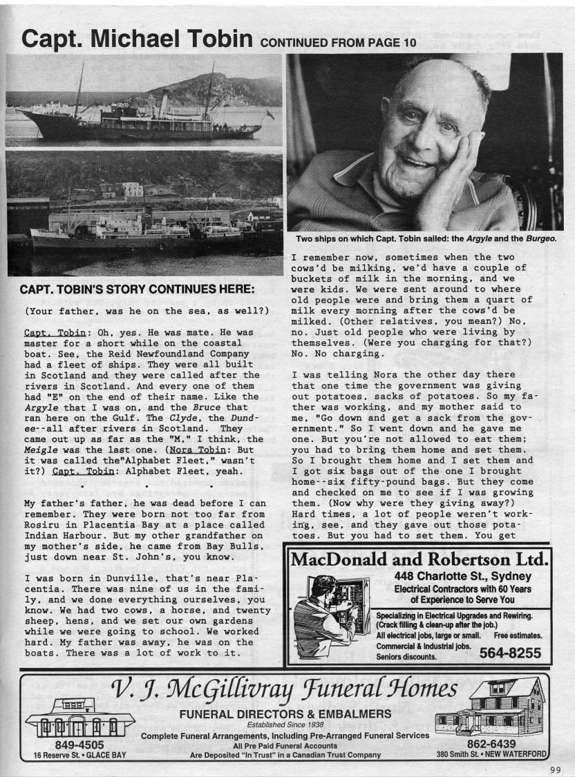 Capt. Michael Tobin continued from page CAPT. TOBIN'S STORY CONTINUES HERE: (Your father, was he on the sea, as well?) Capt. Tobin: Oh, yes. He was mate. He was master for a short while on the coastal boat. See, the Reid Newfoundland Company had a fleet of ships. They were all built in Scotland and they were called after the rivers in Scotland. And every one of them had "E" on the end of their name. Like the Argyle that I was on, and the JSruce that ran here on the Gulf. The Clyde, the Dund? ee--all after rivers in Scotland. They came out up as far as the "M," I think, the Meigle was the last one. (Nora Tobin: But it was called the"Alphabet Fleet," wasn't it?) Capt. Tobin: Alphabet Fleet, yeah. My father's father, he was dead before I can remember. They were born not too far from Rosiru in Placentia Bay at a place called Indian Harbour. But my other grandfather on my mother's side, he came from Bay Bulls, just down near St. John's, you know. I was born in Dunville, that's near Pla? centia. There was nine of us in the fami? ly, and we done everything ourselves, you know. We had two cows, a horse, and twenty sheep, hens, and we set our own gardens while we were going to school. We worked hard. My father was away, he was on the boats. There was a lot of work to it. Two ships on which Capt. Tobin sailed: the Argyle and the Burgeo. I remember now, sometimes when the two cows'd be milking, we'd have a couple of buckets of milk in the morning, and we were kids. We were sent around to where old people were and bring them a quart of milk every morninrg after the cows'd be milked. (Other relatives, you mean?) No, no. Just old people who were living by themselves. (Were you charging for that?) No. No charging. I was telling Nora the other day there that one time the government was giving out potatoes, sacks of potatoes. So my fa? ther was working, and my mother said to me, "Go down and get a sack from the gov- , ernment." So I went down and he gave me one. But you're not allowed to eat them; you had to bring them home and set them. So I brought them home and I set them and I got six bags out of the one I brought home--six fifty-pound bags. But they come and checked on me to see if I was growing them. (Now why were they giving away?) Hard times, a lot of people weren't work? ing, see, and they gave out those pota? toes. But you had to set them. You get MacDonald and Robertson Ltd. 448 Charlotte St., Sydney Electrical Contractors with 60 Years of Experience to Sen'e You Specializing in Electrical Upgrades and Rewiring. (Oracle filling & clean-up after the job.) All electrical jobs, large or small. Free estimates. Commercial & Industrial jobs, r-g'm qocc Seniors discounts. 004-oZ00 /-tngBt • I 1/. J. McQi[[ivray JuneraCOiomes Hwm'-'> 849-4505 16 Reserve St.'GLACE BAY FUNERAL DIRECTORS & EMBALMERS Established Since 1938 Complete Funeral Arrangements, Including Pre-Arranged Funeral Services All Pre Paid Funeral Accounts Are Deposited "In Trust" in a Canadian Trust Company 862-6439 380 Smith St.?NEW WATERFORD '