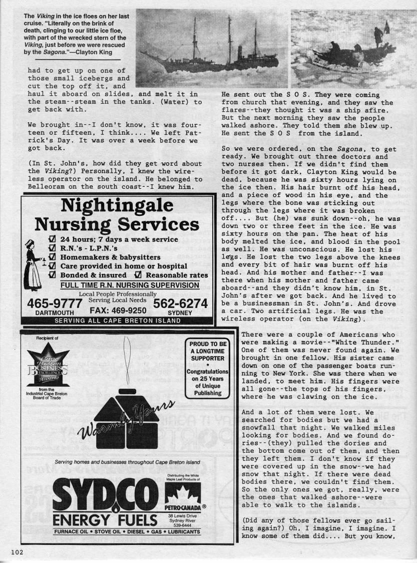 The Viking in the ice floes on her last cruise. "Literally on the brink of death, clinging to our little ice floe, with part of the wrecked stern of the Viking, just before we were rescued by the Sagona." • Clayton King had to get up on one of those small icebergs and cut the top off it, and haul it aboard on slides, and melt it in the steam--steam in the tanks. (Water) to get back with. We brought in--I don't know, it was four? teen or fifteen, I think.... We left Pat? rick's Day. It was over a week before we got back. (In St. John's, how did they get word about the Viking?) Personally, I knew the wire? less operator on the island. He belonged to Belleoram on the south coast--I knew him. Nightingale Nursing Services {21 24 hours; 7 days a week service {2 R.N.'s - L.P.N.'s ex ' Homemakers & babysitters '"- {21 Care provided in home or hospital {21 Bonded & insured {21 Reasonable rates FULL TIME R.N. NURSING SUPERVISION Local People Professionally 465-9777 'T,"''r:'T=t 562-6274 DARTMOUTH FAX: 469-9250 SYDNEY SERVING ALL CAPE BRETON SLAND He sent out the SOS. They were coming from church that evening, and they saw the flares--they thought it was a ship afire. But the next morning they saw the people walked ashore. They told them she blew up. He sent the SOS from the island. So we were ordered, on the Sagona, to get ready. We brought out three doctors and two nurses then. If we didn't find them before it got dark, Clayton King would be dead, because he was sixty hours lying on the ice then. His hair burnt off his head, and a piece of wood in his eye, and the legs where the bone was sticking out through the legs where it was broken off.... But (he) was sunk down--oh, he was down two or three feet in the ice. He was sixty hours on the pan. The heat of his body melted the ice, and blood in the pool as well. He was unconscious. He lost his le'gs. He lost the two legs above the knees and every bit of hair was burnt off his head. And his mother and father--I was there when his mother and father came aboard--and they didn't know him, in St. John's after we got back. And he lived to be a businessman in St. John's. And drove a car. Two artificial legs. He was the wireless operator (on the Viking). Serving homes and businesses throughout Cape Breton Island PROUD TO BE A LONGTIME SUPPORTER Congratulations on 25 Years of Unique Publishing Distributing the White ''''''m ''mm''''' '''' ,'''' Maple Leaf Products of SYDEOi' ENERGY FUELS 'r FURNACE OIL • STOVE OIL • DIESEL • GAS • LUBRICANTS There were a couple of Americans who were making a movie--"White Thunder." One of them was never found again. We brought in one fellow. His sister came down on one of the passenger boats run? ning to New York. She was there when we landed, to meet him. His fingers were all gone--the tops of his fingers, where he was clawing on the ice. And a lot of them were lost. We searched for bodies but we had a snowfall that night. We walked miles looking for bodies. And we found do? ries- -(they) pulled the dories and the bottom come out of them, and then they left them. I don't know if they were covered up in the snow--we had snow that night. If there were dead bodies there, we couldn't find them. So the only ones we got, really, were the ones that walked ashore--were able to walk to the islands. (Did any of those fellows ever go sail? ing again?) Oh, I imagine, I imagine. I know some of them did.... But you know.