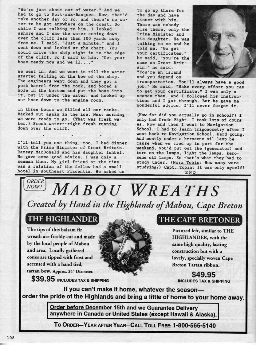 We're just about out of water. And we had to go to Port-aux-Basques. Now, that'd take another day or so, and there's no wa? ter to be got anywhere on the coast. So while I was talking to him, I looked ashore and I saw the water coming down over the cliff less than 100 yards away from me. I said, "Just a minute," and I went down and looked at the chart. You could drive the ship right in to the edge of the cliff. So I said to him, "Get your hose ready now and we'll...." We went in. And we went in till the water started falling on the bow of the ship. The engineers went down and they got a pork barrel from the cook, and bored a hole in the bottom and put the hose into it, put it under the water, and hooked up our hose down to the engine room. In three hours we filled all our tanks. Backed out again in the ice. Next morning we were ready to go. (That was fresh wa? ter.) Fresh water--right fresh running down over the cliff. I'll tell you one thing, too, I had dinner with the Prime Minister of Great Britain. Ramsay MacDonald and his daughter Ishbel. He gave some good advice. I was only a seaman then. My girl friend at the time was a relation of the fellow had a small hotel in southeast Placentia. He asked us to go up there for the day and have dinner with him. There was nobody else there, only the Prime Minister and his daughter. He was talking to me and he told me, "Go get your certificates," he said, "you're the same as Great Brit? ain," he said. "You're an island and you depend on transportation. You'll always have a good job." He said, "Make every effort you can to get your certificate." I was only a seaman then. And I followed his instruc? tions and I got through. But he gave me wonderful advice, I'll never forget it. (How far did you actually go in school?) I only had Grade Eight. I took lots of cours? es. Now and then I went to Navigation School. I had to learn trigonometry after I went back to Navigation School. Hard going. And mostly under a kerosene oil lamp be? cause when we tied up in port for the weekend, you'd put out the (generator) and turn on the lamps, light the lamps, kero? sene oil lamps. So that's what they had to study under. (Nora Tobin: How many were studying?) Capt. Tobin: It was only myself! END ORDER NOW! Mabou Wreaths Created by Hand in the Highlands ofMahoUy Cape Breton THE HIGHLANDER THE CAPE BRETONER The tips of this balsam fir wreath are freshly cut and made by the local people of Mabou and area. Locally gathered cones are tipped with frost and accented with a hand tied, tartan bow. Approx. 24" Diameter. $39.95 INCLUDES TAX & SHIPPING If you can't make it home, whatever the season • order the pride of the Highlands and bring a little of home to your home away. Pictured left, similar to THE HIGHLANDER, with the same high quality, lasting construction but with a lovely, specially woven Cape Breton Tartan ribbon. $49.95 INCLUDES TAX & SHIPPING Order before December 15th and we Guarantee Delivery anywhere in Canada or United States (except Hawaii & Alaska). To Order • Year after Year • Call Toll Free: 1-800-565-5140