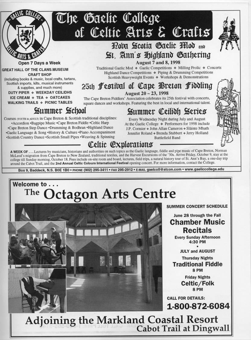 Open 7 Days a Week GREAT HALL OF THE CLANS.MUSEUM CRAFT SHOP (including books & music, local crafts, tartans, Scottish imports, kilts, musical instruments & supplies, and much more) DUTY PIPER WEEKDAY CEILIDHS ICE CREAM TEA OATCAKES WALKING TRAILS PICNIC TABLES 3SDi?a Scotia ??atlit Jfloir an' Bt, 'nn 5 3|lgftlan' ??atWnij August 7 and 8,1998 Traditional Gaelic Mod Gaelic Competitions Milling Frolic Concerts Highland Dance Competitions Piping & Drumming Competitions Scottish Heavyweight Events Workshops & Demonstrations 25t{) ftsiM of Cape 3vtun fOf'ling August 20 ~ 23,1998 The Cape Breton Fiddlers' Association celebrates its 25th festival with concerts, square dances and workshops. Featuring the best in local and international talent. gummtr 'cbool Courses (youth & adult) in Cape Breton & Scottish traditional disciplines: • Accordion 'Bagpipe Music 'Cape Breton Fiddle -Celtic Harp • Cape Breton Step Dance • Drumming & Bodhran • Highland Dance • Gaelic Language & Song • History & Culture • Piano Accompaniment • Scottish Country Dance • Scottish Small Pipes • Weaving & Spinning Every Wednesday Night during July and August At the Gaelic College Performers for 1998 include J.P. Cormier John Allan Cameron Slainte Mhath Jennifer Roland Brenda Stubbert Jerry Holland Battlefield Band Cdtft (Explorations A WEEK OF... Lectures by musicians, historians and authorities on such topics as the Gaelic language, fiddle and pipe music of Cape Breton, Norman McLeod's migration from Cape Breton to New Zealand, tradiUonal textiles, and the Harvest Excursions of the '30s. Arrive Friday, October 9, stay at the college till Sunday morning, October 18. Fees include on-site room and board, lectures, field trips, a natural history tour of St. Ann's Bay, a one-day trip around the Cabot Trail, and the 2nd Annual Celtic Colours International Festival opening concert. For more information, contact the College. Box 9, Baddeck, N.S. BOE 1B0 • phone (902) 295-3411 * FAX 295-2912 > E-MAIL [email protected] • www.gaellccollege.edu Welcome to The Octagon Arts Centre SUMMER CONCERT SCHEDULE June 28 through the Fall Chamber Music Recitals Every Sunday Afternoon 4:30 PM • JULY and AUGUST Thursday Nights Traditional Fiddle 8 PM Friday Nights Celtic/Folk 8 PM CALL FOR DETAILS: 1-800-872-6084 Adjoining the Markland Coastal Resort Cabot Trail at Dingwall