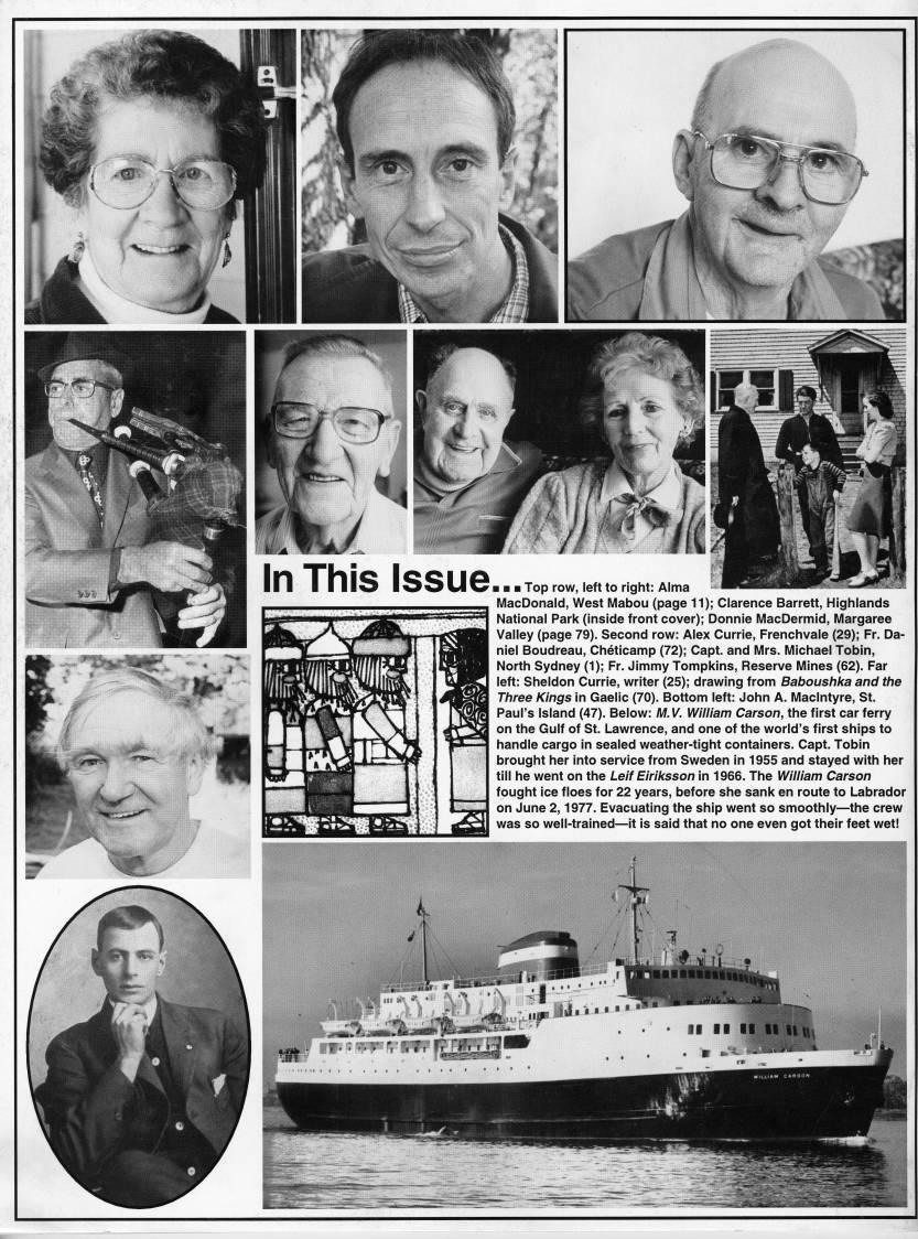 Published by Ronald Caplan on 1998/6/1 (135 reads)r H''-v; In This Issue ?? ?? ?? Top row, left to right: Alma MacDonald, West Mabou (page 11); Clarence Barrett, Highlands National Park (inside front cover); Donnie MacDermid, Margaree Valley (page 79). Second row: Alex Currie, Frenchvale (29); Fr. Da? niel Boudreau, Cheticamp (72); Capt. and Mrs. Michael Tobin, North Sydney (1); Fr. Jimmy Tompkins, Reserve Mines (62). Far left: Sheldon Currie, writer (25); drawing from Baboushka and the Three Kings in Gaelic (70). Bottom left: John A. Maclntyre, St. Paul's Island (47). Below: M.V. William Carson, the first car ferry on the Gulf of St. Lawrence, and one of the world's first ships to handle cargo in sealed weather-tight containers. Capt. Tobin brought her into service from Sweden in 1955 and stayed with her till he went on the Leif Eiriksson in 1966. The William Carson fought ice floes for 22 years, before she sank en route to Labrador on June 2,1977. Evacuating the ship went so smoothly • the crew was so well-trained • it is said that no one even got their feet wet!