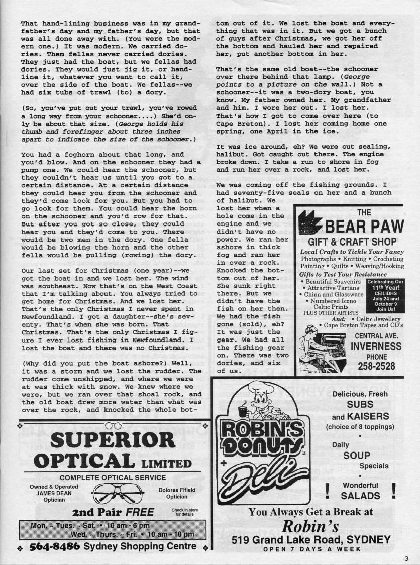 Published by Ronald Caplan on 1999/6/1 (970 reads)That hand-lining business was in my grand? father's day and my father's day, but that was all done away with. (You were the mod? ern one.) It was modern. We carried do? ries. Them fellas never carried dories. They just had the boat, but we fellas had dories. They would just jig it, or hand- line it, whatever you want to call it, over the side of the boat. We fellas--we had six tubs of trawl (to) a dory. (So, you've put out your trawl, you've rowed a long way from your schooner....) She'd on? ly be about that size. {George holds his thumb and forefinger about three inches apart to indicate the size of the schooner,) You had a foghorn about that long, and you'd blow. And on the schooner they had a pump one. We could hear the schooner, but they couldn't hear us until you got to a certain distance. At a certain distance they could hear you from the schooner and they'd come look for you. But you had to go look for them. You could hear the horn on the schooner and you'd row for that. But after you got so close, they could hear you and they'd come to you. There would be two men in the dory. One fella would be blowing the horn and the other fella would be pulling (rowing) the dory. Our last set for Christmas (one year) • 'we got the boat in euad we lost her. The wind was southeast. Now that's on the West Coast that I'm talking about. You always tried to get home for Christmas. And we lost her. That's the only Christmas I never spent in Newfoundland. I got a daughter • she's sev? enty. That's when she was bom. That Christmas. That's the only Christmas I fig? ure I ever lost fishing in Newfoundland. I lost the boat and there was no Christmas. (Why did you put the boat ashore?) Well, it was a stoirm and we lost the rudder. The rudder come unshipped, and where we were at was thick with snow. We knew where we were, but we ran over that shoal rock, and the old boat drew more water than what was over the rock, and knocked the whole bot? tom out of it. We lost the boat and every? thing that was in it. But we got a bunch of guys after Christmas, we got her off the bottom and hauled her and repaired her, put another bottom in her. That's the same old boat--the schooner over there behind that lamp. (George points to a picture on the wall,) Not a schooner--it was a two-dory boat, you know. My father owned her. 1' grandfather and him. I wore her out. I lost her. That's how I got to come over here (to Cape Breton). I lost her coming home one spring, one April in the ice. It was ice arotind, eh? We were out sealing, halibut. Got caught out there. The engine broke down. I take a run to shore in fog and run her over a rock, and lost her. We was coming off the fishing grounds. I had seventy-five seals on her and a bunch of halibut. We lost her when a hole come in the engine and we didn't have no power. We ran her ashore in thick fog and ran her in over a rock. Knocked the bot? tom out of her. She sunk right there. But we didn't have the fish on her then. We had the fish gone (sold), eh? It was just the gear. We had all the fishing gear on. There was two dories, and six of us. -ao- SUPERIOR OPTICAL UMITED Owned & Operated JAMES DEAN Optician COMPLETE OPTICAL SERVICE Dolores Fifield Optician : S64-8486 Sydney Shopping Centre > J'M THE K BEAR PAW GIFT & CRAFT SHOP Local Crafts to Tickle Your Fancy Photographs • Knitting • Crocheting Painting • Quilts • Weaving/Hooking Gifts to Test Your Resistance • Beautiful Souvenirs l??JJfJililHir.!JI • Attractive Tartans • China and Glassware | • Numbered Icono Celtic Prints PLUS OTHER ARTISTS And: • Celtic Jewellery Cape Breton Tapes and CD's CENTRAL AVE. INVERNESS PHONE 258-2528 11th Year! CEILIDHS July 24 and Delicious, Fresh SUBS and KAISERS (choice of 8 toppings) • Daily SOUP Specials I Wonderful ?? SALADS ! You Always Get a Break at Robin 's 519 Grand Lake Road, SYDNEY OPEN 7 DAYS A WEEK