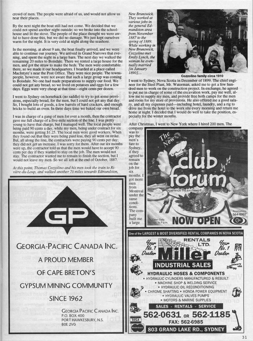 crowd of men. The people were afraid of us, and would not allow us near their places. By the next night the boat still had not come. We decided that we could not spend another night outside; so we broke into the school- house and ht the stove. The people of the place thought we were aw? ful to have done this, but we did no damage. We just kept ourselves warm for the night. It is very cold at night along the seashore. In the morning, at about 9 am, the boat finally arrived, and we were able to continue our journey. We arrived in Grand Narrows that eve? ning, and spent the night in a large barn. The next day we walked the remaining 20 miles to Boisdale. There we rented a large house for the men, and got the straw to make the beds. The men were comfortable there, so we made it our headquarters. I boarded at a place called Maclntyre's near the Post Office. They were nice people. The towns? people, however, were not aware that such a large group was coming to Boisdale. No one had made preparations to supply our food. We could not get any bread, so we lived on potatoes and eggs for a few days. Eggs were very cheap at that time • eight cents per dozen. I went to Sydney on horseback (no saddle) to fry to get some provi? sions, especially bread, for the men, but I could not get any that day. So, I bought lots of goods, a few barrels of hard crackers, and enough bricks to build an oven. In three days time we baked our own bread. I was in charge of a gang of men for over a month, then the confractor gave me full charge of a five-mile section of the Une. I was pretty young to have that charge, but I managed well. The local people were being paid 90 cents a day, while my men, being under contract for six months, were getting $1.25. The local men were good workers. When they found out that they were being paid less, they all went on sfrike. But, all along the line, the confractors were paying 90 cents per day; they did not get an increase. I was sorry for them. After our six months were up, the contractor told us that the men would have to accept 90 cents per day if they wanted to stay on the job. The men would not stay. The confractor wanted me to remain to finish the section, but I would not leave my men. So we all left at the end of October, 1887. At this point, Thomas Cozzolino and his men took the train to Ri- viere-du-Loup, and walked another 70 miles towards Edmundston, Georgia-Pacific Canada Inc. a proud member of cape breton's gypsum mining community SINCE 1962 Georgia Pacific Canada Inc. P.O. BOX 400 PORT HAWKESBURY, N.S. BOE 2va New Brunswick. They worked at various jobs in the general Ed? mundston area from November 1887 to the spring of 1889. While working in | New Brunswick, Cozzolino met Emily Lynch, the | woman he even? tually married [in January 1890].... Cozzolino family circa 1910 I went to Sydney, Nova Scotia in December of 1899. The chief engi? neer for the Steel Plant, Mr. Waterman, asked me to get a few hun? dred men to work on the construction project. In exchange, he agreed to put me in charge of some of the excavation work, pay me well, al? low me to supply my men, and provide free both camps for the men and room for my store of provisions. He also offered me a good sala? ry, and all my expenses paid • including hotel, laundry, and a rig to drive me from the hotel to the work site every morning and retum me home at night. I decided that I would do well to take the position, es? pecially for the winter months. After Christmas, I went to New York where I hired 200 men. The company was to pay the men's fare to Sydney, if they agreed to remain on the job for six months. I got more men from Monfreal under the same condi? tions. The com? pany I ''"'N' ir***' M 564-0907 e LARGEST & MOST DIVERSIFIED RENTAL COMPANIES IN NOVA SCOTIA HYDRAULIC HOSES & COMPONENTS • HYDRAULIC CYLINDERS MANUFACTURED & REBUILT • MACHINE SHOP & WELDING SERVICE ' • HYDRAULIC OIL RECONDITIONING " CHROME SHARING • HONDA POWER EQUIPMENT • HYDRAULIC VALVES PUMPS • MOTORS & MARINE SUPPLIES SALES - RENTALS - SERVICE '562-0631 OR '-''''' FAX: 562-6985 803 GRAND LAKE RD., SYDNEY 562-1185 •