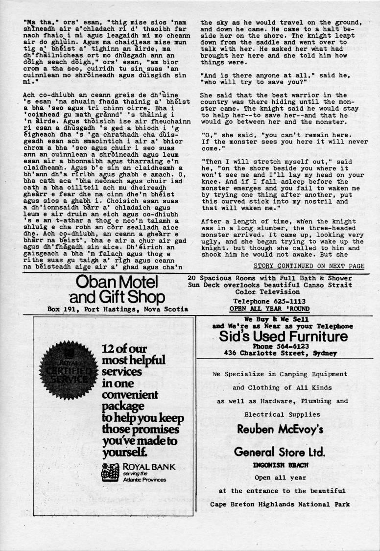 Ma tha, ors' esan, "thig mise sios 'nam shitneadh air a*chladach ri d* thaoibh far nach fhaic i mi agus leagaidh mi mo cheann air do ghluin. Agus ma chaidleas mise mun tig a' bheist a* tighinn an airde, ma dh'fhailnicheas ort mo dhusgadh ann an dBlgh seach doigh," ors* esan, "am bior crom a tha seo, cuiridh tu sin suas 'an cuinnlean mo shroineadh agus duisgidh sin Ach co-dhiubh an ceann greis de dh'uine • s esan 'na shuain fhada thainig a' bheist a bha *seo agus tri chinn oirre. Bha i • coimhead gu math grannd' 's thainig i • n llirde. Agus thoisich ise air fheuchainn ri esan a dhusgadh 's ged a bhiodh i 'g Eigheach dha 's 'ga chrathadh cha duis- geadh esan ach smaointich i air a' bhior chrom a bha 'seo agus chuir i seo suas ann an cuinnlean a shroineadh agus leum esan air a bhonnaibh agus tharraing e'n claidheamh. Agus b'e sin an claidheamh a bh'ann dh'a riribh a's ghabh e amach. 0, bha cath aca 'bha neonach agus chuir iad cath a bha oillteil ach mu dheireadh ghe'rr e fear dhe na cinn dhe'n bheist agus sios a ghabh i. Choisich esan suas a dh*ionnsaidh b'rr a* chladaich agus leum e air druim an eich agus co-dhiubh • s e an t-athar a thog e neo'n talamh a shluig e cha robh an cbrr sealladh aice dhe. Ach co-dhiubh, an ceann a ghelirr e bharr na beist', bha e air a chur air gad agus dh'fhagadh sin aice. Dh'I'irich an gaisgeach a bha 'm falach agus thog e rithe suas gu taigh a' righ agus ceann na beisteadh aige air a* ghad agus cha'n the sky as he would travel on the ground, and down he came. He came to a halt be? side her on the shore. The knight leapt down from the saddle and went over to talk with her. He asked her what had brought her here and she told him how things were. "And is there anyone at all," said he, "who will try to save you?" She said that the best warrior in the country was there hiding until the mon? ster came. The knight said he would stay to help her • to save her • and that he wbuld go between her and the monster. "0," she said, "you can't remain here. If the monster sees you here it will never come." "Then I will stretch myself out," said he, "on the shore beside you where it won't see rae and I'll lay my head on your knee. And if I fall asleep before the monster emerges ??ind you fail to waken me by trying one thing after another, put this curved stick into my nostril and that will waken me." After a length of time, wh'en the knight was in a long slumber, the three-headed monster arrived. It came up, looking very ugly, and she began trying to wake up the knight, but though she called to him and shook him he would not awake. But she STORY CONTINUED ON NEXT PAGE Oban Motel and Gift Shop Box 191, Pbrt Hastings, Nova Scotia 20 Spacious Rooms with Full Bath & Shower Sun Deck overlooks beautiful Canso Strait Color Television Telephone 625-1113 OPEN ALL YEAR 'ROUND We Buy & We Sell and We're as Near as your Telepbone Sids Used Furniture Rione 564-6123 436 Charlotte Street, Sydney 12 of our mosthelpfiil services inone convenient package to help you keep those promises youVemadeto yourselE ROYAL BANK servingthe Atlantic Provinces We Specialize in Camping Equipment and Clothing of All Kinds as well as Hardware, Plumbing and Electrical Supplies Reuben McEvoy's General Store Ltd. OfGONISH BBiCH Open all year at the entrance to the beautiful Cape Breton Highlands National Park