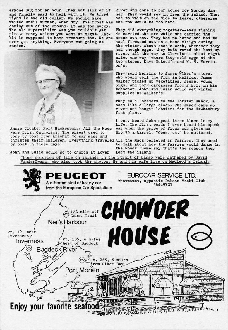Published by Ronald Caplan on 1977/8/1 (413 reads)eryone dug for an hour. They got sick of it and finally said to hell with it. We tried right in the old cellar. We should have waited until summer, when dry. The frost was coming out of the ground. It was too mucky. The old superstition was you couldn't get pirate money unless you went at night. Rab? bit is supposed to have treasure too. No one ever got anything. Everyone was going at random. / ' River and come to our house for Sunday din? ner. They would row in from the island. They had to wait on the tide to leave, otherwise the row would be too hard. They did everything together • even fishing. He carried the axe while she carried the cross-cut saw. They had no horse and had to haul firewood out on a hand sleigh during the winter. About once a week, whenever they had enough eggs, they both rowed the boat up river, all the way to Cleveland • about eight miles one way • where they sold eggs at the two stores, Dave McLeod's and W. R. Morris? on's. They sold herring to James Wlker's store, who would sell the fish in Halifax. James Walker picked up vegetables, geese, young pigs, and pork carcasses from P.E.I, in his schooner. John and Susan would get winter supplies at Walker's. They sold lobsters to the lobster smack, a boat like a large sloop. The smack came up river and bought lobsters for the Hawkesbury fish plant. I only heard John speak three times in my life. The first words I ever heard him speak Annie Cloake, Port Hawkesbury: All the Macs was when the price of flour was given as were Irish Catholics. The-priest used to $16.95 a barrel. "Gees, oh," he muttered, come by boat from Arichat to say mass and christen their children. Everything traveled All the Macs believed in fairies. They used by boat in those days. to talk about how the fairies would dance in the woods. Some say that's the reason they John and Susie would go to church at Lower left the island. These memories of life on islands in the Strait of Canso were gathered by David VanderZwagg, who also took the photos. He and his wife live on MacLeod's Island. PEUGEOT A different kind of luxury car from the European Car Specialists EUROCAR SERVICE LTD. Westmount, opposite Dobson Yacht Club 564-9721 Rt. 19, near Inverness / Inverness 1/2 mile off Cabot Trail Nell's Harbour lfOtfS?? Enjoy your favorite seafood