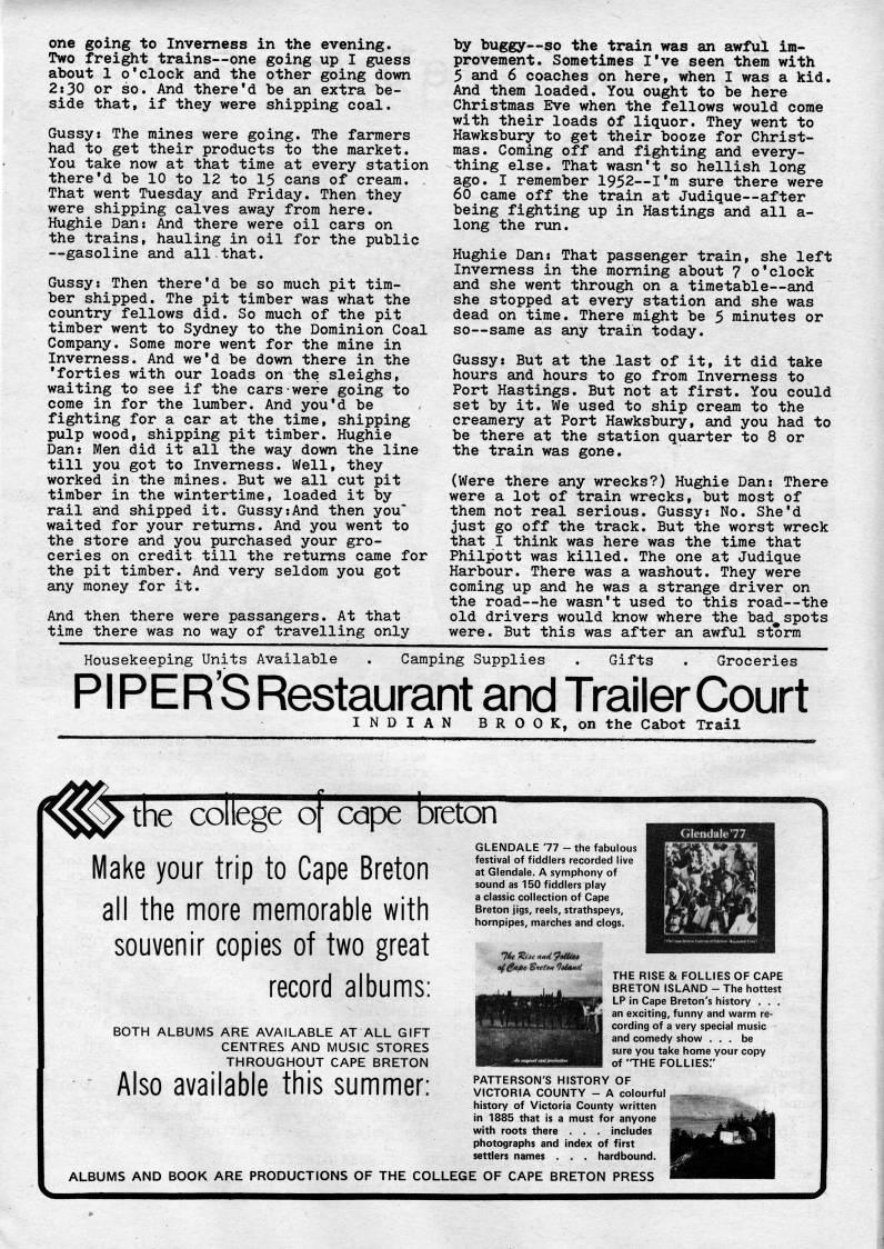 Published by Ronald Caplan on 1978/6/1 (639 reads)one going to Inverness in the evening. Two freight trains • one going up I guess about 1 o'clock and the other going down 2:30 or so. And there'd be an extra be? side that, if they were shipping coal. Gussy: The mines were going. The farmers had to get their products to the market. You take now at that time at every station there'd be 10 to 12 to 15 cans of cream. That went Tuesday and Friday. Then they were shipping calves away from here. Hughie Dan: And there were oil cars on the trains, hauling in oil for the public • gasoline and all that. Gussy: Then there'd be so much pit tim? ber shipped. The pit timber was what the country fellows did. So much of the pit timber went to Sydney to the Dominion Coal Company. Some more went for the mine in Inverness. And we'd be down there in the • forties with our loads on the sleighs, waiting to see if the cars were going to come in for the lumber. And you'd be fighting for a car at the time, shipping pulp wood, shipping pit timber. Hughie Dan: Men did it all the way down the line till you got to Inverness. Well, they worked in the mines. But we all cut pit timber in the wintertime, loaded it by rail a;nd shipped it. Gussy:And then you* waited for your returns. And you went to the store and you purchased your gro? ceries on credit till the returns came for the pit timber. And very seldom you got any money for it. And then there were passangers. At that time there was no way of travelling only by buggy • so the train was an awful im? provement. Sometimes I've seen them with 5 and 6 coaches on here, when I was a kid. And them loaded. You ought to be here Christmas Eve when the fellows would come with their loads df liquor. They went to Hawksbury to get their booze for Christ? mas. Coming off and fighting and every? thing else. That wasn't so hellish long ago, I remember 1952 • I'm sure there were 60 came off the train at Judique • after being fighting up in Hastings and all a- long the run. Hughie Dan: That passenger train, she left Inverness in the morning about 7 o'clock and she went through on a timetable • and she stopped at every station and she was dead on time. There might be 5 minutes or so • same as any train today. Gussy: But at the last of it, it did take hours and hours to go from Inverness to Port Hastings, But not at first. You could set by it. We used to ship cream to the creamery at Port Hawksbury, and you had to be there at the station quarter to 8 or the train was gone, (Were there any wrecks?) Hughie Dan: There were a lot of train wrecks, but most of them not real serious, Gussy: No. She'd just go off the track. But the worst wreck that I think was here was the time that Philpott was killed. The one at Judique Harbour. There was a washout. They were coming up and he was a strange driver on the road • he wasn't used to this road • the old drivers would know where the bad'spots were. But this was after an awful storm Housekeeping Units Available Camping Supplies Gifts Groceries PIPER'S Restaurant and Trailer Court INDIAN B R O 0 K, on the Cabot Trail the college of cape breton Make your trip to Cape Breton all the more memorable with souvenir copies of two great record albums: GLEIMDALE 77 - the fabulous festival of fiddlers recorded live at Glendale. A symphony of sound as 150 fiddlers play a classic collection of Cape Breton jigs, reels, strathspeys, hornpipes, marches and clogs. BOTH ALBUMS ARE AVAILABLE AT ALL GIFT CENTRES AND MUSIC STORES THROUGHOUT CAPE BRETON Also available this summer: THE RISE & FOLLIES OF CAPE BRETON ISLAND - The hottest LP in Cape Breton's history ... an exciting, funny and warm re? cording of a very special music and comedy show ... be sure you take home your copy of "THE FOLLIES." PATTERSON'S HISTORY OF VICTORIA COUNTY - A colourful history of Victoria County written in 1885 that is a must for anyone with roots there . . . includes photographs and index of first settlers names . . . hardbound. ALBUMS AND BOOK ARE PRODUCTIONS OF THE COLLEGE OF CAPE BRETON PRESS