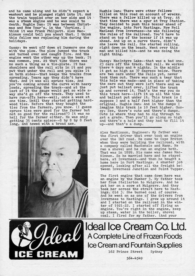 Published by Ronald Caplan on 1978/6/1 (455 reads)and he came along and he didn't expect a washout and he plunged right into it. And the train toppled over on her side and it was a steam engine and he was scald to death. Hughie Dan: It was between Christ? mas and New Year's, in the 'forties. I think it was Frank Philpott. Alex Mac- kinnon could tell you about that. I think this fellow was replacing him during the holidays. Gussy: We went off down at Dunmore one day with the plow. The plow jumped the track and turned over and caught fire. And the engine went the other way up the bank. It was common, yes. At that time there was no such a thing as a tie-plate. It has shoulders and the rail sits in it and you put that under the rail and you spike it on both sides • that keeps the tracks from spreading. Years ago they didn't have that. And it was all spruce ties. And you're coming around the curve with heavy loads, spreading the track • and at the last of it the gauge would get so wide a- way she'd go off the track. They used to have run-offs here • well, once a week at one time. Until they started getting hard? wood ties. Before that they bought the ties from the farmers, you know. (I guess spruce ties were good for the farmer but not so good for the railroad?) It was no hell for the farmer either. He was only getting 35 cents apiece • 8 by 8 by 8 feet long, and hewed with a broad axe. Hughie Dan: There were other fellows killed on this road on account of wrecks. There was a fellow killed up at Troy. At that time there was a spur at Troy Station. They decided to push this boxcar ahead of the engine, into Port Hastings. Now Neil MacLean from Inverness • he was following the rules of the railroad. You'd have to stand on top of the boxcar if it was up ahead. And up on a curve there, didn't she leave the rail. She started rolling, right down on the beach. Went over this man and killed him • and he was doing the right thing. Gussy: Maclntyre Lake • that was a bad one. 23 cars off the track. Bad rail. We worked there k days and 4 nights. In the middle it got as high as 37 degrees below. There are two cars under the rails yet, never took them out. There was such a tear that this hole was made • and in place of taking the cars out they were left there and we just put ballast over, lifted the track up and covered it. That's the way you do this track here • lift it up all the time and ballast put under it. This track is I suppose 2 and a half feet higher than the original. Hughie Dan: And in the dumps I imagine this track is 10 feet higher. Gus? sy: See, there's cuts and there's dumps. Cuts is where they had to dig through to get a grade. Then you'll go along so high and there's a hole and they had to fill it up • and that's a dump. Alex MacKinnon, Engineer: My father was the first driver that ever took an engine over the I&R; road. He came to Cape Breton when they were building the railroad, with a company called MacKenzie and Mann. He ran a shovel and he ran an engine both. That was in 1899. His name was James Mac? Kinnon. So he married here and he stayed here, at Inverness • and then he bought a home here in Port Hastings. A shunter job opened, looking after all the freight be? tween Inverness Junction and Point Tupper. The first engine that came down here was an engine by the Number 3* My father took her from Stellarton to Mulgrave. And he put her on a scow at Mulgrave. And they took her across the strait here to Hast? ings. Old 3- She burned coal of course. And he went on as one of the drivers from Inverness to Hastings. I grew up around it and I started on the railroad in the win? ter of 1921-22. I started off firing an engine. You're right in the engine, keep up steam, water in the boiler, shovel coal. I fired for my father. (And your Ideal Ice Cream Co. Ltd. A Complete Line of Frozen Foods Ice Cream and Fountain Supplies 162 Prince Street 564-4549 Sydney