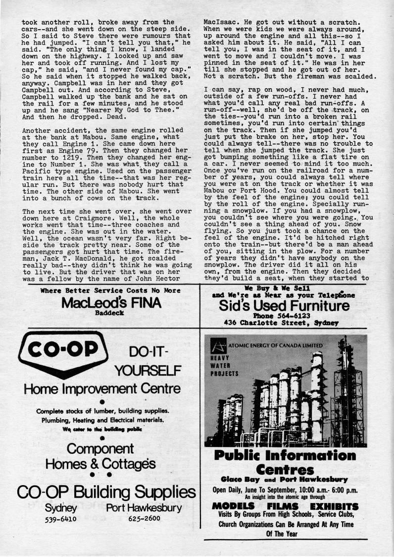 Published by Ronald Caplan on 1978/6/1 (417 reads)took another roll, broke away from the cars • and she went down on the steep side. So I said to Steve there were rumours that he had jumped. "I can't tell you that," he said. "The only thing I know, I landed down on the highway. I looked up and saw her and took off running. And I lost my cap," he said, "and I never found my cap." So he said when it stopped he walked back, anyway. Campbell was in her and they got Campbell out. And according to Steve, Campbell walked up i:he bank and he sat on the rail for a few minutes, and he stood up and he sang "Nearer My God to Thee." And then he dropped. Dead. Another accident, the same engine rolled at the bank at Mabou. Same engine, what they call Engine 1. She came down here first as Engine 79. Then they changed her number to 1219. Then they changed her eng? ine to Number 1, She was what, they call a Pacific type engine. Used on the passenger train here all the time • that was her reg? ular run. But there was nobody hurt that time. The other side of Mabou. She went into a bunch of cows on the track. The next time she went over, she went over down here at Craigmore. Well, the whole works went that time • three coaches and the engine. She was out in the water. Well, the ocean wasn't very far. Right be? side the track pretty near. Some of the passengers got hurt that time. The fire? man, Jack T. MacDonald, he got scalded really bad • they didn't think he was going to live. But the driver that was on her was a fellow by the name of John Hector Maclsaac. He got out without a scratch. When we were kids we were always around, up around the engine and all this • so I asked him about it. He said, "All I can tell you, I was in the seat of it, and I went to move and I couldn't move. I was pinned in the seat of it." He was in her till she stopped and he got out of her. Not a scratch. But the fireman was scalded. I can say, rap on wood, I never had much, outside of a few run-offs. I never had what you'd call any real bad run-offs. A mn-off • well, she'd be off the track, on the ties • you'd run into a broken rail sometimes, you'd run into certain things on the track. Then if she jumped you'd just put the brake on her, stop her. You could always tell • there was no trouble to tell when she jumped the track. She just got bumping something like a flat tire on a car. I never seemed to mind it too much. Once you've run on the railroad for a num? ber of years, you could always tell where you were at on the track or whether it was Mabou or Port Hood. You could almost tell by the feel of the engine? you could tell by the roll of the engine. Specially run? ning a snowplow. If you had a snowplow, you couldn't see where you were going.. You couldn't see a thing ahead of you. Snow flying. So you just took a chance on the feel of the engine. It'd be hitched right onto the train • but there'd be a man ahead of you, sitting in the plow. For a number of years they didn't have anybody on the snowplow. The driver did it all on his own, from the engine. Then they decided they'd build a seat, when they started to Where Better Service Costs No More MacLeod's RNA Baddeck we Buy % We Sell ' and We*re as Near as yonr Teleplione Sid s Used Furniture fhone 564-6123 436 Charlotte Street, Sydney CO-OP J DO-IT- YOURSELF Home Improvement Centre Connate slocks of lumber, building supplies. Plumbing, Heating and Electcical materials. W' CMCP to iMl MHlCMIS pUDHC Component Homes & Cottages COOP Building Supplies Sydney Port Hawkesbury 539-6'HO 625-2600 Public Information Centres Glace Bay and Port Hawkesbury Open Daily, June To September, 10:00 a.m.- 6:00 p.m. An insight into the atomic age through MODELS FILMS EXHIBITS Visits By Groups From High Schools, Service Clubs, Church Organizations Can Be Arranged At Any fime Of The Year