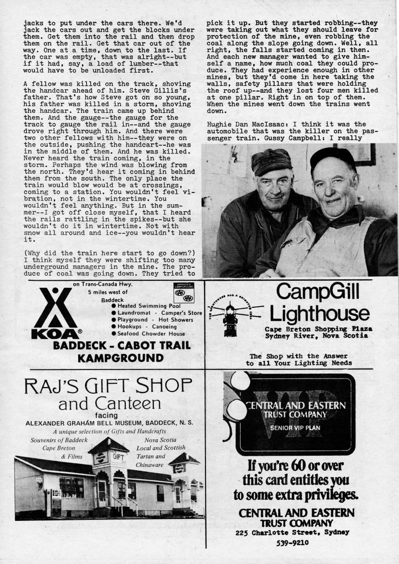 Published by Ronald Caplan on 1978/6/1 (393 reads)jacks to put under the cars there. We'd jack the cars out and get the blocks under them. Get them into the rail and then drop them on the rail. Get that car out of the way. One at a time, down to the last. If the car was empty, that was alright • but if it had, say, a load of lumber • that would have to be unloaded first. A fellow was killed on the track, shoving the handcar ahead of him. Steve Gillis's father. That's how Steve got on so young, his father was killed in a storm, shoving the handcar. The train came up behind them. And the gauge • the gauge for the track to gauge the rail in • and the gauge drove right through him. And there were two other fellows with him • they were on the outside, pushing the handcart • he was in the middle of them. And he was killed. Never heard the train coming, in the storm. Perhaps the wind was blowing from the north. They'd hear it coming in behind them from the south. The only place the train would blow would be at crossings, coming to a station. You wouldn't feel vi? bration, not in the wintertime. You wouldn't -feel anything. But in the sum? mer • I got off close myself, that I heard the rails rattling in the spikes • but she wouldn't do it in wintertime. Not with snow all around and ice • you wouldn't hear it. (Why did the train here start to go down?) I think myself they were shifting too many underground managers in the mine. The pro? duce of coal was going down. They tried to pick it up. But they started robbing • they were taking out what they should leave for protection of the mine, even robbing the coal along the slope going down. Well, all right, the falls started coming in then. And each new manager wanted to give him? self a name, how much coal they could pro? duce. They had experience enough in other mines, but they'd come in here taking the walls, safety pillars that were holding the roof up • and they lost four men killed at one pillar. Right in on top of them. When the mines went down the trains went down. Hughie Dan Maclsaac: I think it was the automobile that was the killer on the pas? senger train. Gussy Campbell: I really on Trar>s-Canada Hwy. • 'W 5 miles west of K Baddeck • Heated Swimming Pool • Laundromat - Camper's Store • Playground - Hot Showers • Hookups - Canoeing • Seafood Chowder House BADDECK - CABOT TRAIL KAMPGROUND RAJ'S GIFT SHOP and Canteen facing ALEXANDER GRAHAM BELL MUSEUM, BADDECK, N. S. A unique selection of Gifts and Handcrafts Souvenirs of Baddeck Cape Breton & Films Nova Scotia Local and Scottish Tartan and Chinaware ___ CampGill V- Lighthouse Cape Breton Shopping Flaza Sydney River, Nova Scotia The Shop with the Answer to all Your Lighting Needs '.ENTOAl AND EASTERN ' TRUST COMPANY i SENIOR VIP PUN Ify(Hi'!re60oroiver this card entities vMi to some extra priviKges. CENTRAL AND EASTERN TRUST (]OMPANY 225 Charlotte Street, Sydney 539-9210