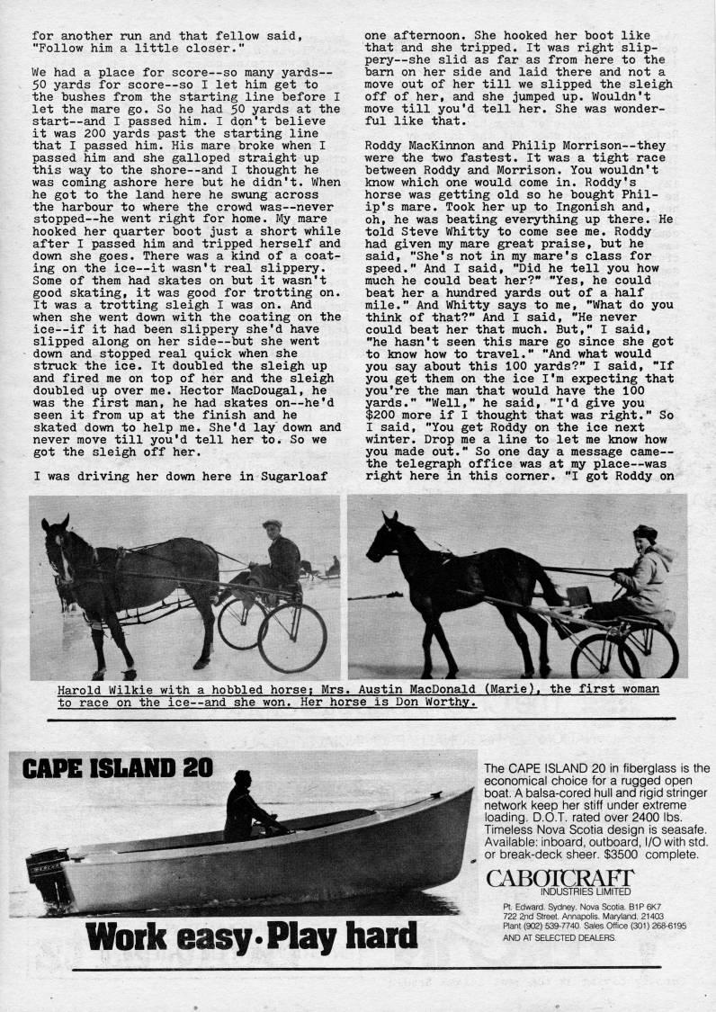 Published by Ronald Caplan on 1978/6/1 (304 reads)for another mm and that fellow said, "Follow him a little closer." We had a place for score • so many yards • 50 yards for score • so I let him get to the bushes from the starting line before I let the mare go. So he had 50 yards at the start • and I passed him. I don't believe it was 200 yards past the starting line that I passed him. His mare broke when I passed him and she galloped straight up this way to the shore • and I thought he was coming ashore here but he didn't. When he got to the land here he swung across the harbour to where the crowd was • never stopped • he went right for home. My mare hooked her quarter boot just a short while after I passed him and tripped herself and down she goes. There was a kind of a coat? ing on the ice • it wasn't real slippery. Some of them had skates on but it wasn't good skating, it was good for trotting on. It was a trotting sleigh I was on. And when she went down with the coating on the ice • if it had been slippery she'd have slipped along on her side • but she went down ajid stopped real quick when she struck the ice. It doubled the sleigh up and fired me on top of her and the sleigh doubled up over me. Hector MacDougal, he was the first man, he had skates on • he'd seen it from up at the finish and he skated down to help me. She'd lay down and never move till you'd tell her to. So we got the sleigh off her. I was driving her down here in Sugarloaf one afternoon. She hooked her boot like that and she tripped. It was right slip? pery • she slid as far as from here to the barn on her side and laid there and not a move out of her till we slipped the sleigh off of her, and she jumped up. Wouldn't move till you'd tell her. She was wonder? ful like that. Roddy MacKinnon and Philip Morrison • they were the two fastest. It was a tight race between Roddy and Morrison. You wouldn't know which one would come in. Roddy's horse was getting old so he bought Phil? ip's mare. Took her up to Ingonish and, oh, he was beating everything up there. He told Steve Whitty to come see me. Roddy had given my mare great praise, but he said, "She's not in my mare's class for speed." And I said, "Did he tell you how much he could beat her?" "Yes, he could beat her a hundred yards out of a half mile." And Whitty says to me, "What do you think of that?" And I said, "He never could beat her that much. But," I said, "he hasn't seen this mare go since she got to know how to travel." "And what would you say about this 100 yards?" I said, "If you get them on the ice I'm expecting that you're the man that would have the 100 yards." "Well," he said, "I'd give you $200 more if I thought that was right." So I said, "You get Roddy on the ice next winter. Drop me a line to let me know how you made out." So one day a message came • the telegraph office was at my place • was right here in this comer. "I got Roddy on Harold Wilkie with a hobbled horse; Mrs. Austin MacDonald (Marie), the first woman to race on the ice • and she won. Her horse is Don Worthy. CAPE ISLAND 20 Work easy • Play hard The CAPE ISLAND 20 in fiberglass is the economical choice for a rugged open boat. A balsa-cored hull and rigid stringer network keep her stiff under extreme loading. D.O.T. rated over 2400 lbs. Timeless Nova Scotia design is seasafe. Available: inboard, outboard, I/O with std. or break-deck sheer. $3500 complete. CABOICRAFT INDUSTRIES LIMITED R. Edward. Sydney. Nova Scotia. B1P 6K7 722 2nd Street. Annapolis. Maryland. 21403 Plant (902) 539-7740. Sales Office (301) 268-6195 AND AT SELECTED DEALERS.
