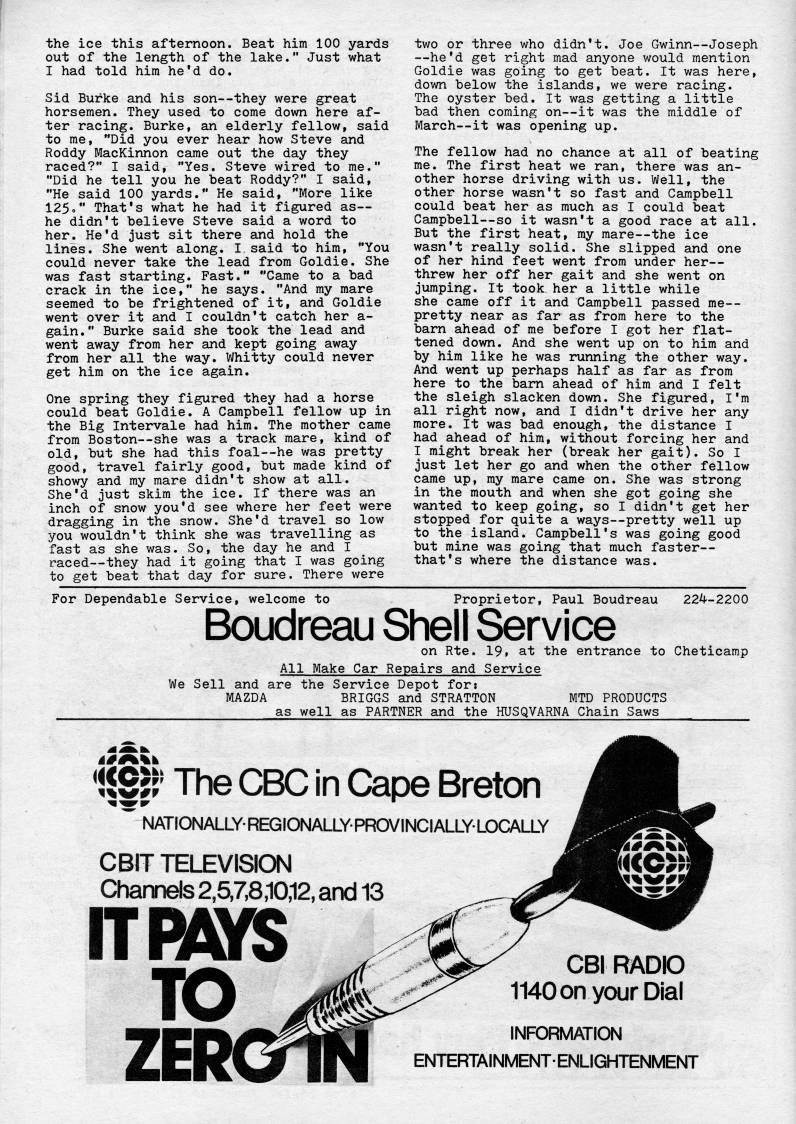 Published by Ronald Caplan on 1978/6/1 (343 reads)the ice this afternoon. Beat him 100 yards out of the length of the lake." Just what I had told him he'd do. Sid Burke and his son • they were great horsemen. They used to come down here af? ter racing. Burke, an elderly fellow, said to me, "Did you ever hear how Steve and Roddy MacKinnon came out the day they raced?" I said, "Yes. Steve wired to me." "Did he tell you he beat Roddy?" I said, "He said 100 yards." He said, "More like 125o" That's what he had it figured as • he didn't believe Steve said a word to her. He'd just sit there and hold the lines. She went along. I said to him, "You could never take the lead from Goldie. She was fast starting. Fast." "Came to a bad crack in the ice," he says. "And my mare seemed to be frightened of it, and Goldie went over it and I couldn't catch her a- gain." Burke said she took the lead and went away from her and kept going away from her all the way. Whitty could never get him on the ice again. One spring they figured they had a horse could beat Goldie. A Campbell fellow up in the Big Intervale had him. The mother came from Boston • she was a track mare, kind of old, but she had this foal--he was pretty good, travel fairly good, but made kind of showy and my mare didn't show at all. She'd just skim the ice. If there was an inch of snow you'd see where her feet were dragging in the snow. She'd travel so low you wouldn't think she was travelling as fast as she was. So, the day he and I raced • they had it going that I was going to get beat that day for sure. There were two or three who didn't. Joe Gwinn • Joseph • he'd get right mad anyone would mention Goldie was going to get beat. It was here, down below the islands, we were racing. The oyster bed. It was getting a little bad then coming on • it was the middle of March • it was opening up. The fellow had no chance at all of beating me. The first heat we ran, there was an? other horse driving with us. Well, the other horse wasn't so fast and Campbell could beat her as much as I could beat Campbell • so it wasn't a good race at all. But the first heat, my mare • the ice wasn't really solid. She slipped and one of her hind feet went from under her • threw her off her gait and she went on jumping. It took her a little while she came off it and Campbell passed me • pretty near as far as from here to the bam ahead of me before I got her flat? tened down. And she went up on to him and by him like he was running the other way. And went up perhaps half as far as from here to the bam ahead of him and I felt the sleigh slacken down. She figured, I'm all right now, and I didn't drive her any more. It was bad enough, the distance I had ahead of him, without forcing her and I might break her (break her gait). So I just let her go and when the other fellow came up, my mare came on. She was strong in the mouth and when she got going she wanted to keep going, so I didn't get her stopped for quite a ways • pretty well up to the island. Campbell's was going good but mine was going that much faster • that's where the distance was. For Dependable Service, welcome to Proprietor, Paul Boudreau 224-2200 Boudreau Shell Service on Rte. 19, at the entrance to Cheticamp All Make Car Repairs and Service We Sell and are the Service Depot for: MAZDA BRIGGS and STRATTON MTD PRODUCTS as well as PARTNER and the HUSQVARNA Chain Saws IJSi* The CBC in Cape Breton NATIONALLYREGIONALLYPROVINCIALLYLOCALLY CBITTELEVISION Channels 2,5,7,8,10,12, and 13 TO ZER CBI RADIO 1140on your Dial INFORMATION ENTERTAINMENTENLIGHTENMENT