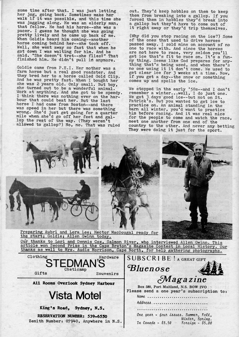 some time after that. I was just letting her jog, going back. Sometimes make her walk if it was possible, and this time she was jogging along. He was an elderly man, that fellow. He had his horse • she was a pacer. I guess he thought she was going pretty lively and he came up back of me. When Goldie heard hira coming • another horse coming behind her • she took off. Well, she went away so fast that when he got down I was waiting for him. And he said. "She doesn't trot • she flies!" That finished him. He didn't pull irt anymore. Goldie came from P.E.I. Her mother was a farm horse but a real good roadster. And they bred her to a horse called Gold Clip. And he was pretty fast. When I bought her she was 2 years old. Only small. But boy, she turned out to be a wonderful animal. Work at anything. And she got to be speedy. I think there was nothing ever on the har? bour that could beat her. But the last horse I had came from Boston • and there was speed in her but there was something wrong. She'd just get going for a quarter mile when she'd go off her feet and gal? lop the rest of the way. (They weren't allowed to gallop?) No, no. That was ruled out. They'd keep hobbles on them to keep them from breaking into a gallop. If you forced them in hobbles they'd break into a gallop but they'd have to come out of it right away or they'd trip themselves. (Why did you stop racing on the ice?) Some of the ones that used to drive horses passed away. I sold mine on account of no one to race with. And since the horses are not here to race, very seldom you'll get ice that's fit to race on. It's a fun? ny thing. Seems like God prepares for any? thing that's being used, and when there's no one using it it don't come. We used to get clear ice for 3 weeks at a time. Now, if you get a day • the snow or something comes up and spoils the ice. We stopped in the early '50s • and I don't remember a winter...well, I do just one. We got 3 days good ice • but not on St. Patrick's. But you wanted to get ice to practice on. An animal standing in the barn all winter, you'd want to practice him before racing. And it was real nice for the people to come and watch the race, meet one another from one end of the country to the other. And never any betting They were doing it just for the sport. Preparing Aubri and Lora Lee; Hector MacDougal ready for the start; Goldie; Allen Gwinn today. Our thanks to Lori and Dennis Cox, Salmon River, who interviewed Allen Gwinn. This article won Second Prize in the Cape Breton's Magazine Contest in Local History. Our thanks as well to Mrs. Audie Morrison, Cape North, for help gathering photographs. Clothing Hardware STEDMAN'S Cheticamp Gifts Souvenirs All Rooms Overlook Sydney Harbour Vista Motel King's Road, Sydney, N.S* RBSERVATI(??I NUMBER: 539-6550 Zenith Number: 079'0, Anywhere in N.S. SUBSCRl BE Iagreatgift bluenose (Magazine Box 580, Port Maitland, N.S. BOW 2V0 Please send a one year's subscription to: Nairn KddJit&& One yaax - {'ouA '4ae'. Sumnzn., ToJit, l'lntzn., Sp/Ung. In Canada - $3.50 VoA.