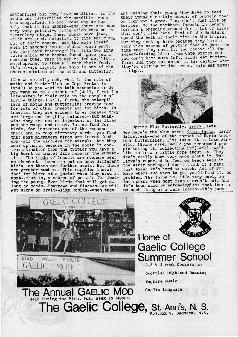 butterflies but they have mandibles. In the moths and butterflies the mandibles were transmogrified. No one knows why or how-- only that it did happen--and there are some very very primitive moths which show an in? termediary stage. Their pupae have jaws, which are used, actually, to bite their way out of their cocoon • but the moth itself when it hatches has a tubular mouth part. The jaws have transmogrified into two long tubes which then became fused--gave you a sucking tube. Then it was coiled up, like a watchspring. So they all suck their food, it's always liquid. And this is one of the characteristics of the moth and butter*fly. (Can we actually ask, what is the role of moths and butterflies on Cape Breton Is? land?) Do you want to talk economics or do you want to talk esthetics? (Well, first I'm interested in their role in the complex of living things.) Well, first, the caterpil? lars of moths and butterflies provide food for lots of other insects and for birds. As insects, they are evident to us because they are large and brightly coloured--but bulk- wise they are not so important as the flies and the wasps and so on. But as food for birds, for instance: one of the reasons there are so many migratory birds • you find that most migratory birds are insect feed? ers • all the Warblers for example. And they come up north because in the north in con? tradistinction from the tropics you have a big burst of insect life here in the summer? time. The kinds of insects are nowhere near as abundant • there are not as many different kinds • as there are further south. But there are greater numbers. This supplies insect food for birds at a period when they need it most • that is, a source of protein for feed? ing the young. Even birds that will get a- long on seeds • Sparrows and Finches • or will get along on fruit • like Robins--when_they are raising their young they have to feed their young a certain amount of protein food or they won't grow. They can't just live on berries. So the northern forests in general furnish a breeding ground for a lot of birds that don't live here. Most of the Warblers spend the bulk of their time in the tropics. But they nest up here because they have a very rich source of protein food at just the time that they need it. You remove all the insect-feeding birds from Cape Breton and you don't have much left. Birds eat butter? flies and they eat moths in the daytime when they're sitting on the trees. Bats eat moths at night. Spring Blue Butterfly, Erora laeta Now here's the blue ones: Erora laeta. Early Hairstreak • one of the rarest of North Amer? ican butterflies. I've taken it at Lake Ain? slie. (Being rare, would you recommend peo? ple taking it, collecting it?) Well, we'd like to know a little more about it. They don't really know very much about it. The larva's reported to feed on beech buds in the early spring. I don't think it's rare. I just think it's hard to catch. And if you knew where and when to go, you'd find it, no problem. The thing is, it's very early in the spring when most people aren't out. And it's been said by entomologists that there'a no such thing as a rare insect • it's just Home of Gaelic College Summer School 2,3 & 5 Week Courses in Scottish Highland Dancing Bagpipe Music Gaelic Language The Annual Gaelic Mod Held During the First Full Week in August The Gaelic College, st. Anns, n. s. P.O.Box 9, Baddeck, N.S.