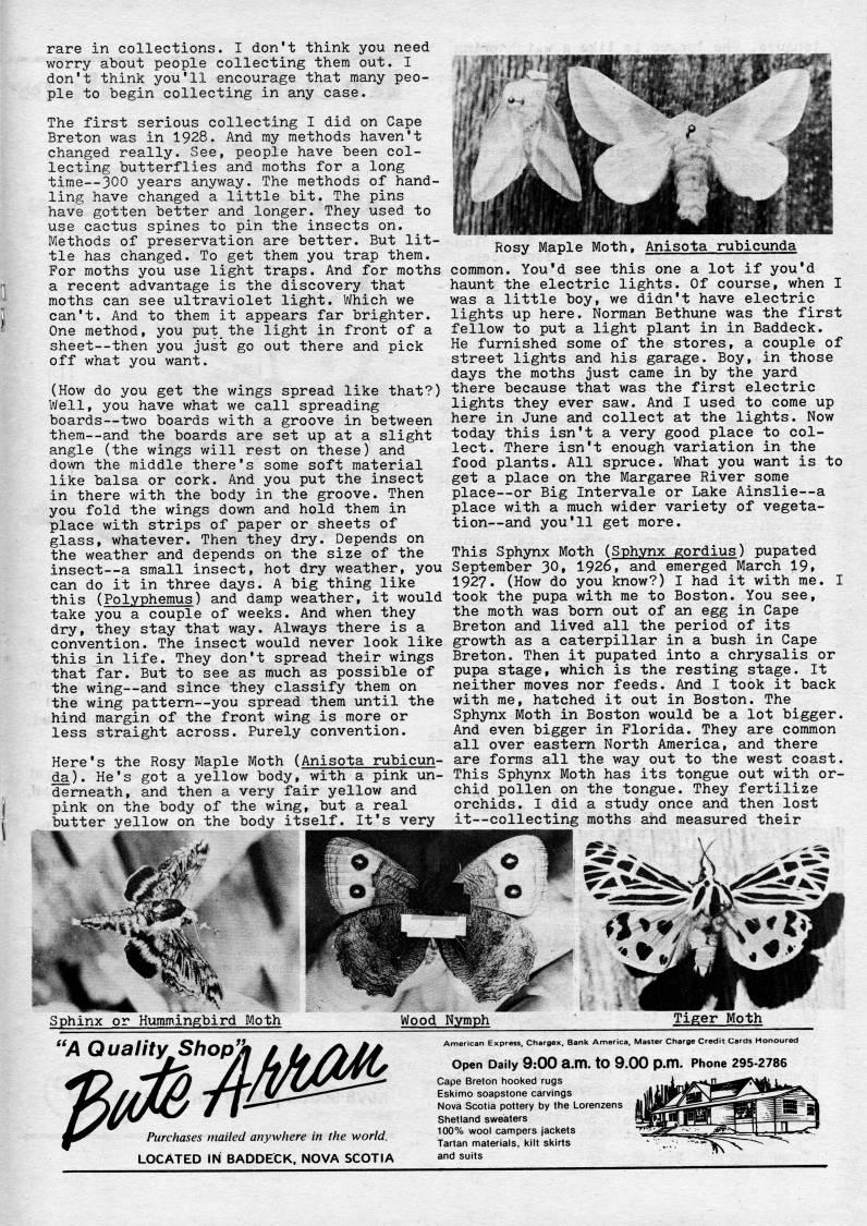 rare in collections. I don't think you need worry about people collecting them out. I don't think you'll encourage that many peo? ple to begin collecting in any case. The first serious collecting I did on Cape Breton was in 1928. And my methods haven't changed really. See, people have been col? lecting butterflies and moths for a long time • 300 years anyv/ay. The methods of hand? ling have changed a little bit. The pins have gotten better and longer. They used to use cactus spines to pin the insects on. Methods of preservation are better. But lit? tle has changed. To get them you trap them. For moths you use light traps. And for moths a recent advantage is the discovery that moths can see ultraviolet light. Which we can't. And to them it appears far brighter. One method, you put the light in front of a sheet--then you just go out there and pick off what you want. (How do you get the wings spread like that?) Well, you have what we call spreading boards • two boards with a groove in between them • and the boards are set up at a slight angle (the wings will rest on these) and down the middle there's some soft material like balsa or cork. And you put the insect in there with the body in the groove. Then you fold the wings down and hold them in place with strips of paper or sheets of glass, whatever. Then they dry. Depends on the weather and depends on the size of the insect • a small insect, hot dry weather, you can do it in three days. A big thing like this (Polyphemus) and damp weather, it would take you a couple of weeks. And when they dry, they stay that way. Always there is a convention. The insect would never look like this in life. They don't spread their wings that far. But to see as much as possible of the wing • and since they classify them on the wing pattern • you spread them until the hind margin of the front wing is more or less straight across. Purely convention. Here's the Rosy Maple Moth (Anisota rubicun- da). He's got a yellow body, with a pink un? derneath, and then a very fair yellow and pink on the body of the wing, but a real butter yellow on the body itself. It's very • ? mt'n Rosy Maple Moth, Anisota rubicunda common. You'd see this one a lot if you'd haunt the electric lights. Of course, when I was a little boy, we didn't have electric lights up here. Norman Bethune was the first fellow to put a light plant in in Baddeck. He furnished some of the stores, a couple of street lights and his garage. Boy, in those days the moths just came in by the yard there because that was the first electric lights they ever saw. And I used to come up here in June and collect at the lights. Now today this isn't a very good place to col? lect. There isn't enough variation in the food plants. All spruce. What you want is to get a place on the Margaree River some place • or Big Intervale or Lake Ainslie • a place with a much wider variety of vegeta? tion • and you'll get more. This Sphynx Moth (Sphynx gordius) pupated September 30, 1926, and emerged March 19, 1927. (How do you know?) I had it with me. I took the pupa with me to Boston. You see, the moth was bom out of an egg in Cape Breton and lived all the period of its growth as a caterpillar in a bush in Cape Breton. Then it pupated into a chrysalis or pupa stage, which is the resting stage. It neither moves nor feeds. And I took it back with me, hatched it out in Boston. The Sphynx Moth in Boston would be a lot bigger. And even bigger in Florida. They are common all over eastern North America, and there are forms all the way out to the west coast. This Sphynx Moth has its tongue out with or? chid pollen on the tongue. They fertilize orchids. I did a study once and then lost it • collecting moths and measured their Sphinx or Hummingbird Moth Wood Nymph Tiger Moth Purchases mailed anywhere in the world. LOCATED IN BADDECK, NOVA SCOTIA American Express, Chargex, Bank America, Master Charge Credit Cards Monourec Open Daily 9:00 a.m. tO 9.00 p.m. Phone 295-2786 Cape Breton hooked rugs Eskimo soapstone carvings Nova Scotia pottery by the Lorenzens Shetland sweaters 100% wool campers jackets Tartan materials, kilt skirts and suits