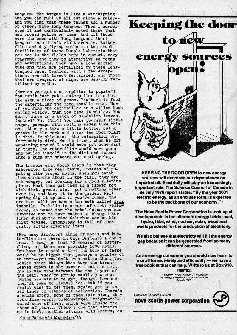 tongues. The tongue is like a watchspring and you can jnill it all out along a ruler-- and you find that these things and a number of others have long tongues. Then I correl? ated it and particularly noted those that had orchid pollen on them. And all those were the ones with long tongues. Short- tongued ones didn't visit orchids. Butter? flies and day-flying moths are the usual fertilizers of these Purple Habenaria that you see in the fields here in August, very fragrant. And they're attractive to moths and butterflies. They have a long nectar tube and they are fertilized by these long- tongued ones. Orchids, with a few excep? tions, are all insect fertilized, and those that are fragrant at night are usually fer? tilized by moths. (How do you get a caterpillar to pupate?) You can't just put a caterpillar in a bot? tle with a piece of grass. You have to feed the caterpillar the food that" it eats. Now if you find the caterpillar on a willow bush eating willow, then you feed it willow. You don't throw in a batch of dandelion leaves. (Water?) No. (Air?) You raake yourself little cages, perhaps with netting sides like this one, then you take a little bottle, cut a groove in the cork and stick the food plant in that. In this case, the caterpillar un? fortunately died. Had he lived, when he got wandering around I would have put some dirt in there. The caterpillar would have gone and buried himself in the dirt and turned into a pupa and hatched out next spring. The trouble with Wooly Bears is that they hibernate, like real bears, instead of pu? pating like proper moths. When you catch them wandering about in the fall, they are not hungry, hut looking for a good sleeping place. Next time put them in a flower pot with dirt, grass, etc., put a netting cover over it, and bury it in the garden. Next spring dig it up and if you're lucky, the creature will produce a tan moth called Isia Isabella. Isabella is a sort of dirty yellow brown, so named for the noted Queen who was supposed not to have washed or changed her linen during the time Columbus was on his first voyage. Enton'logy is full of such gritty little literary items. (How many different kinds of moths and but? terflies are there in Cape Breton?) I don't know. I imagine about 50 species of butter? flies, and there are probably 1000 moths. You have to remember that the bulk of these would be no bigger than perhaps a quarter of an inch • you wouldn't even notice them. You notice these things that turn the birch leaves brown in the summer • that's a moth. The larvae mine between the two layers of the leaf. They're pretty small, you see. (Moths are easier to get, though, because they'll come to light.) Yes. But if you really want to get them, you've got to use all kinds of methods of collection. There's a whole group, some of them fair size, they look like wasps, clear-winged, bright-cpl- oured some of them, which, bore inside the stems of plants. There's one that attacks maple bark, another attacks wild cherry* an- Cape Breton's Magazine/26 Keeping the docM* lif KEEPING THE DOOR OPEN to new energy sources will decrease our dependence on imported oil. Electricity will play an increasingly important role. The Science Council of Canada in its July 1976 report states: "By the year 2001 electric energy, as an end use form, is expected to be the backbone of our economy."* The Nova Scotia Power Corporation is looking at developments in the alternate energy fields: coal, hydro, tidal, wind, nuclear, solar, wood and waste products for the production of electricity. We also believe that electricty will fill the energy gap because it can be generated from so many different sources. As an energy consumer you should now learn to use all forms wisely and efficiently • we have a free booklet that can help. Write to us at Box 910, Halifax. ' • based on Report Number 25, Pofjulation, * Technology & Resources, Science Council of Canada 1976. Customer Services Division nova scotia power corporation