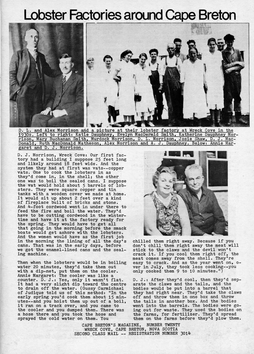 Lobster Factories around Cape Breton f* * e?? D. L. and Alex Morrison and a picture at their lobster factory at Wreck Cove in the 1930s. Left to rightt Katie Dauphney, Evelyn MacDermid Smith, Katherine Dauphney Mor? rison, Mary Buchanan Smith, Murdock Morrison, D. L. Morrison, Josie Shaw, D. J. Mac? Donald. Ruth MacDonald Matheson, Alex Morrison and A. J. Dauphney. Below; Annie Mar- garet and D. J. Morrison. D. J. Morrison, Wreck Cove: Our first fac? tory had a building I suppose 25 feet long and likely around l8 feet wide. And the system they had at first was vats • copper vats. One to cook the lobsters in as they'd come in, in the shell; the other one was to boil the sealed cans. I suppose the vat would hold about 5 barrels of lob? sters. They were square copper and tin tanks with a wooden cover we made at home. It would sit up about 2 feet over a kind of fireplace built of bricks and stone. And 4-foot cordwood went in under there to feed the fire and boil the water. They'd have to be cutting cordwood in the winter? time and have it at the factory ready for the spring. They would have to get all that going in the morning before the smack boats would get ashore with the lobsters. And the women would have as the first job in the morning the lining of all the day's cans. That was in the early days, before we got the enamel-lined cans and the seal? ing machine. Then when the lobsters would be in boiling water 20 minutes, they'd take them out with a dip-net, put them on the cooler. Annie Margaret: The cooler was like a counter. D. J.: Yes, only it wasn't flat. It had a very slight dip toward the centre to drain off the water. (Gussy Carmichael of Judique told us of this method: "In the early spring you'd cook them about 15 min? utes • and you hoist them up out of a boil, it ran on a track over, and you came to the cooler and you dumped them. There was a hose there and you took the hose and sprayed the cold water on them. You chilled them right away. Because if you don't chill-them right away the meat will stick to the claws and the devil won't crack it. If you cool them right off, the meat comes away from the shell. They're easy to crack. And as the year went on, o- ver in July, they took less cooking • you only cooked them 9 to 10 minutes.") D. J.: After they'd cool, then they'd sep? arate the claws and the tails, and the bodies would be put into a barrel that they had right near. They'd take the claws off and throw them in one box and throw the tails in another box. And the bodies went into the barrels. The bodies were go? ing out for waste. They used the bodies on the farms, for fertilizer. They'd spread them on the farms before they'd plow them. CAPE BRETON'S MAGAZINE, NUMBER TWENTY WRECK COVE, CAPE BRETON, NOVA SCOTIA SECOND CLASS MAIL • REGISTRATION NUMBER 301'