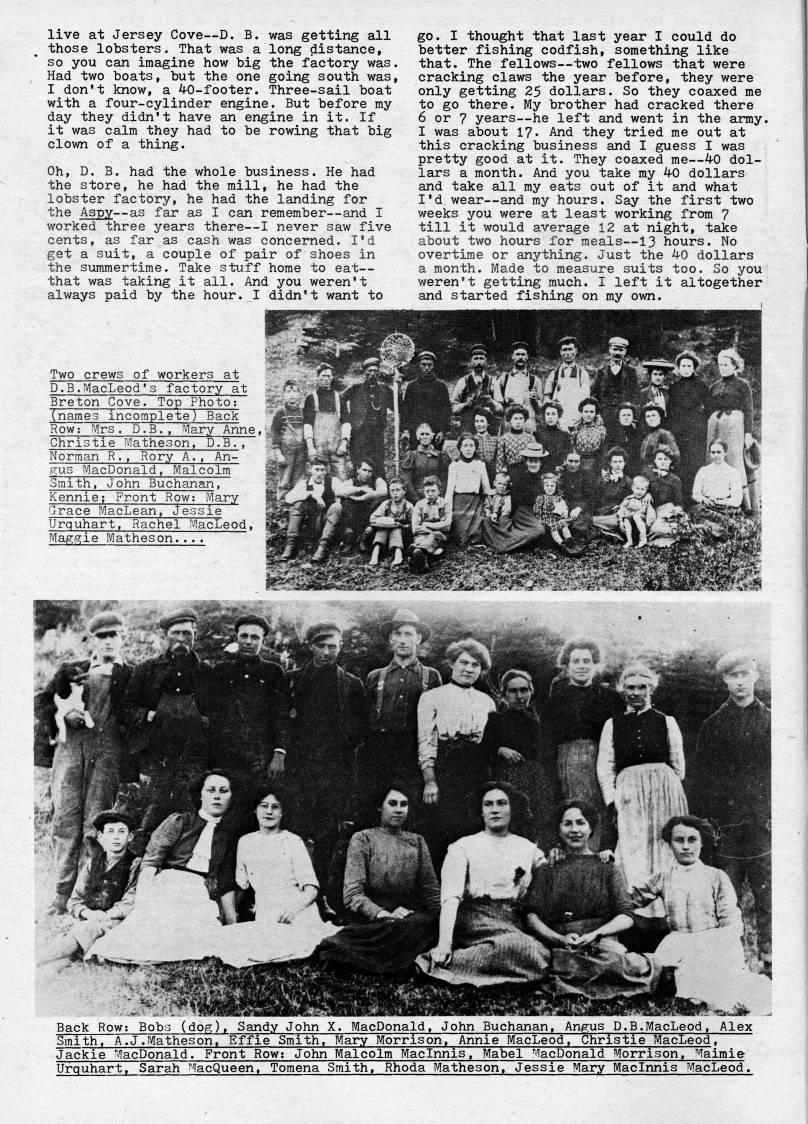Published by Ronald Caplan on 1978/8/1 (408 reads)live at Jersey Cove • D. B. was getting all those lobsters. That was a long distance, so you can imagine how big the factory was. Had two boats, but the one going south was, I don't know, a 40-footer. Three-sail boat with a four-cylinder engine. But before my day they didn't have an engine in it. If it was calm they had to be rowing that big clovm of a thing. Oh, D. B. had the whole business. He had the store, he had the mill, he had the lobster factory, he had the landing for the Aspy • as far as I can remember • and I worked three years there • I never saw five cents, as far as cash was concerned. I'd get a suit, a couple of pair of shoes in the summertime. Take stuff home to eat • that was taking it all. And you weren't always paid by the hour. I didn't want to Two crews of workers at D.B.MacLeod's factory at Breton Cove. Top Photo; (names incomplete) Back Row: Mrs. D.B., Mary Anne, Christie Watheson, D.B., go. I thought that last year I could do better fishing codfish, something like that. The fellows • two fellows that were cracking claws the year before, they were only getting 25 dollars. So they coaxed me to go there. My brother had cracked there 6 or 7 years • he left and went in the army. I was about 17. And they tried me out at this cracking business and I guess I was pretty good at it. They coaxed me • 40 dol? lars a month. And you take my 40 dollars and take all my eats out of it and what I'd wear • and my hours. Say the first two weeks you were at least working from 7 till it would average 12 at night, take about two hours for meals • 13 hours. No overtime or anything. Just the 40 dollars a month. Made to measure suits too. So you weren't getting much. I left it altogether and started fishing on my own. Norman R., Rory A. An- gus ?i/IacDonald, Malcolm Smith, John Buchanan, Kennie; Front Row: P/Iary Grace MacLean, Jessie Urquhart, Rachel MacLeod, Maggie Matheson.... Back Row: Bobo (dog), Sandy John X. MacDonald, John Buchanan, Angus D.B.MacLeod, Alex Smith, A.J.Matheson, Effie Smith, Mary Morrison, Annie MacLeod, Christie MacLeod, Jackie "lacDonald. Front Row: John Malcolm Maclnnis, Mabel MacDonald Morrison, ''faimie Urquhart, Sarah ''lacQueen, Tomena Smith, Rhoda Matheson, Jessie Mary Maclnnis MacLeod.