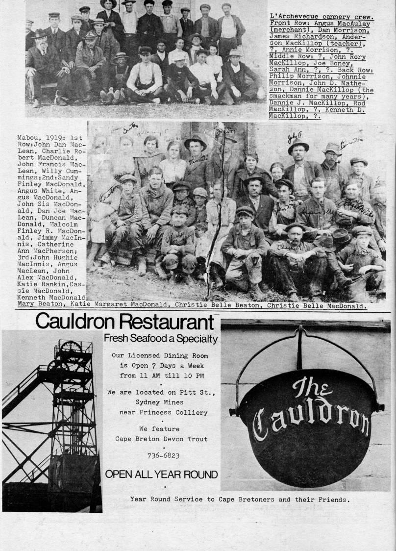 Published by Ronald Caplan on 1978/8/1 (448 reads)L'Archeveque cannery crew. Front Row; Angus MacAulay (merchant), Dan Morrison, James Richardson, Ander? son MacKillop (teacher77 ?, Annie Morrison, ?. Middle Row; ?, John Rory MacKillop, Joe Boney, Sarah Ann, ?, ?. Back Row; Philip Morrison, Johnnie Morrison, John D. Mathe? son, Dannie MacKillop Cthe smackman for many years), Dannie J. MacKillop, Rod MacKillop, ?, Kenneth D. MacKillop, ?T Mabou, 1919: 1st Row:John Dan 'lac- Lean, Charlie Ro? bert MacDonald, John Francis "lac- Lean, Willy Gum? ming 3 ; 2nd:S andy Finley MacDonald, " '' Angus White, An? gus MacDonald, John Sis MacDon- ,?? aid, Dan Joe 'Tac- Lean, Duncan Mac-*,, Donald, "lalcolm ?. Finley R. HacDon- ' aid, Jimmy Macln? nis, Catherine Ann MacPherson; 3rd:John Huf'hie Maclnnis, Anp;u3 MacLean, John "'v Alex MacDonald, Katie Rankin,Cac-, sie MacDonald, Kenneth MacDonald. Mary Beaton, Katie ''larfjarot MacDonald. Christie Belle Beaton, Christie Belle MacDonald. Cauldron Restaurant Fresh Seafood a Specialty Our Licensed Dining Room is Open 7 Days a Week from 11 AM till 10 PM We are located on Pitt St., Sydney Mines near Princess Colliery We feature Cape Breton Devco Trout 736-6823 OPEN ALL YEAR ROUND Year Round Service to Cape Bretoners and their Friends.