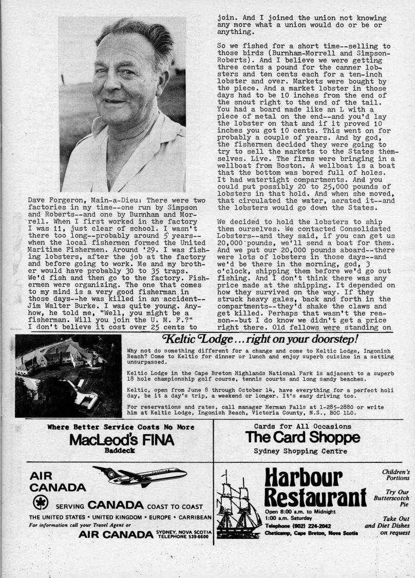 Published by Ronald Caplan on 1978/8/1 (348 reads)'''K. / Dave Forgeron, Main-a-Dieu: There were two factories in my time • one run by Simpson and Roberts • and one by Bur'ham and Mor- rell. When I first worked in the factory I was 11, just clear of school. I wasn't there too long • probably around ' years • when the local fishermen formed the United Maritime Fishermen. Around '29. I was fish? ing lobsters, after the job at the factory and before going to work. Me and my broth? er would have probably 30 to 35 traps. We'd fish and then go to the factory. Fish? ermen were organizing. The one that comes to my mind is a very good fisherman in those days • he was killed in an accident • Jim Walter Burke. I was quite young. Any? how, he told me, "Wellj you might be a fisherman. Will you join the U. M. F.?" I don't believe it cost over 25 cents to join. And I joined the union not knowing any more what a union would do or be or anything. So we fished for a short time • selling to those birds (Burnham-Morrell and Simpson- Roberts). And I believe we were getting three cents a pound for the canner lob-? sters and ten cents each for a ten-inch lobster and over. Markets were bought by the piece. And a market lobster in those days had to be 10 inches from the end of the snout right to the end of the tail. You had a board made like an L with a piece of metal on the end • and you'd lay the lobster on that and if it proved 10 inches you got 10 cents. This went on for probably a couple of years. And by god, the fishermen decided they were going to try to sell the markets to the States them? selves. Live. The firms were bringing in a wellboat from Boston. A wellboat is a boat that the bottom was bored full of holes. It had watertight compartments. And you could put possibly 20 to 25??000 pounds of lobsters in that hold. And when she moved, that circulated the water, aerated it • and the lobsters would go down the States. We decided to hold the lobsters to ship thera ourselves. We contacted Consolidated Lobsters • and they said, if you can get us 20,000 pounds, we'll send a boat for them. And we put our 20,000 pounds aboard • there were lots of lobsters in those days • and we'd be there in the morning, god, 3 o'clock, shipping them before we'd go out fishing. And I don't think there was any price made at the shipping. It depended on how they survived on the way. If they struck heavy gales, back and forth in the compartments • they'd shake the claws and get killed. Perhaps that wasn't the rea? son • but I do know we didn't get a price right there. Old fellows' weri??. standing on Celtic 'odge... right on your doorstep! Why not do something different for a change and come to Keltic Lodge, Ingonish Beach? Come to Keltic for dinner or lunch and enjoy superb cuisine in a setting unsurpassed. Keltic Lodge in the Cape Breton Highlands National Park is adjacent to a superb 18 hole championship golf course, tennis courts and long sandy beaches. Keltic, open from June 8 through October 14, have everything for a perfect holi day, be it a day's trip, a weekend or longer. It's easy driving too. For reservations and rates, call manager Herman Falls at 1-285-2880 or write him at Keltic Lodge, Ingonish Beach, Victoria County, N.S., BOG ILO. miere Better Service Costs No More MacLeod's RNA Baddeck Cards for All Occasions The Card Shoppe Sydney Shopping Centre AIR CANADA SERVING CANADA COAST TO COAST THE UNITED STATES • UNITED KINGDOM • EUROPE • CARRIBEAN For information call your Travel Agent or AID/'AMAr'il SYDNEY. NOVA SCOTIA MIK wMIMMLIM telephone sss-esoo Harbour Restaurant Children's Portions Try Our Butterscotch Pie Open 8:00 a.m. to Midnight 1:00 a.m. Saturday Telephone (902) 224-2042 ChetiCMiip, Cape Breton, Nove ' Take Out and Diet Dishes on request