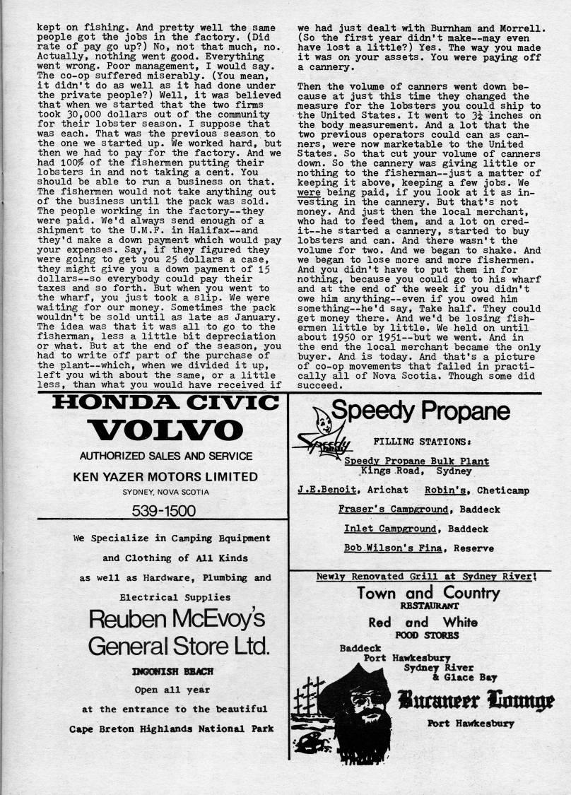 Published by Ronald Caplan on 1978/8/1 (334 reads)kept on fishing. And pretty well the same people got the jobs in the factory. (Did rate of pay go up?) No, not that much, no. Actually, nothing went good. Everything went wrong. Poor management, I would say. The co-op suffered miserably, (You mean, it didn't do as well as it had done imder the private people?) Well, it was believed that when we started that the two firms took 30,000 dollars out of the community for their lobster season, I suppose that was each. That was the previous season to the one we started up. We worked hard, but then we had to pay for the factory. And we had 100?' of the fishermen putting their lobsters in and not taking a cent. You should be able to run a business on that. The fishermen would not take anything out of the business until the pack was sold. The people working in the factory • they were paid. We'd always send enough of a shipment to the U.M.F. in Halifax • and they'd make a down payment which would pay your expenses. Say, if they figured they were going to get you 25 dollars a case, they might give you a down payment of 15 dollars • so everybody could pay their taxes and so forth. But when you went to the wharf, you just took a slip. We were waiting for our money. Sometimes the pack wouldn't be sold until as late as January. The idea was that it was all to go to the fisherman, less a little bit depreciation or what. But at the end of the season, you had to write off part of the purchase of the plant • which, when we divided it up, left you with about the same, or a little less, than what you would have received if we had just dealt with Bumham and Morrell. (So the first year didn't make • may even have lost a little?) Yes, The way you made it was on your assets. You were paying off a cannery. Then the volume of canners went down be? cause at just this time they changed the measure for the lobsters you could ship to the United States. It went to 3* inches on the body measurement. And a lot that the two previous operators could can as can? ners, were now marketable to the United States, So that cut your volume of canners down. So the cannery was giving little or nothing to the fisherman • just a matter of keeping it above, keeping a few jobs. We were being paid, if you look at it as in? vesting in the cannery. But that's not money. And just then the local merchant, who had to feed them, and a lot on cred? it • he started a cannery, started to buy lobsters and can. And there wasn't the volume for two. And we began to shake. And we began to lose more and more fishermen. And you didn't have to put them in for nothing, because you could go to his wharf and at the end of the week if you didn't owe him anything • even if you owed him something • he'd say. Take half. They could get money there. And we'd be losing fish? ermen little by little. We held on until about 1950 or 1951 • but we went. And in the end the local merchant became the only buyer. And is today. And that's a picture of co-op movements that failed in practi? cally all of Nova Scotia. Though some did succeed. AUTHORIZED SALES AND SERVICE KEN YAZER MOTORS LIMITED SYDNEY, NOVA SCOTIA 539-1500 We specialize in Camping Equipment and Clothing of All Kinds as well as Hardware, Plumbing and Electrical Supplies Reuben McEvoy's General Store Ltd. XNGONISH BBACR Open all year at the entrance to the beautiful Cape Breton Highlands National Park Speedy Propane PILLING STATIONS* Speedy Propane Bulk Plant Kings Road, Sydney J.E.Benoit* Arichat Robin's. Cheticamp Eraser's Campground. Baddeck Inlet Campground. Baddeck Bob Wilson's Fina. Reserve Newly Renovated Grill at Sydney RiverI Town and Country RBSTAXJRANT Red and White FOOD STORBS Baddeck Port HaMkesbury Sydney River & Glace Bay Fort Hawkesbury