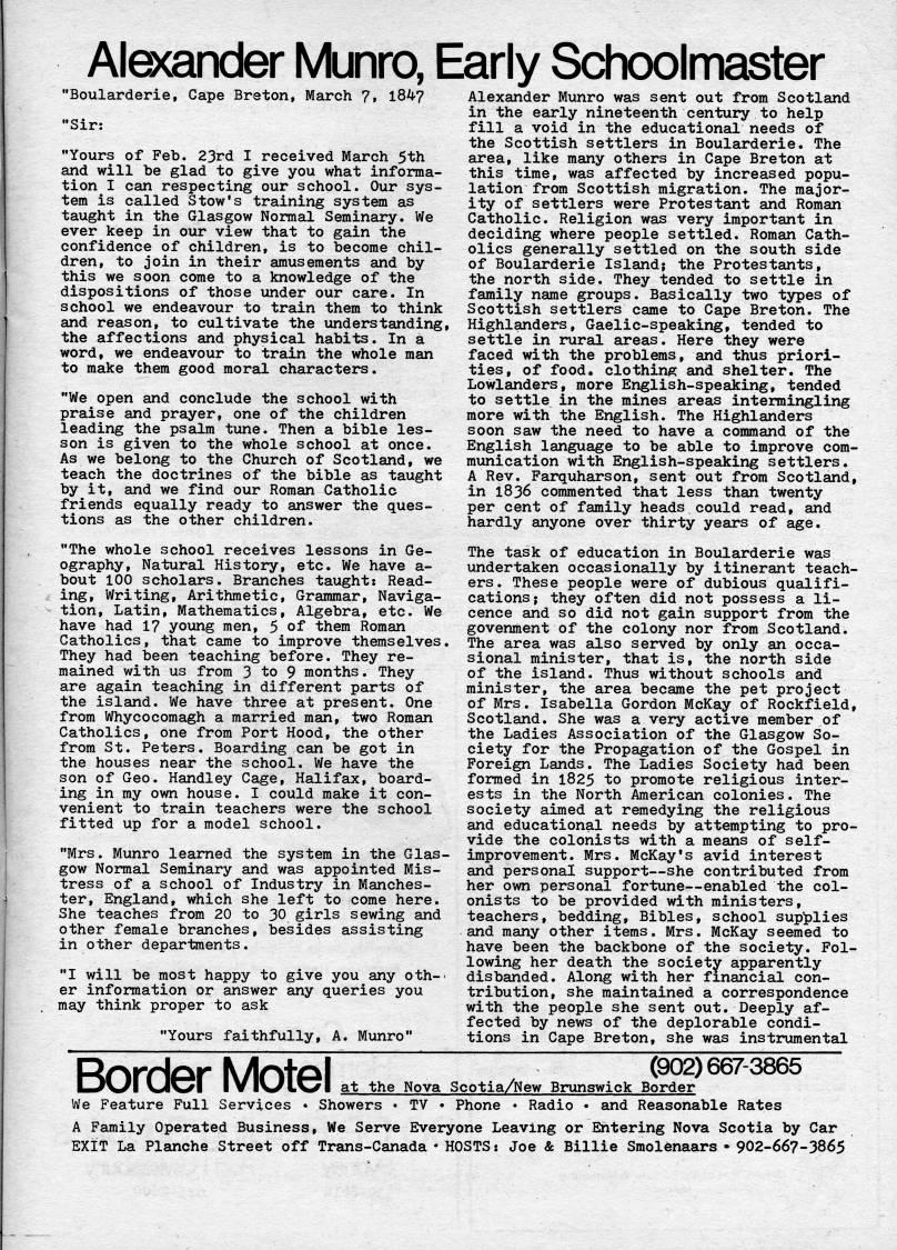 Published by Ronald Caplan on 1978/8/1 (510 reads)Alexander Munro, Early Schoolmaster "Boularderie, Cape Breton, March 7, l847 "Sir: "Yours of Feb. 23rd I received March 5th and will be glad to give you what informa? tion I can respecting our school. Our sys? tem is called Stow's training system as taught in the Glasgow Normal Seminary, We ever keep in our view that to gain the confidence of children, is to become chil? dren, to join in their amusements and by this we soon come to a knowledge of the dispositions of those under our care. In school we endeavour to train them to think and reason, to cultivate the understanding, the affections and physical habits. In a word, we endeavour to train the whole man to make them good moral characters, "We open and conclude the school with praise and prayer, one of the children leading the psalm tune. Then a bible les? son is given to the whole school at once. As we belong to the Church of Scotland, we teach the doctrines of the bible as taught by it, and we find our Roman Catholic friends equally ready to answer the ques? tions as the other children. "The whole school receives lessons in Ge? ography, Natural History, etc. We have a- bout 100 scholars. Branches taught: Read? ing, Writing, Arithmetic, Grammar, Naviga? tion, Latin, Mathematics, Algebra, etc. We have had 1? young men, 5 of them Roman Catholics, that came to improve themselves. They had been teaching before. They re? mained with us from 3 to 9 months. They are again teaching in different parts of the island. We have three at present. One from Whycocomagh a married man, two Roman Catholics, one from Port Hood, the other from St. Peters. Boarding can be got in the houses near the school. We have the son of Geo. Handley Cage, Halifax, board? ing in my own house. I could make it con? venient to train teachers were the school fitted up for a model school. "Mrs. Munro learned the system in the Glas? gow Normal Seminary and was appointed Mis? tress of a school of Industry in Manches? ter, England, which she left to come here. She teaches from 20 to 30 girls sewing and other female branches, besides assisting in other departments. "I will be most happy to give you any oth-' er information or answer any queries you may think proper to ask "Yours faithfully, A. Munro" Alexander Munro was sent out from Scotland in the early nineteenth century to help fill a void in the educational needs of the Scottish settlers in Boularderie. The area, like many others in Cape Breton at this time, was affected by increased popu? lation from Scottish migration. The major? ity of settlers were Protestant and Roman Catholic. Religion was very important in deciding where people settled. Roman Cath? olics generally settled on the south side of Boularderie Island; the Protestants, the north side. They tended to settle in family name groups. Basically two types of Scottish settlers came to Cape Breton. The Highlanders, Gaelic-speaking, tended to settle in rural areas. Here they were faced with the problems, and thus priori? ties, of food, clothing and shelter. The Lowlanders, more English-speaking, tended to settle in the mines areas intermingling more with the English. The Highlanders soon saw the need to have a command of the English language to be able to improve com? munication with English-speaking settlers. A Rev, Farquharson, sent out from Scotland, in 1836 commented that less than twenty per cent of family heads could read, and hardly anyone over thirty years of age. The task of education in Boularderie was undertaken occasionally by itinerant teach? ers. These people were of dubious qualifi? cations; they often did not possess a li? cence and so did not gain support from the govenment of the colony nor from Scotland. The area was also served by only an occa? sional minister, that is, the north side of the island. Thus without schools and minister, the area became the pet project of Mrs, Isabella Gordon McKay of Rockfield, Scotland, She was a very active member of the Ladies Association of the Glasgow So? ciety for the Propagation of the Gospel in Foreign Lands, The Ladies Society had been formed in 1825 to promote religious inter? ests in the North American colonies. The society aimed at remedying the religious and educational needs by attempting to pro? vide the colonists with a means of self- improvement, Mrs, McKay's avid interest and personal support • she contributed from her own personal fortune • enabled the col? onists to be provided with ministers, teachers, bedding. Bibles, school sup'plies and many other items. Mrs, McKay seemed to have been the backbone of the society. Fol? lowing her death the society apparently disbanded. Along with her financial con? tribution, she maintained a correspondence with the people she sent out. Deeply af? fected by news of the deplorable condi? tions in Cape Breton, she was instrumental Border Motel (902)667-3865 at the Nova Scotia/New Brunswick Border We Feature Full Services • Showers • TV • Phone • Radio • and Reasonable Rates A Family Operated Business, We Serve Everyone Leaving or Entering Nova Scotia by Car EXIT La Planche Street off Trans-Canada • HOSTS: Joe & Billie Smolenaars • 902-667-3865