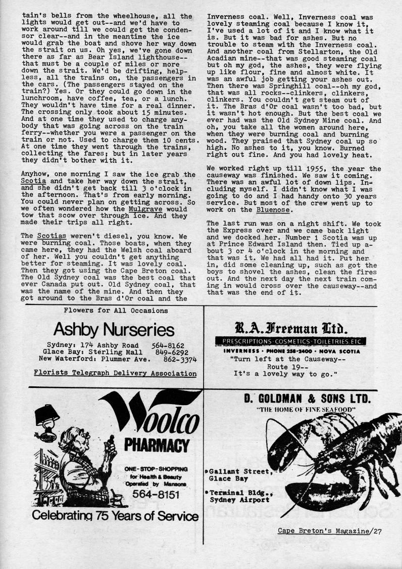 Published by Ronald Caplan on 1978/8/1 (365 reads)tain's bells from the wheelhouse, all the lights would get out • and we'd have to work around till we could get the conden? ser clear • and in the meantime the ice would grab the boat and shove her way down the strait on us. Oh yes, we've gone down there as far as Bear Island lighthouse • that must be a couple of miles or more down the strait. We'd be drifting, help? less, all the trains on, the passengers in the cars. (The passengers stayed on the train?) Yes. Or they could go down in the lunchroom, have coffee, tea, or a lunch. They wouldn't have time for a real dinner. The crossing only took about 15 minutes. And at one time they used to charge any? body that was going across on the train ferry • whether you were a passenger on the train or not. Used to charge them 10 cents. At one time they went through the trains, collecting the fares; but in later years they didn't bother with it. Anyhow, one morning I saw the ice grab the Scotia and take her way down the strait, and she didn't get back till 3 o'clock in the afternoon. That's from early morning. You could never plan on getting across. So we often wondered how the Mulgrave would tow that scow over through ice. And they made their trips all right. The Scotias weren't diesel, you know. We were burning coal. Those boats, when they came here, they had the Welsh coal aboard of her. Well you couldn't get anything better for steaming. It was lovely coal. Then they got using the Cape Breton coal. The Old Sydney coal was the best coal that ever Canada put out. Old Sydney coal, that was the name of the mine. And then they got around to the Bras d'Or coal and the Inverness coal. Well, Inverness coal was lovely steaming coal because I know it, I've used a lot of it and I know what it is. But it was bad for ashes. But no trouble to steam with the Inverness coal. And another coal from Stellarton, the Old Acadian mine • that was good steaming coal but oh my god, the ashes, they were flying up like flour, fine and almost white. It was an awful job getting your ashes out. TJien there was Springhill coal • oh my god, that was all rocks • clinkers, clinkers, clinkers. You couldn't get steam out of it. The Bras d'Or coal wasn't too bad, but it wasn't hot enough. But the best coal we ever had was the Old Sydney Mine coal. And oh, you take all the women around here, when they were burning coal and burning wood. They praised that Sydney coal up so high. No ashes to it, you know. Burned right out fine. And you had lovely heat. We worked right up till 1955* the year the causeway was finished. We saw it coming. There was an awful lot of down lips. In? cluding myself. I didn't know what I was going to do and I had handy onto 30 years service. But most of the crew went up to work on the Bluenose. The last run was on a night shift. We took the Express over and we came back light and we docked her. Number 1 Scotia was up at Prince Edward Island then. Tied up a- bout 3 or 4 o • clock in the morning and that was it. We had all had it. Put her in, did some cleaning up, such as got the boys to shovel the ashes, clean the fires out. And the next day the next train com? ing in would cross over the causeway • and that was the end of it. Flowers for All Occasions Ashby Nurseries Sydney: 174 Ashby Road 564-8162 Glace Bay: Sterling Mall 849-6292 New Waterford: Plummer Ave. 862-3374 Florists Telegraph Delivery Association Op6fited by iMfwora. 564-8161 Celebrating 75 Years of Service INVIRNISS • MIONI2M-1400 • NOVA SCOTIA "Turn left at the Causeway • Route 19 • It's a lovely way to go." D. GOLDMAN & SONS LTD. • Tilt HOME OK KINK SKAFOOD" ??Gallant Street Glace Bay • Terninal Bldg .9 Sydney Airport Cape Breton's Magazine/27